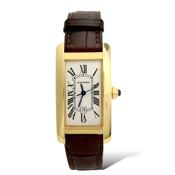 Overview An iconic, timeless, and stunning Cartier Tank Americaine in solid 18K yellow gold on...