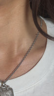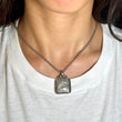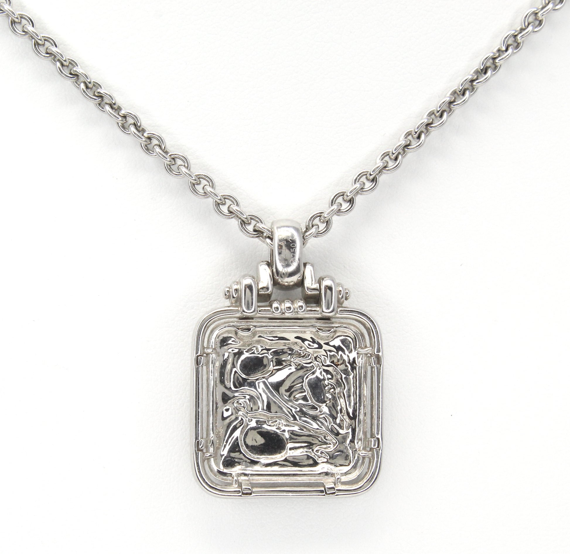 Carrera Y Carrera 18K white gold pendant necklace featuring a rectangular plaque pendant with sculpted relief detail and a substantial hinged bail, suspended from a solid cable chain. The piece weighs 24.6 grams and measures 33.6 mm by 22.9 mm, offering a bold, polished look suitable for everyday wear or layering.