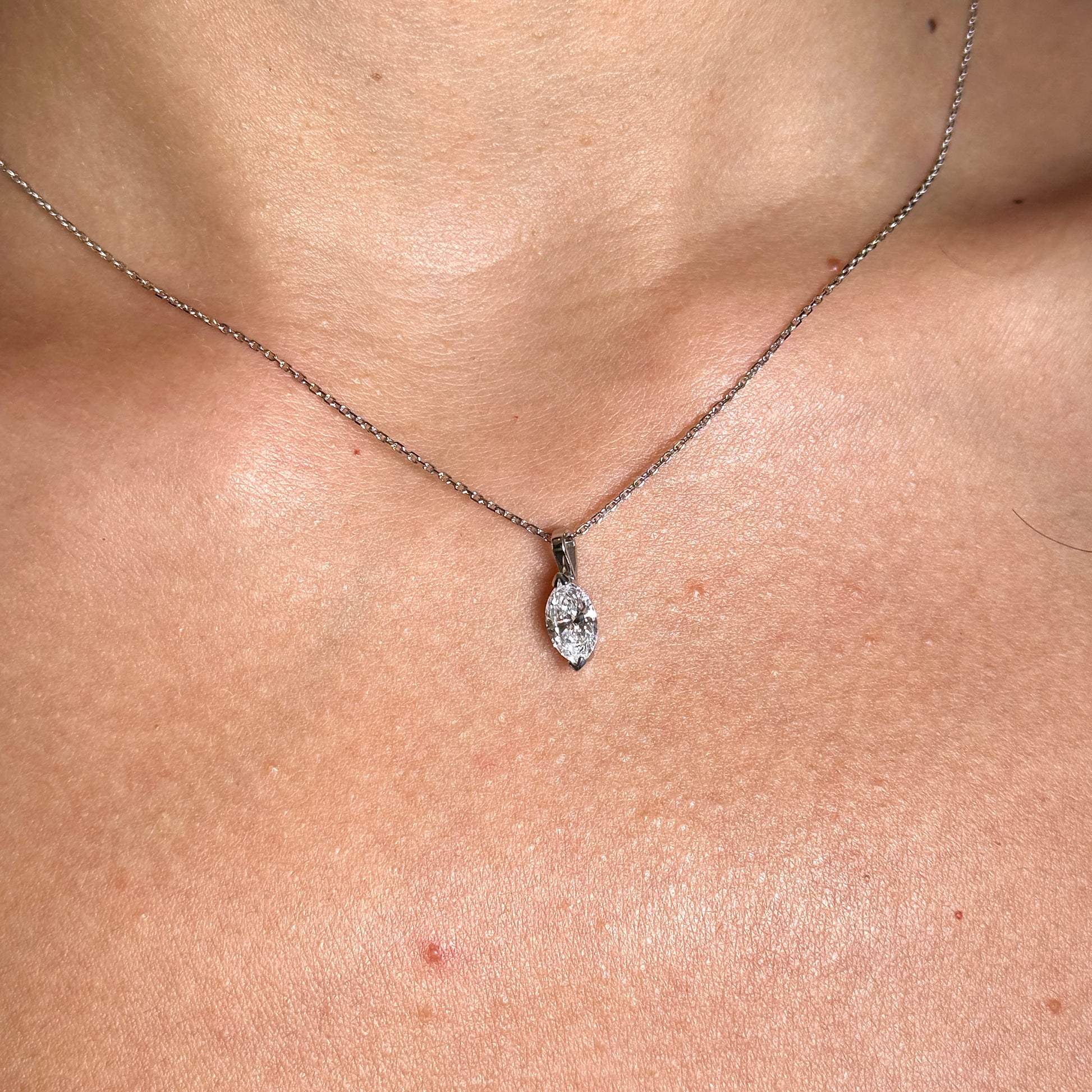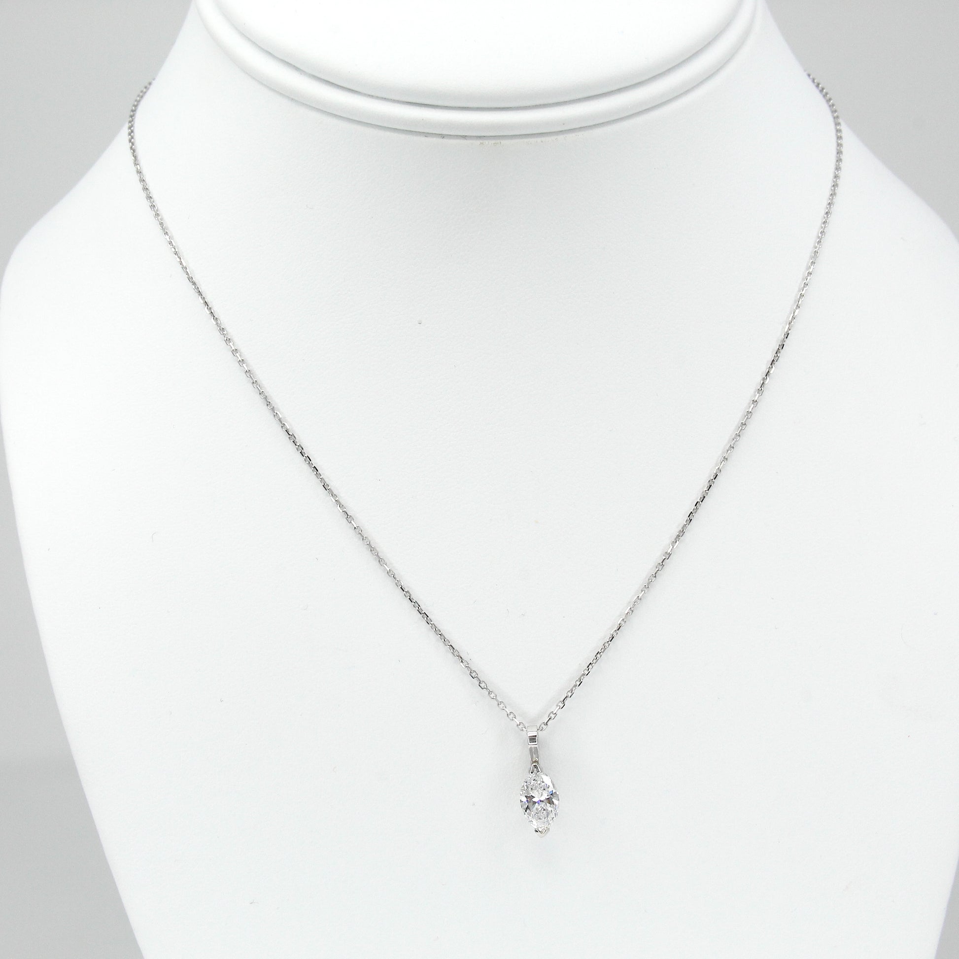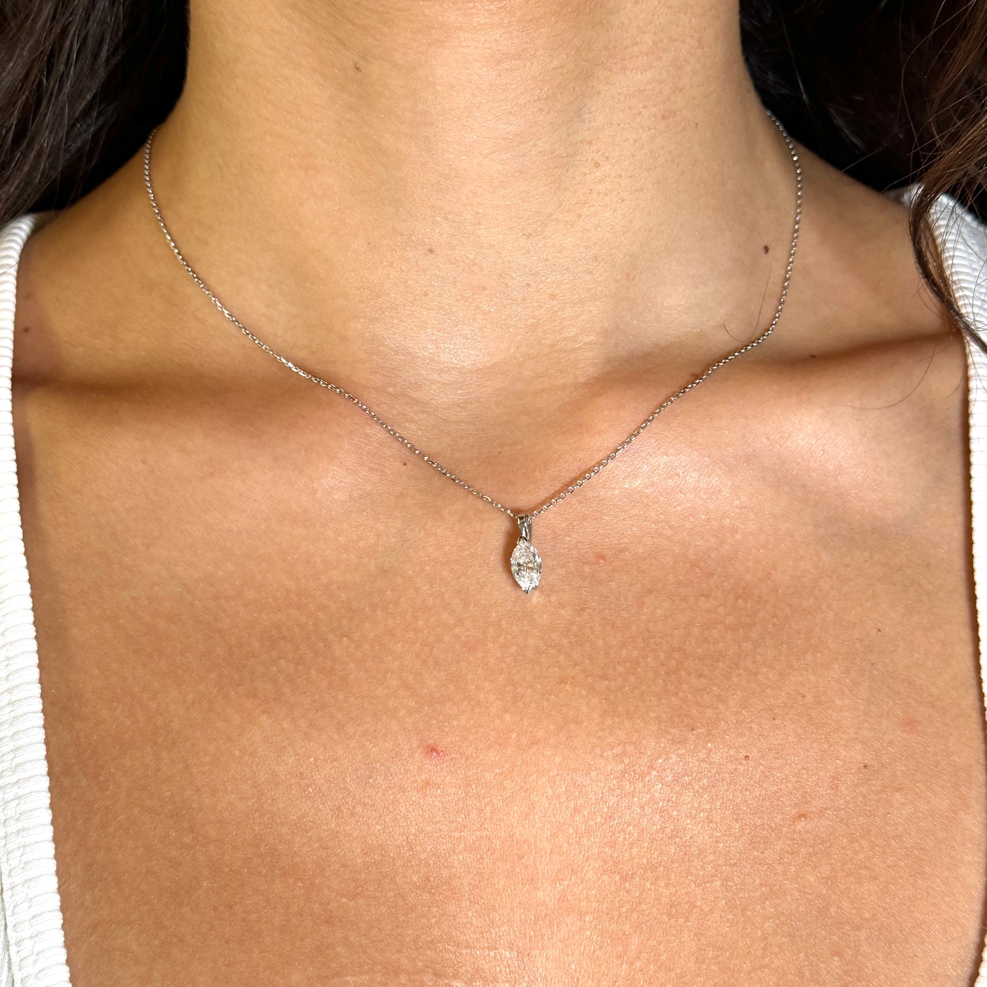 Timeless 14K white gold solitaire pendant necklace featuring a 0.75 carat natural earth-mined marquise brilliant cut diamond. The diamond is graded F–G color and SI1 clarity, offering strong brilliance and a refined appearance. Pendant measures 14.3 mm in height (including loop) by 5.1 mm in width and 4.2 mm in thickness. Includes a 17-inch 14K white gold chain.