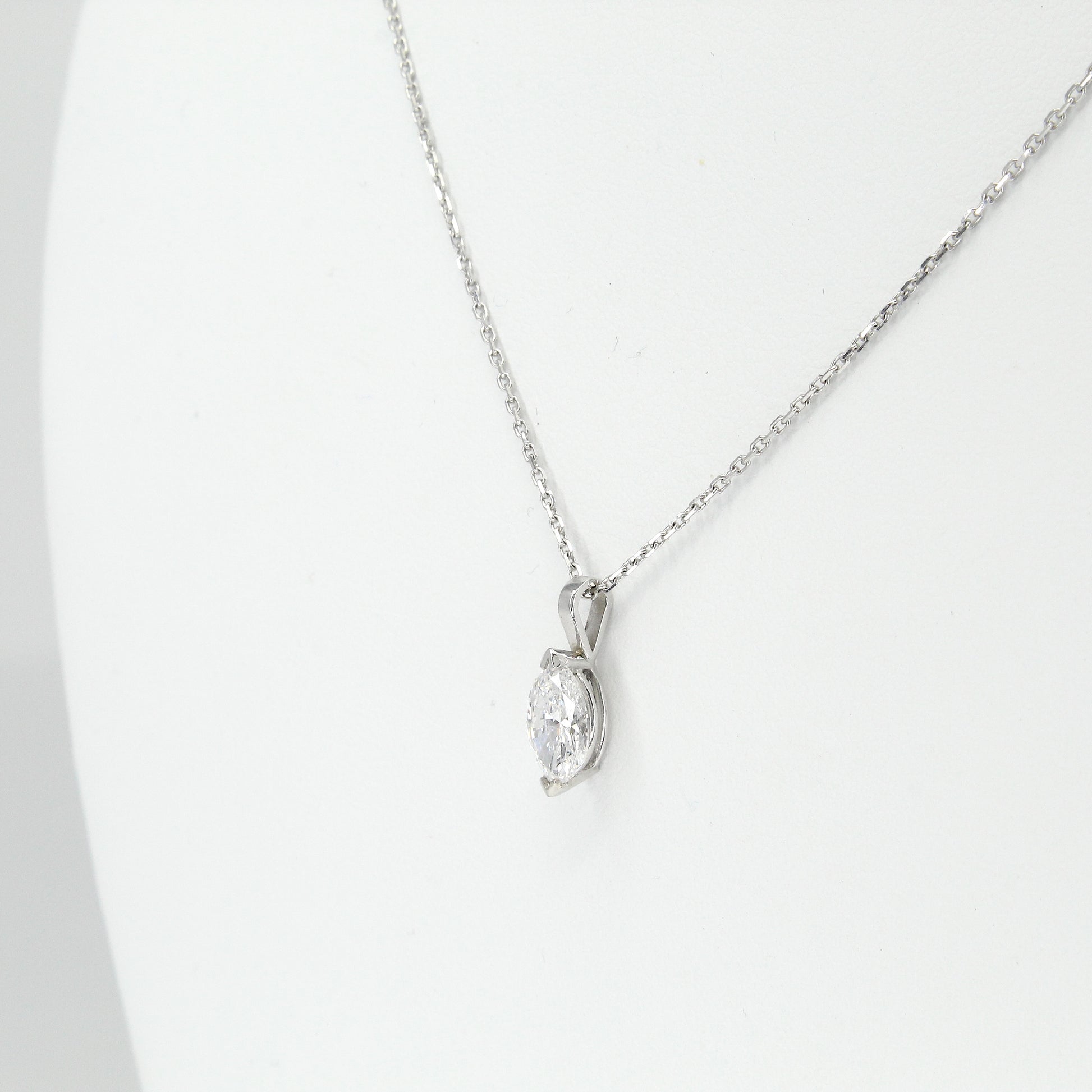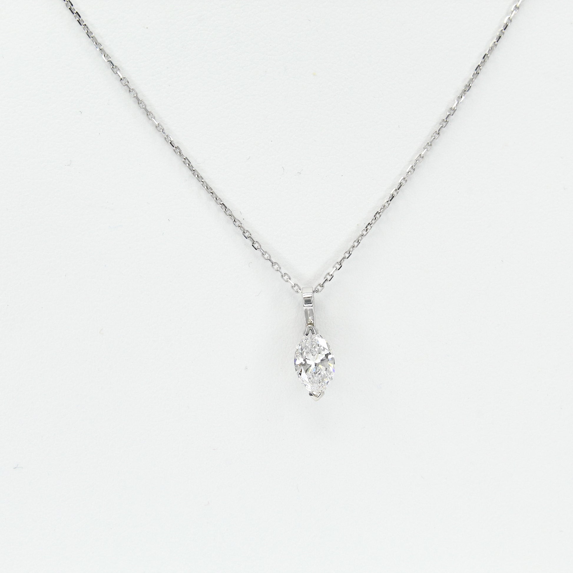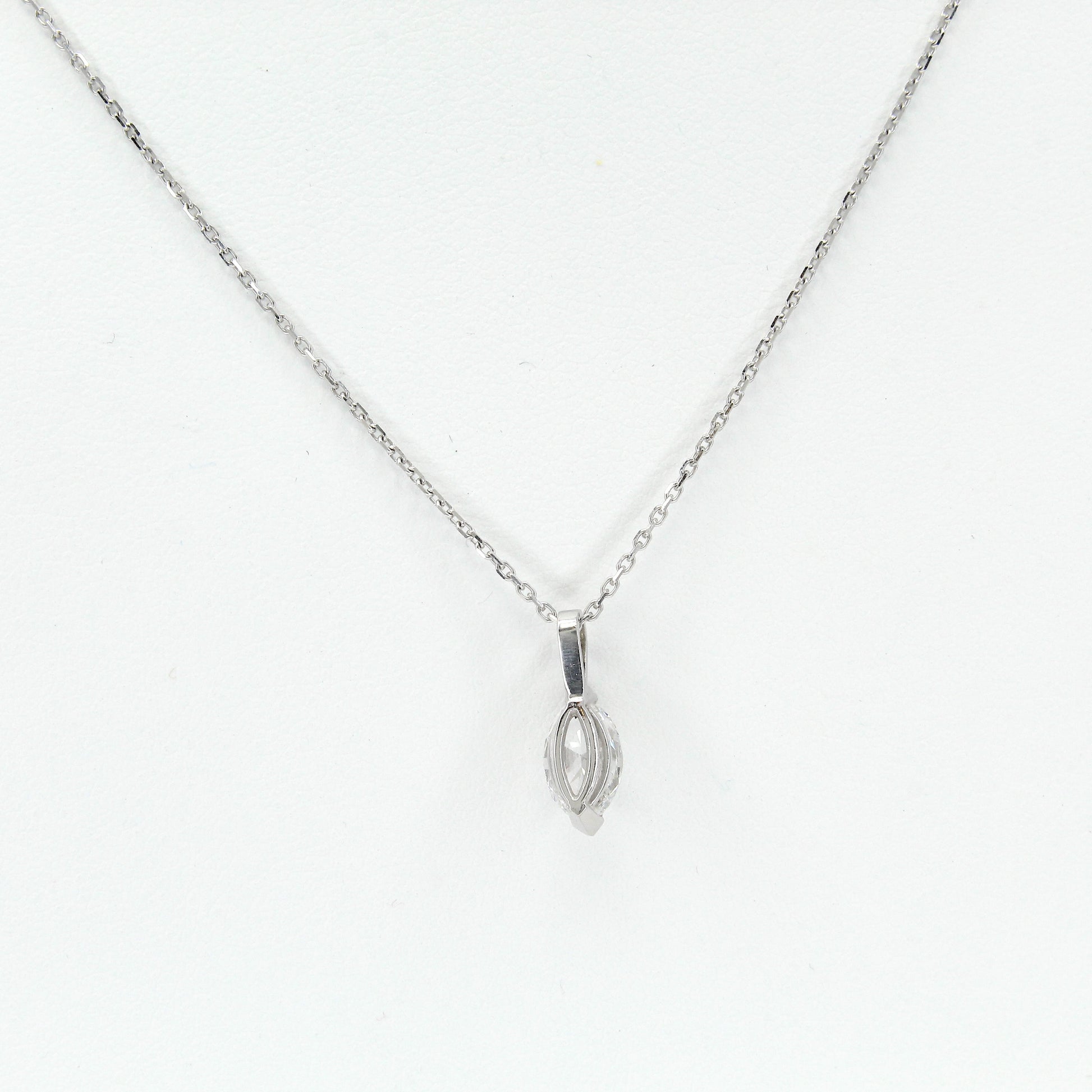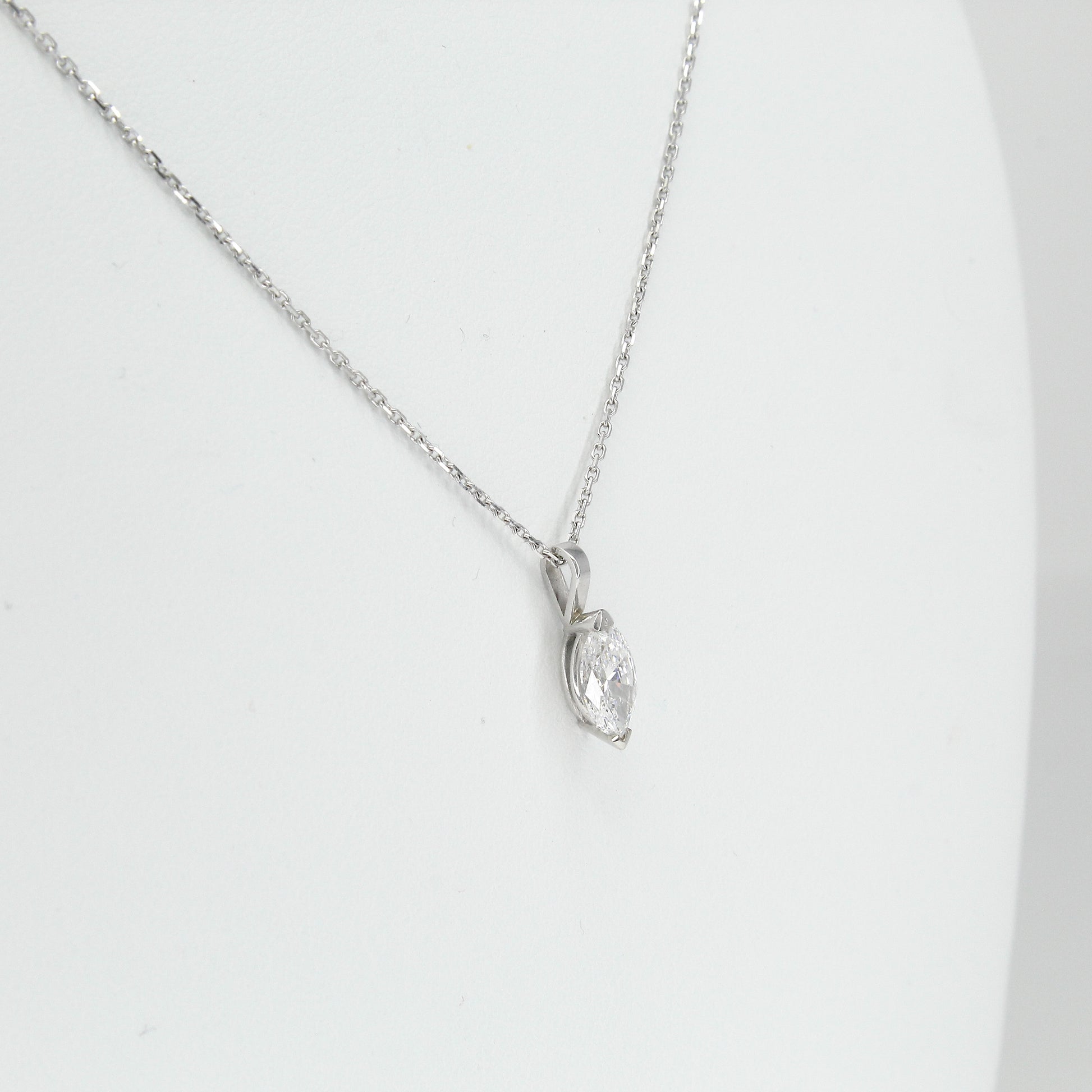 Timeless 14K white gold solitaire pendant necklace featuring a 0.75 carat natural earth-mined marquise brilliant cut diamond. The diamond is graded F–G color and SI1 clarity, offering strong brilliance and a refined appearance. Pendant measures 14.3 mm in height (including loop) by 5.1 mm in width and 4.2 mm in thickness. Includes a 17-inch 14K white gold chain.