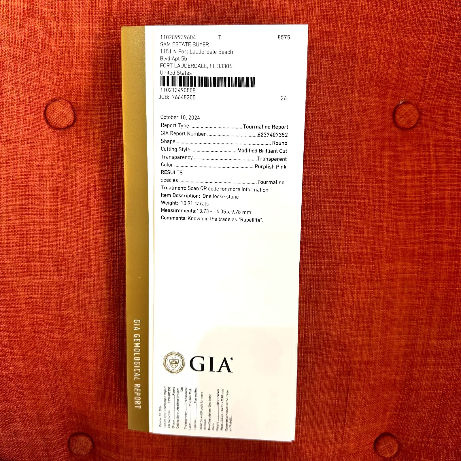 GIA Certified 10.91 CT Pink Tourmaline Platinum Natural Diamond 0.20 CT Ring