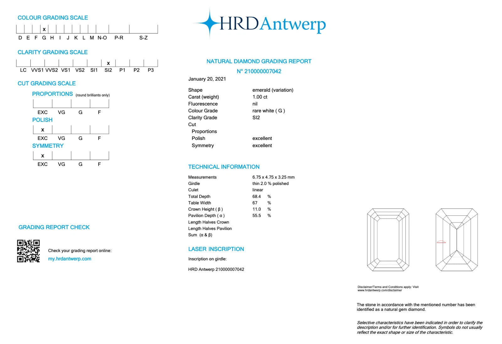 One emerald cut diamond is GIA certified, the other is HRD certified. Both have the same Clarity and Color Grade based on the respected certification and both are laser inscribed. We do not have a physical copy of the HRD certificate.