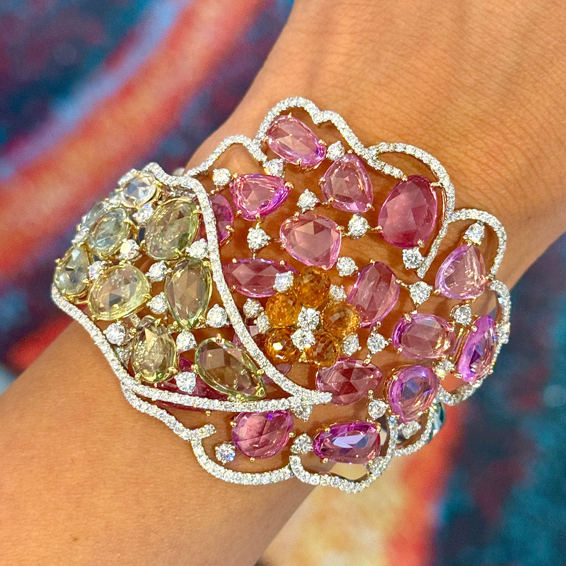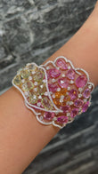 This luxurious cuff bracelet weighs 49 grams and showcases approximately 5 to 6 carats of natural diamonds, 20 to 24 carats of pink sapphires, 14 to 15 carats of green sapphires, and 4 to 5 carats of orange briolette sapphires. The intricate design and vivid gemstone colors make it a striking statement piece for special occasions or a standout addition to a fine jewelry collection.