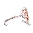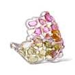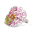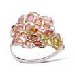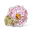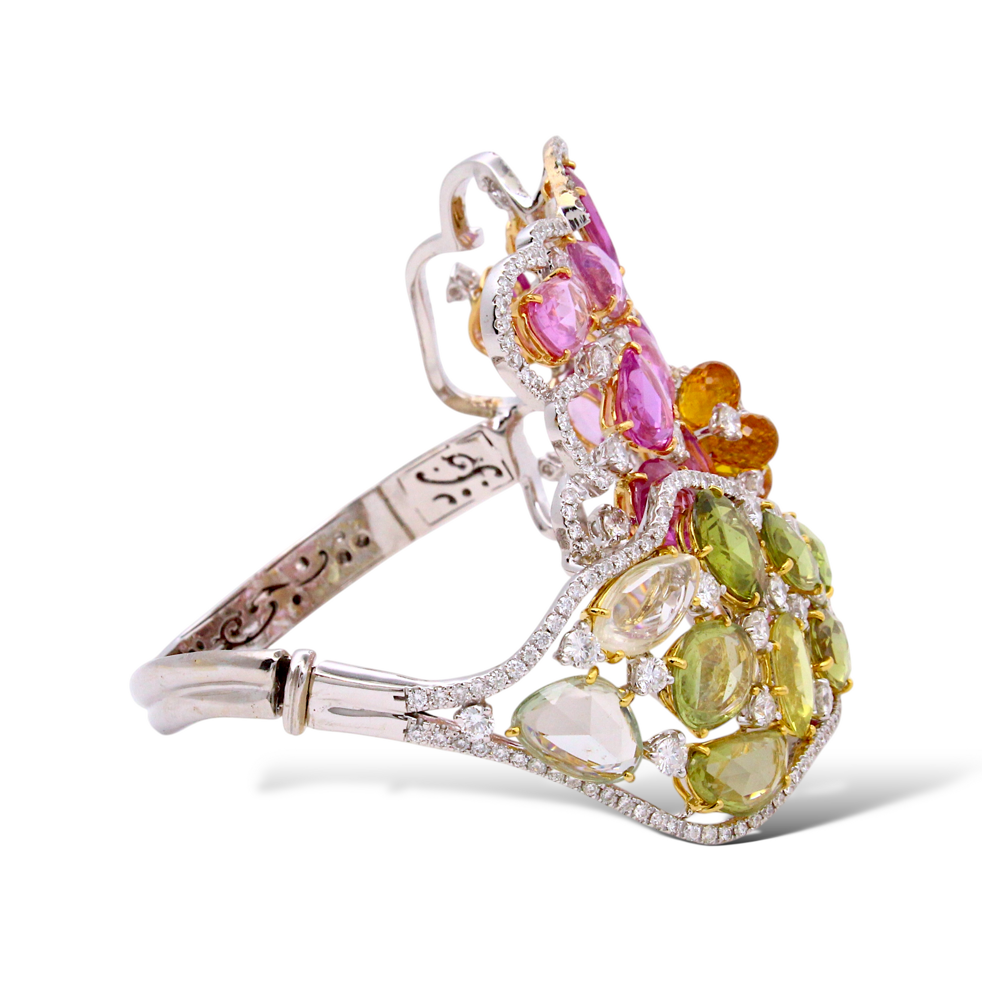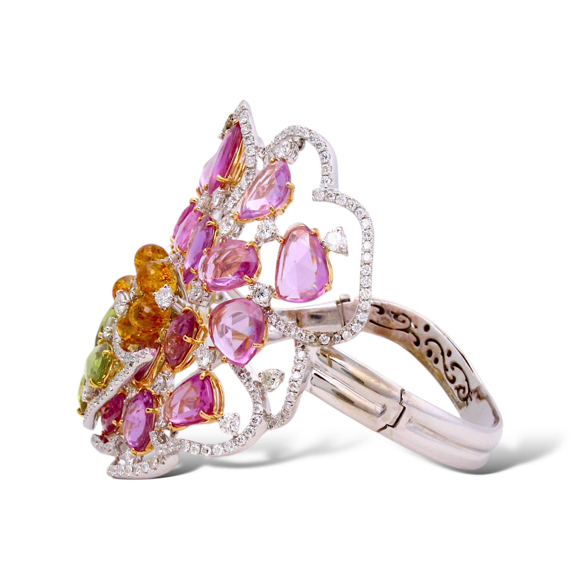 Exquisite openwork cuff bracelet crafted in 18K white gold and adorned with an elaborate floral-inspired arrangement of multi-colored natural sapphires and shimmering round brilliant cut diamonds. The pink sapphires form a soft petal-like motif, while the green sapphires create a fresh, leafy contrast. A cluster of orange briolette sapphires sits at the center, surrounded by bright white diamonds that add brilliance to the design. The open lattice construction gives the piece a light, airy elegance while maintaining substantial presence on the wrist.