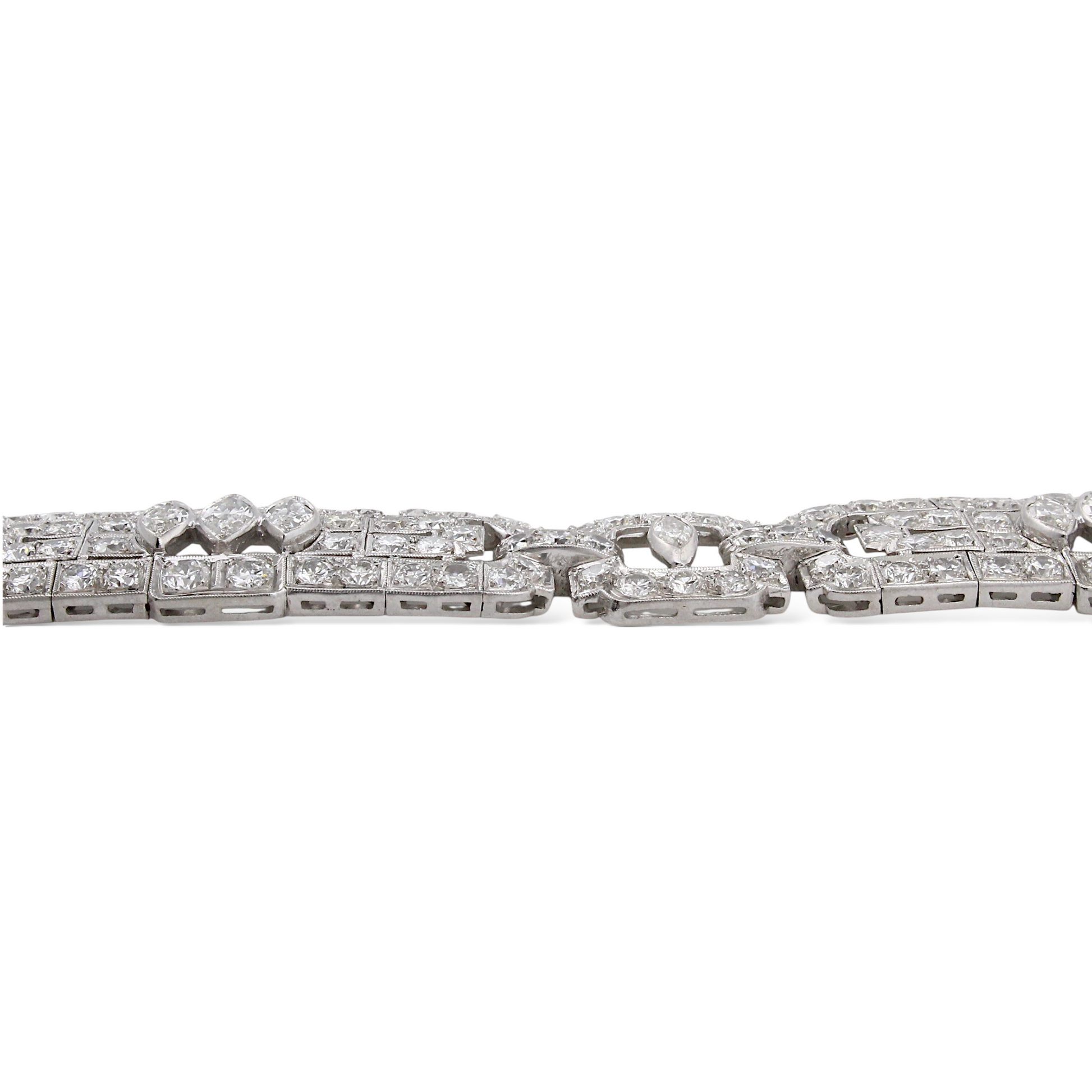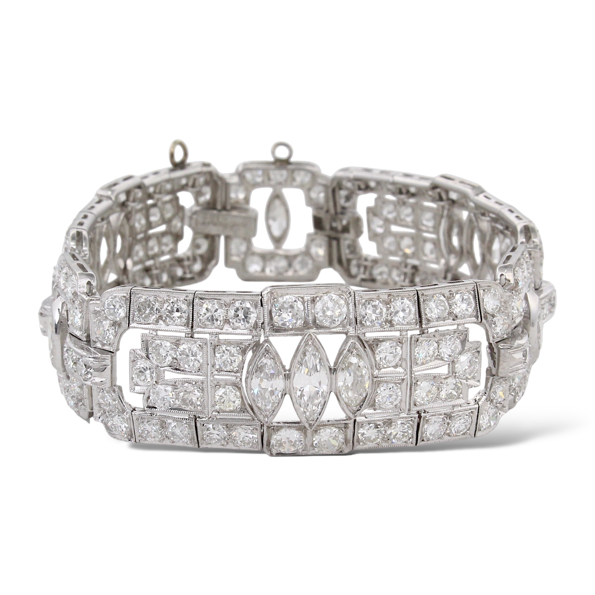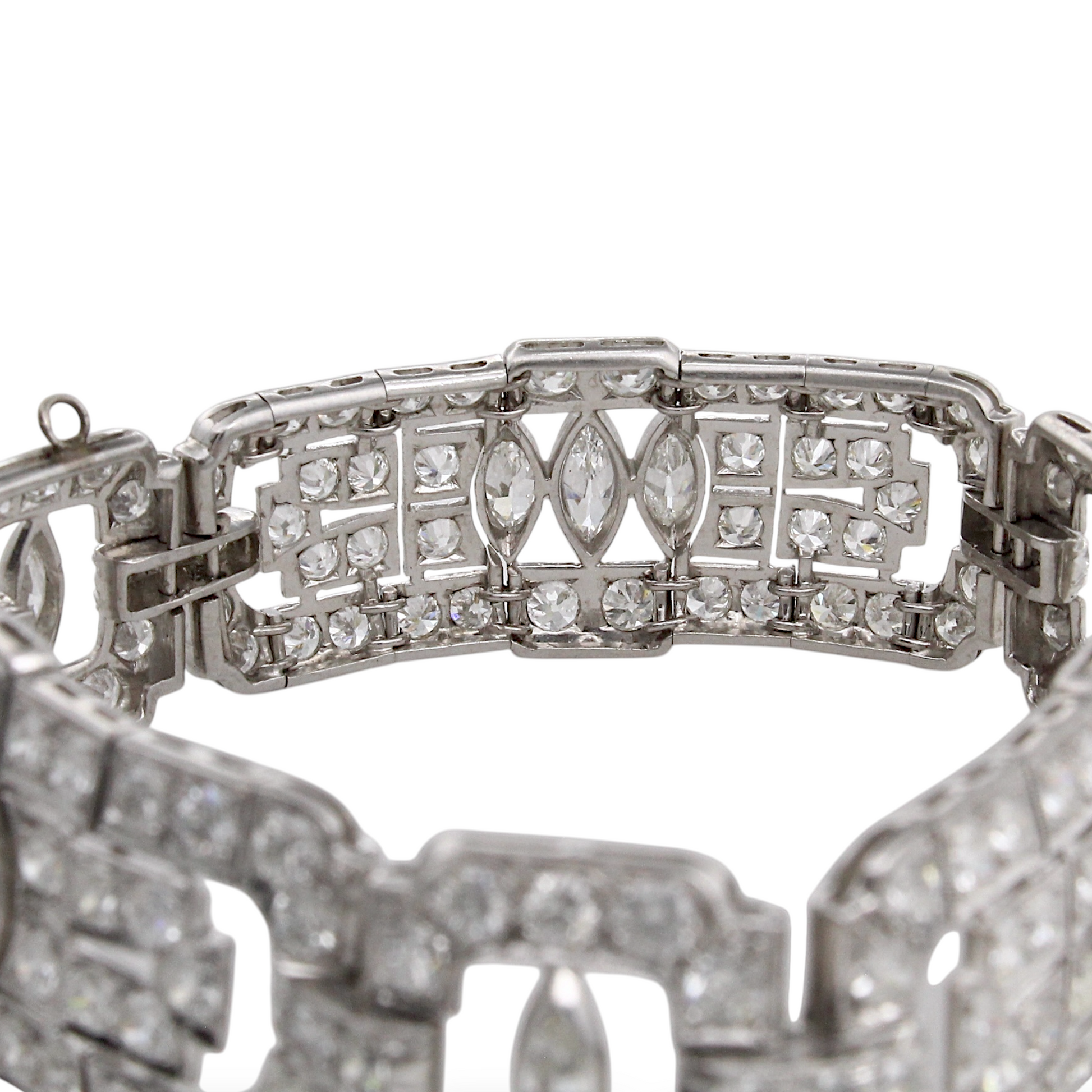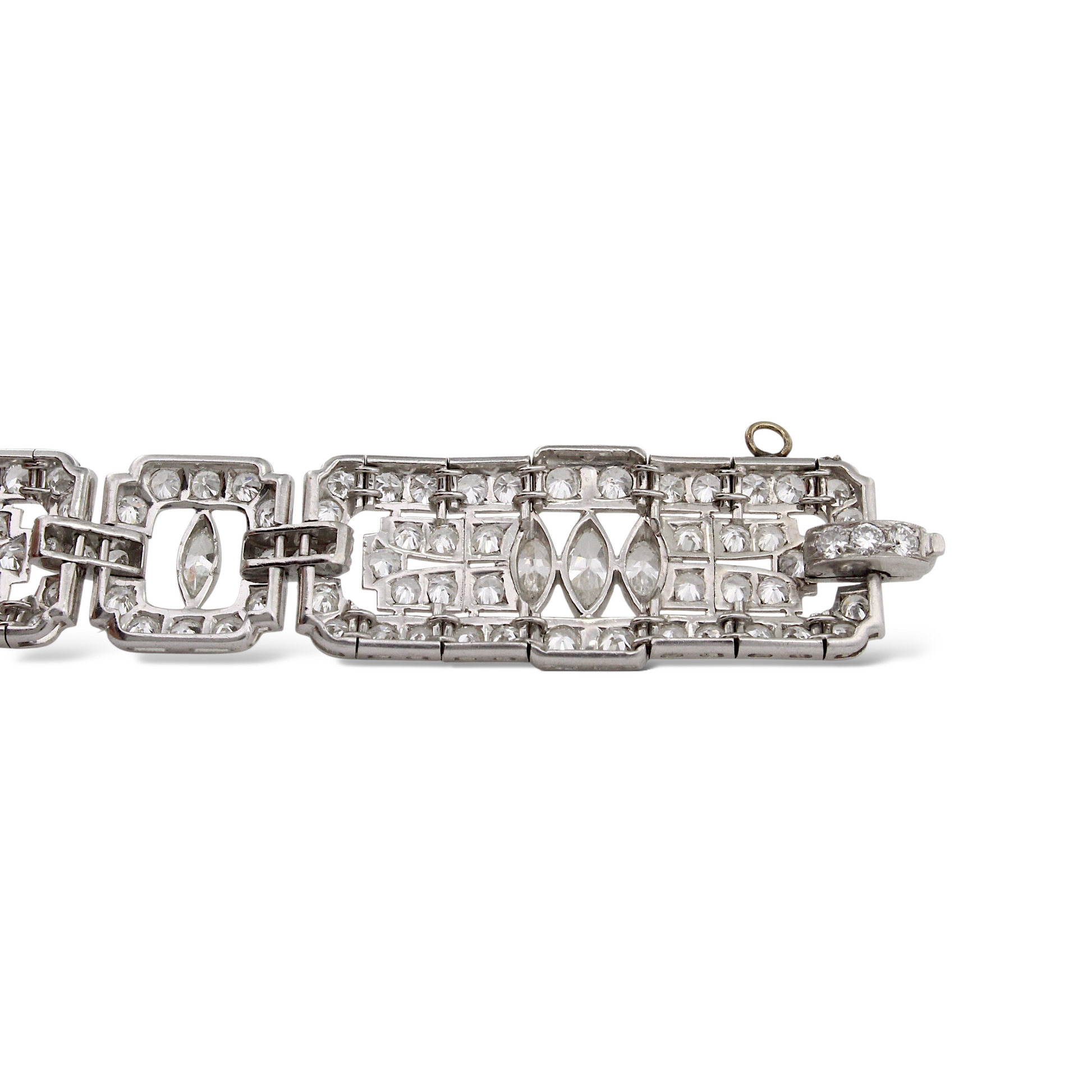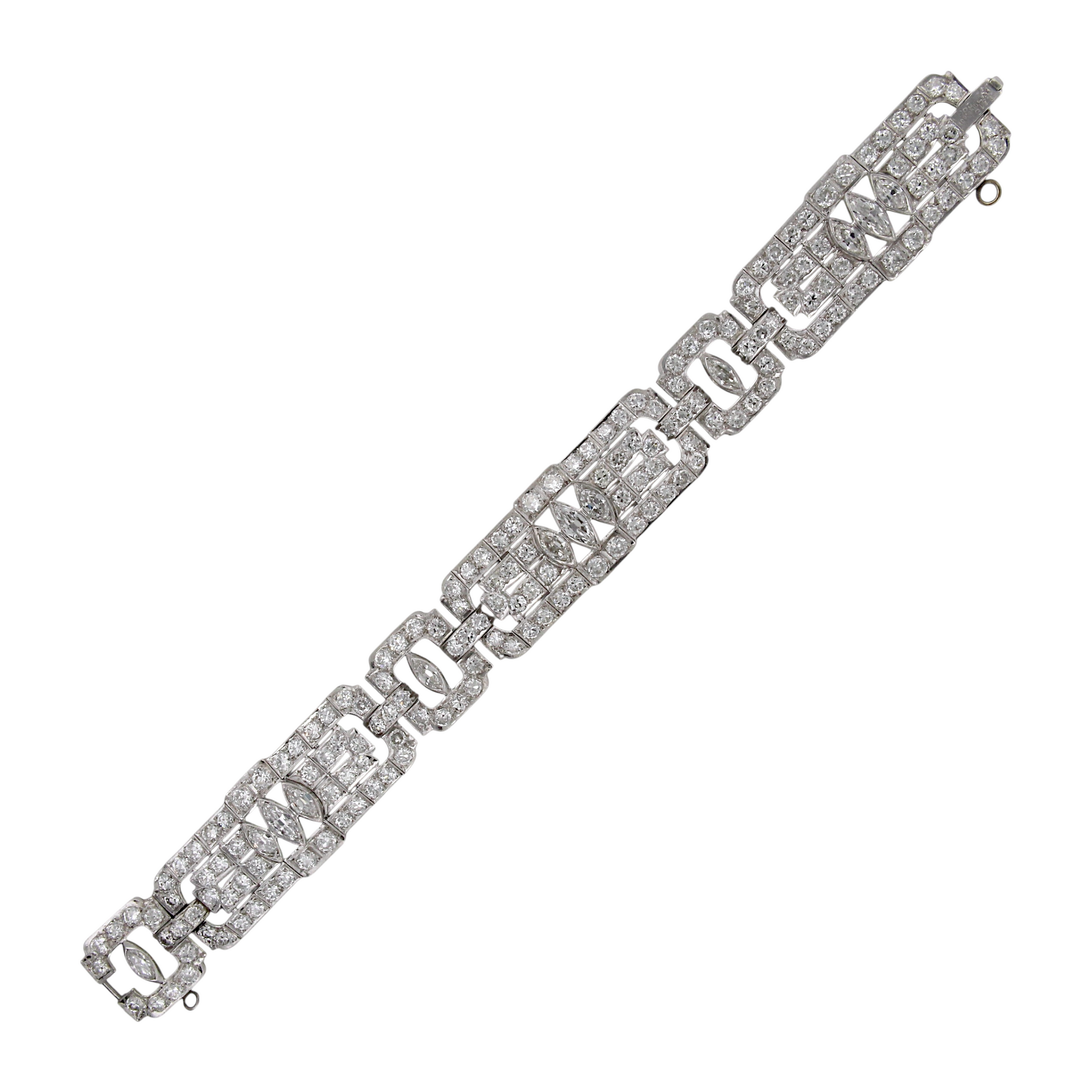 This exquisite Art Deco platinum bracelet dates to the 1920s and showcases the remarkable craftsmanship of the period. Set with approximately 19–20 carats of natural earth-mined diamonds, the bracelet features a combination of Old European cut and marquise cut stones arranged in bold geometric motifs characteristic of the era. The diamonds display white color and VS–SI1 clarity, offering exceptional brilliance throughout the bracelet’s intricate design. Measuring 7 inches in length, this piece embodies the elegance and architectural symmetry that define authentic Art Deco jewelry.