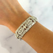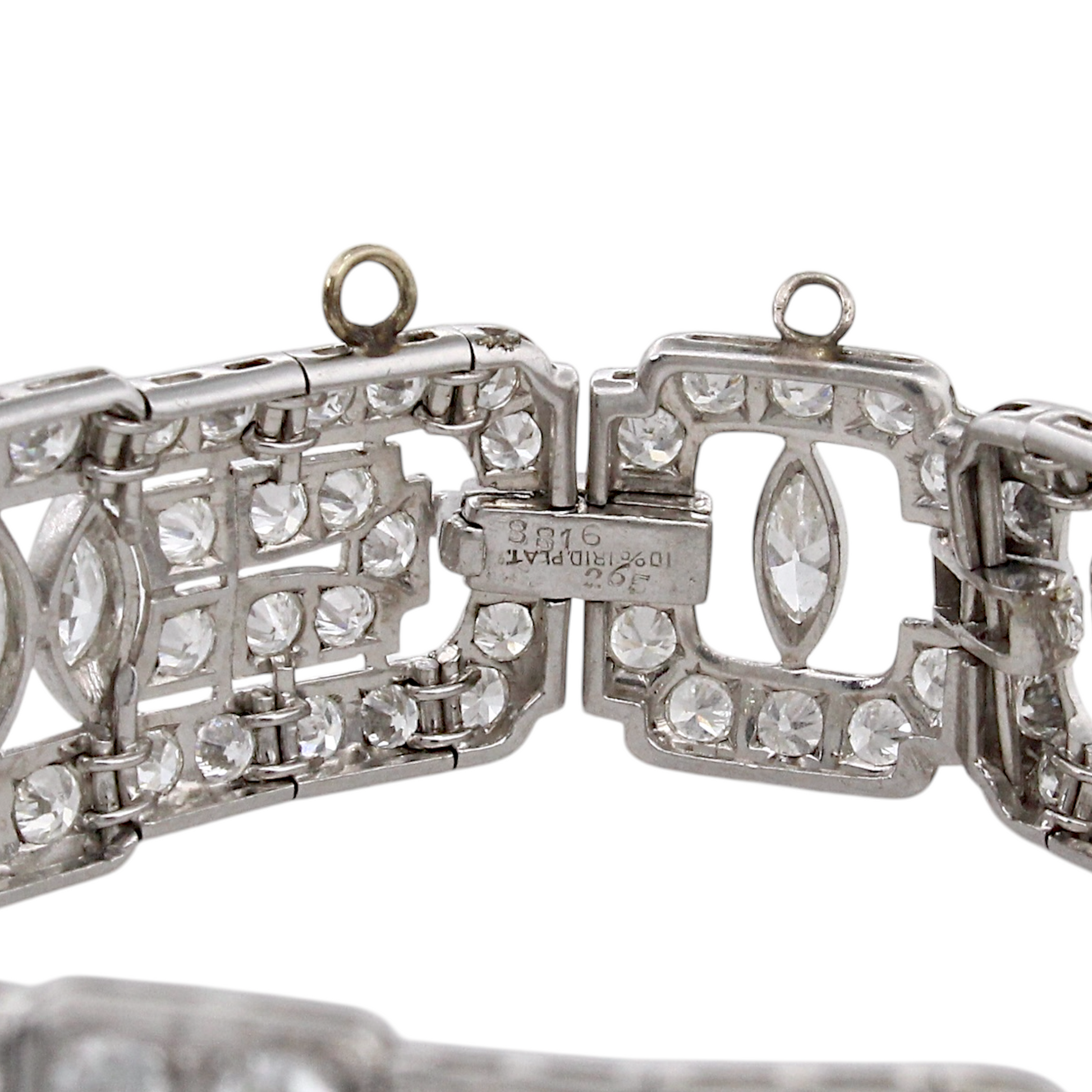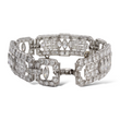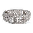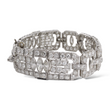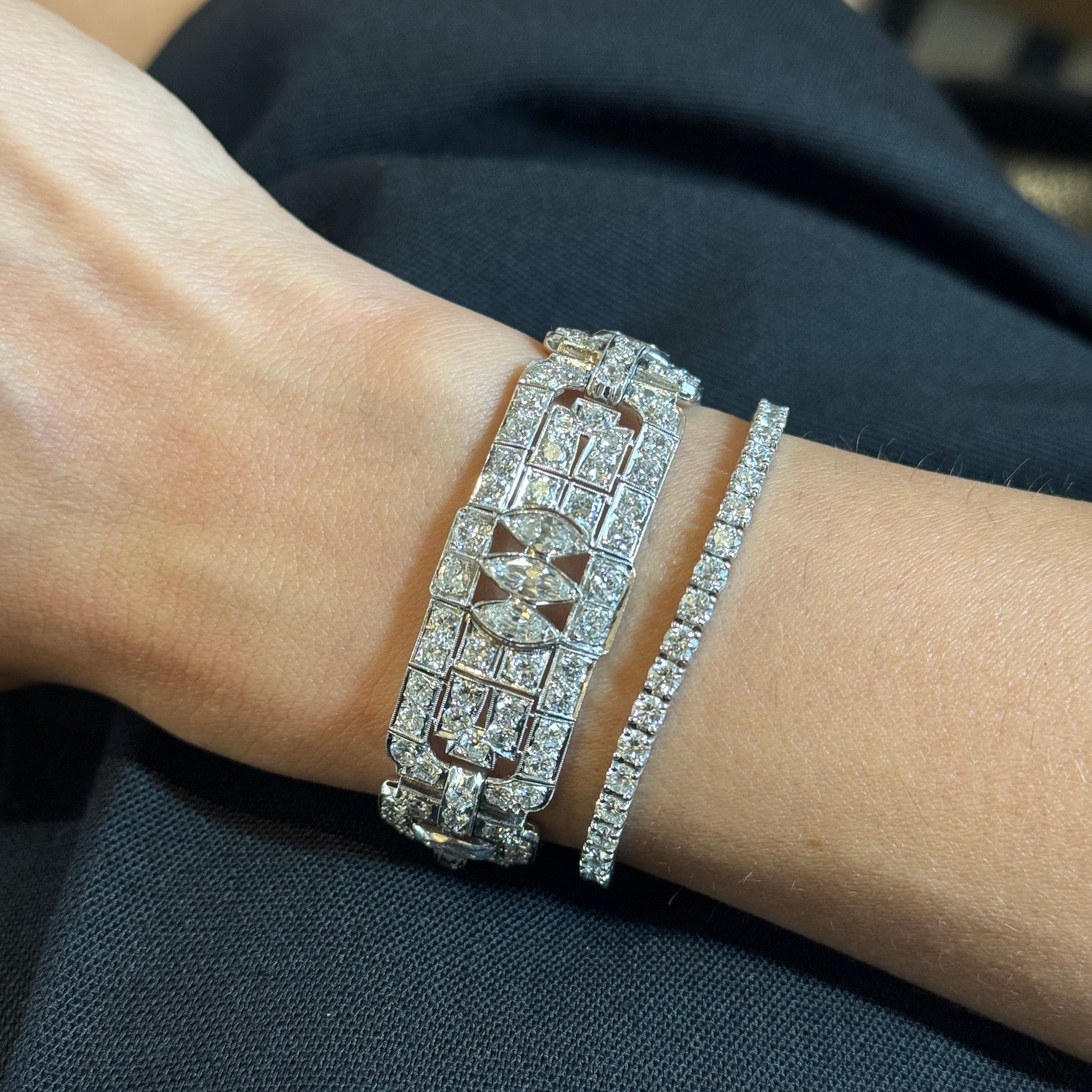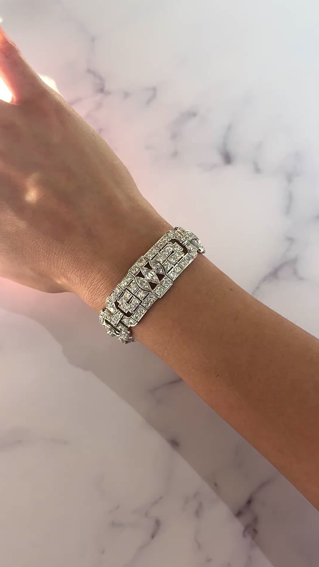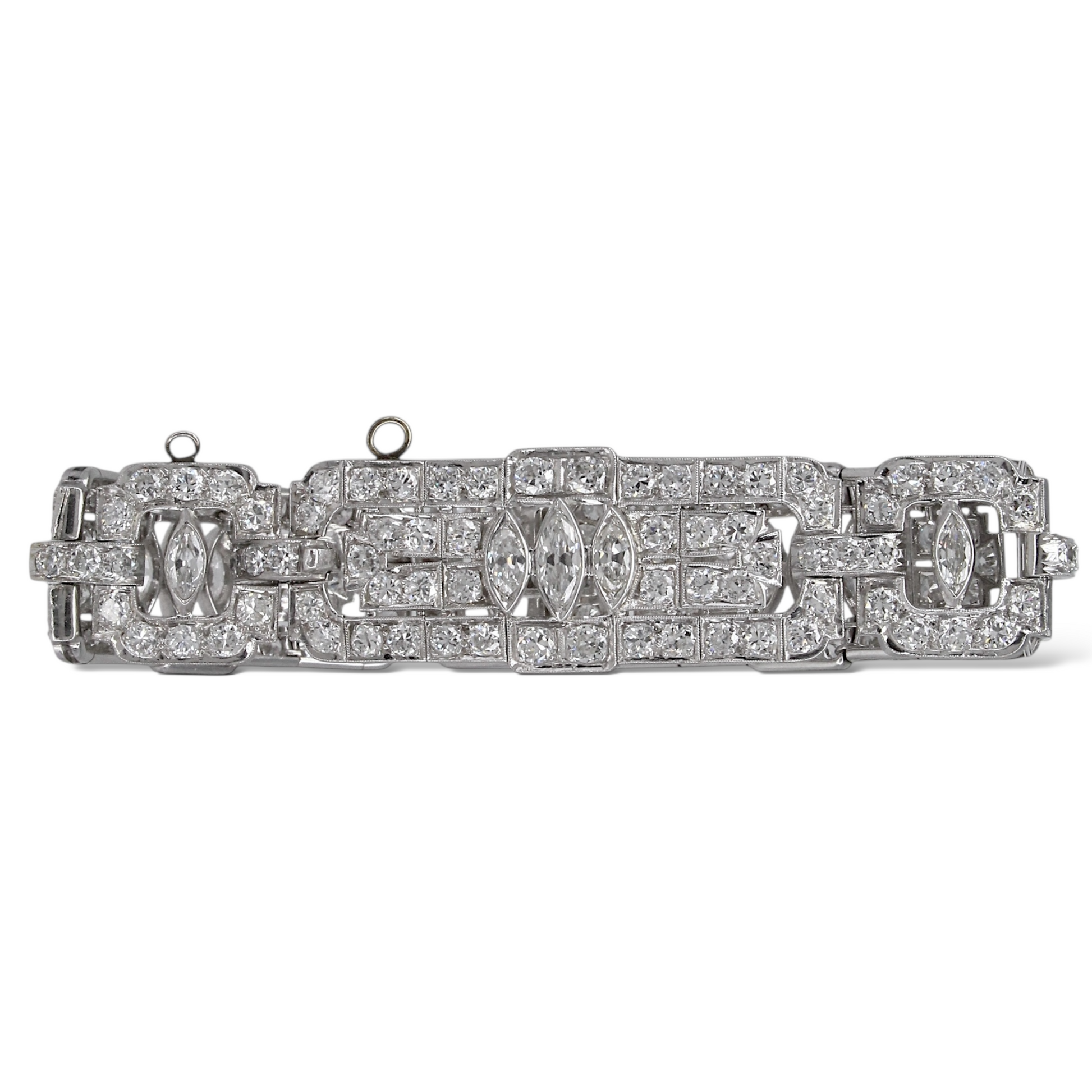 This exquisite Art Deco platinum bracelet dates to the 1920s and showcases the remarkable craftsmanship of the period. Set with approximately 19–20 carats of natural earth-mined diamonds, the bracelet features a combination of Old European cut and marquise cut stones arranged in bold geometric motifs characteristic of the era. The diamonds display white color and VS–SI1 clarity, offering exceptional brilliance throughout the bracelet’s intricate design. Measuring 7 inches in length, this piece embodies the elegance and architectural symmetry that define authentic Art Deco jewelry.