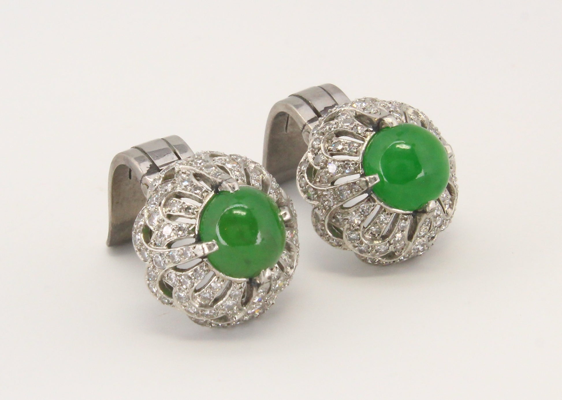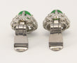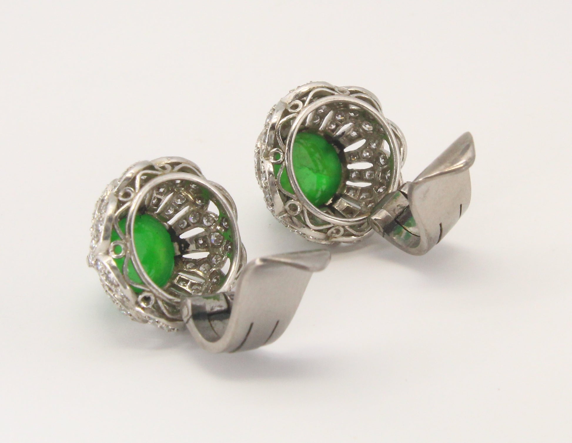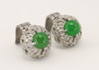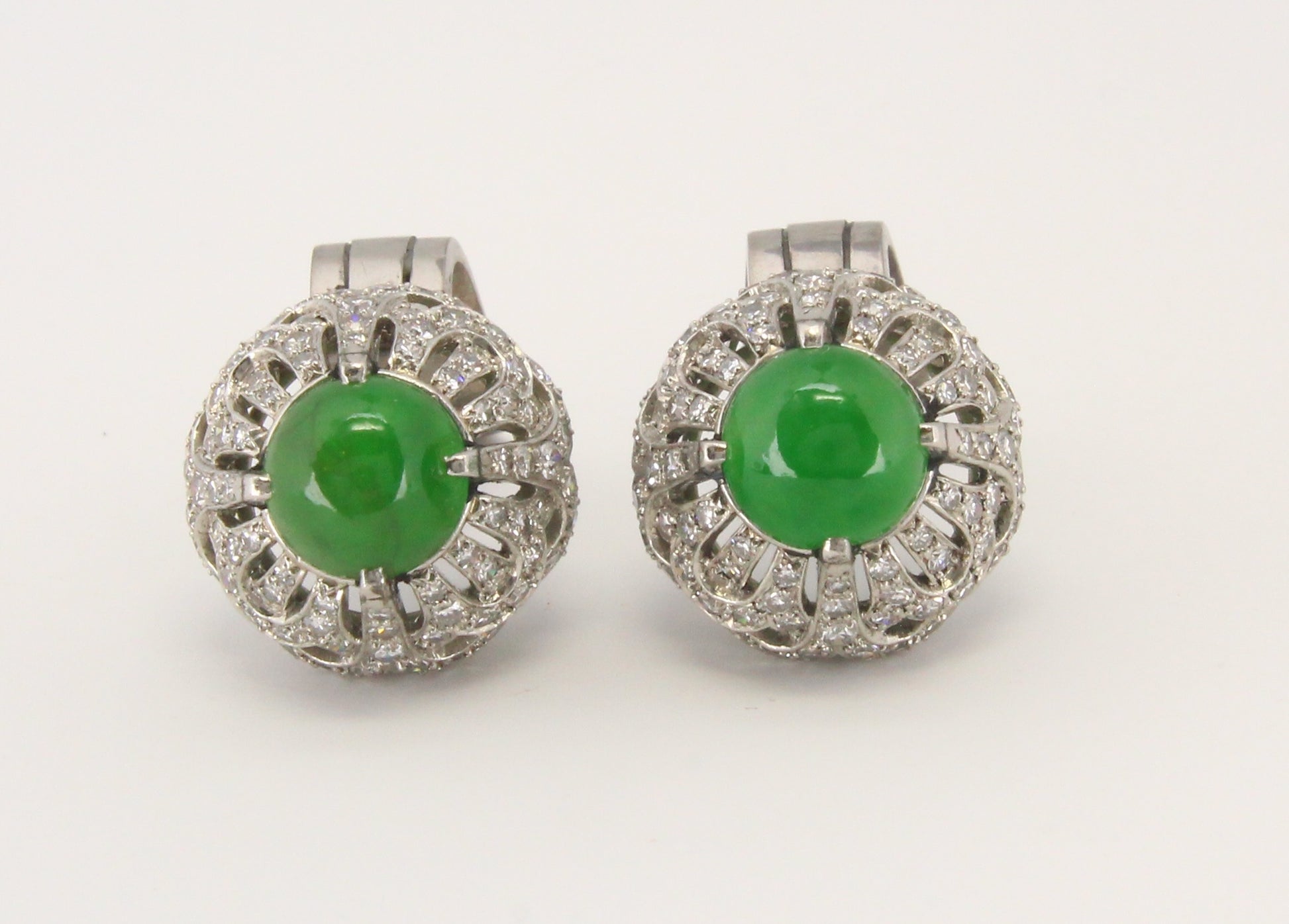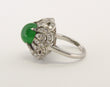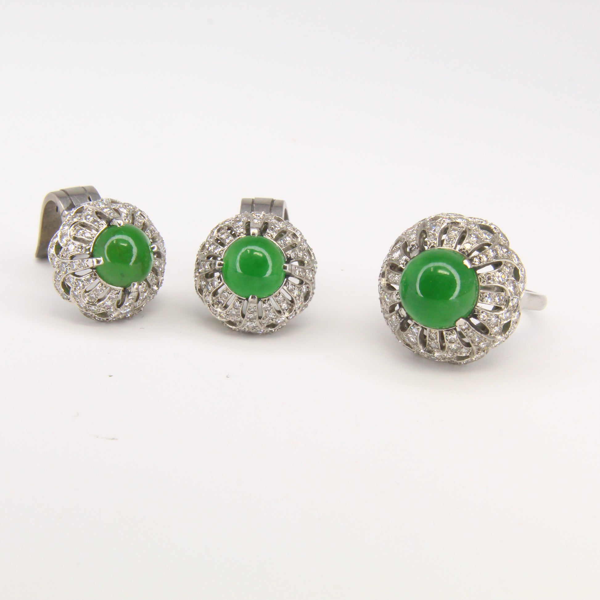 A refined platinum set featuring a ring and matching clip-on earrings adorned with mottled green round cabochon jade gemstones. The ring, sized 4, centers a jade cabochon measuring approximately 9.25 mm – 9.15 mm x 5.38 mm, weighing 8.2 grams. The clip-on earrings present complementary jade cabochons in platinum mounts with a total weight of 8.9 grams. Accented by round brilliant cut natural white diamonds, this elegant set combines classic jade artistry with luxurious platinum and diamond craftsmanship.Shipping cost is based on weight. Just add products to your cart and use the Shipping Calculator to see the shipping price.