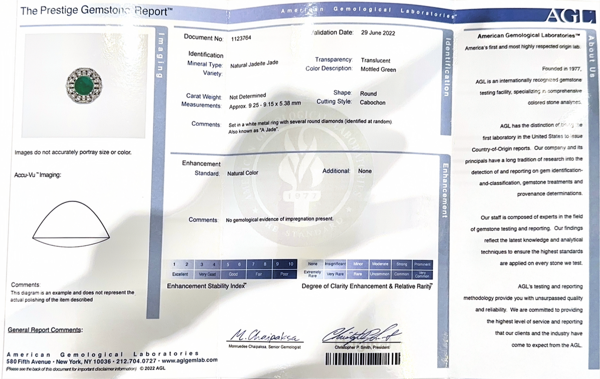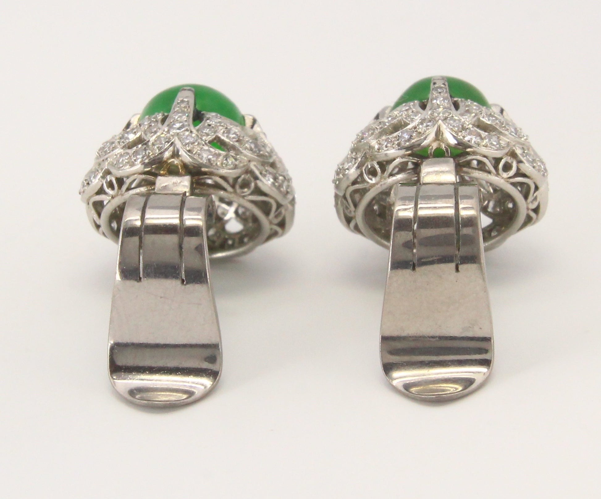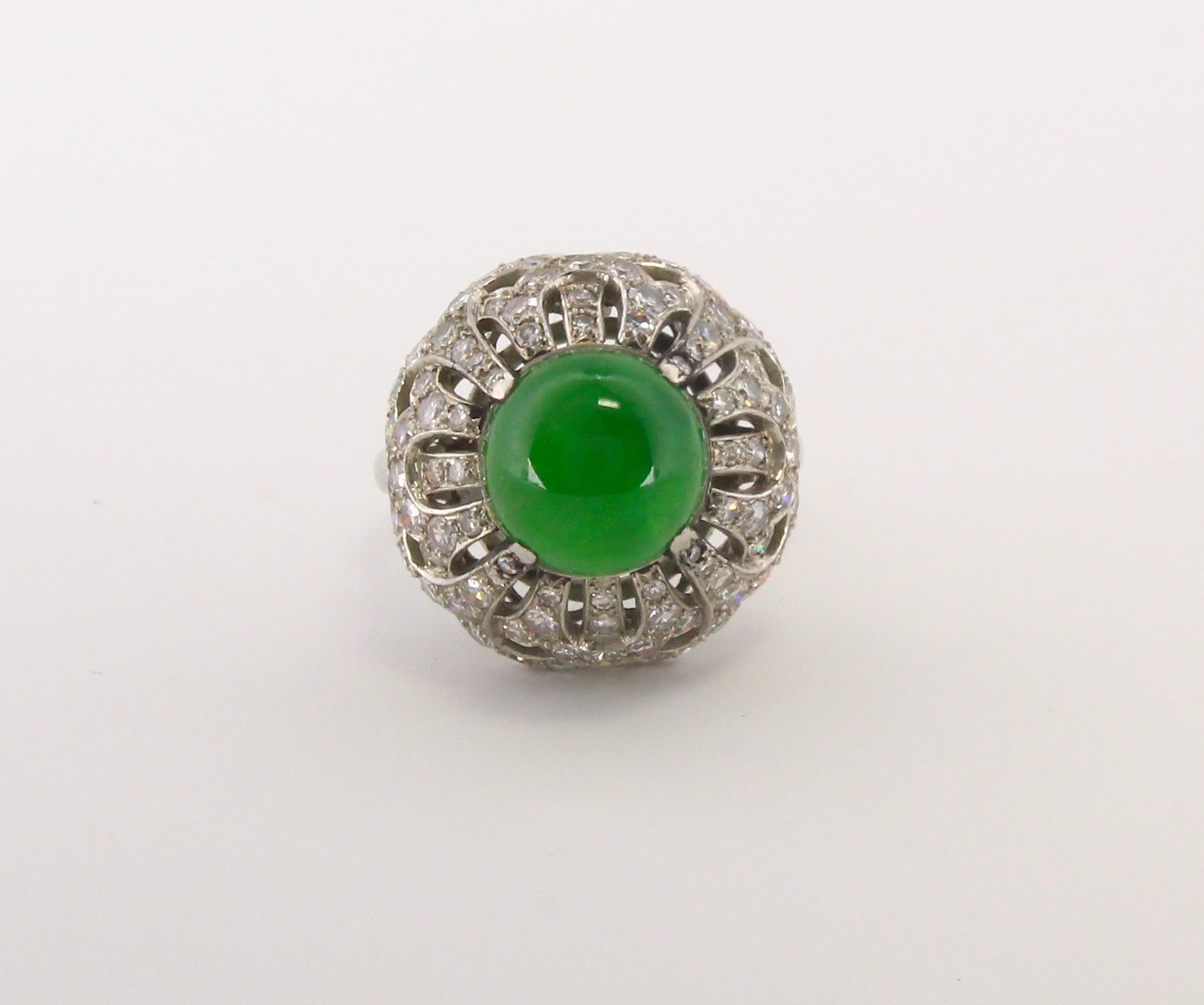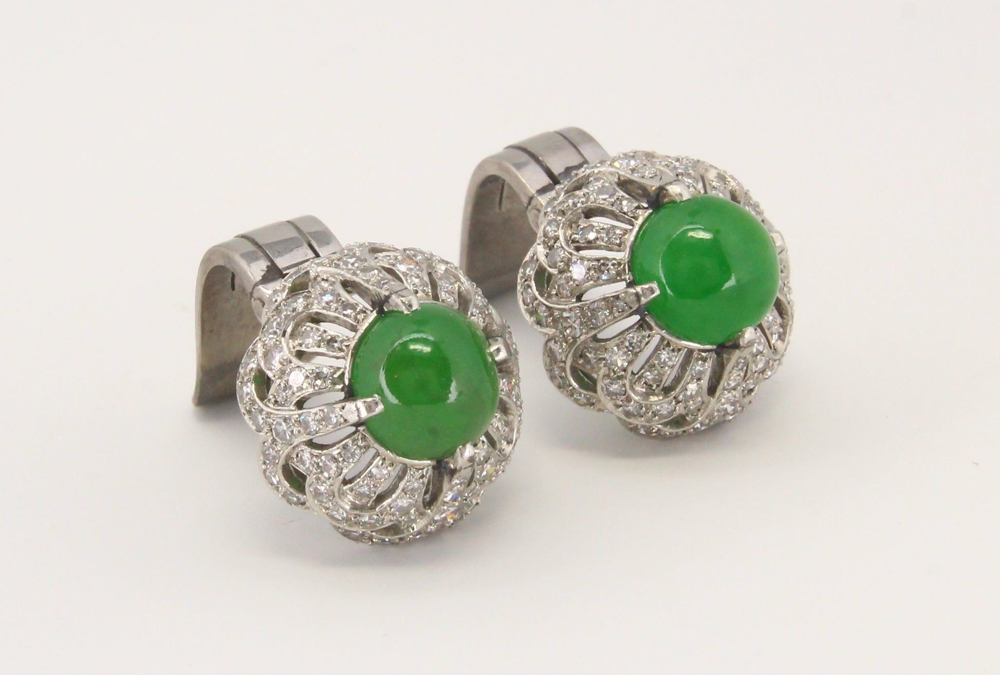 A refined platinum set featuring a ring and matching clip-on earrings adorned with mottled green round cabochon jade gemstones. The ring, sized 4, centers a jade cabochon measuring approximately 9.25 mm – 9.15 mm x 5.38 mm, weighing 8.2 grams. The clip-on earrings present complementary jade cabochons in platinum mounts with a total weight of 8.9 grams. Accented by round brilliant cut natural white diamonds, this elegant set combines classic jade artistry with luxurious platinum and diamond craftsmanship.Shipping cost is based on weight. Just add products to your cart and use the Shipping Calculator to see the shipping price.