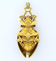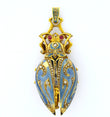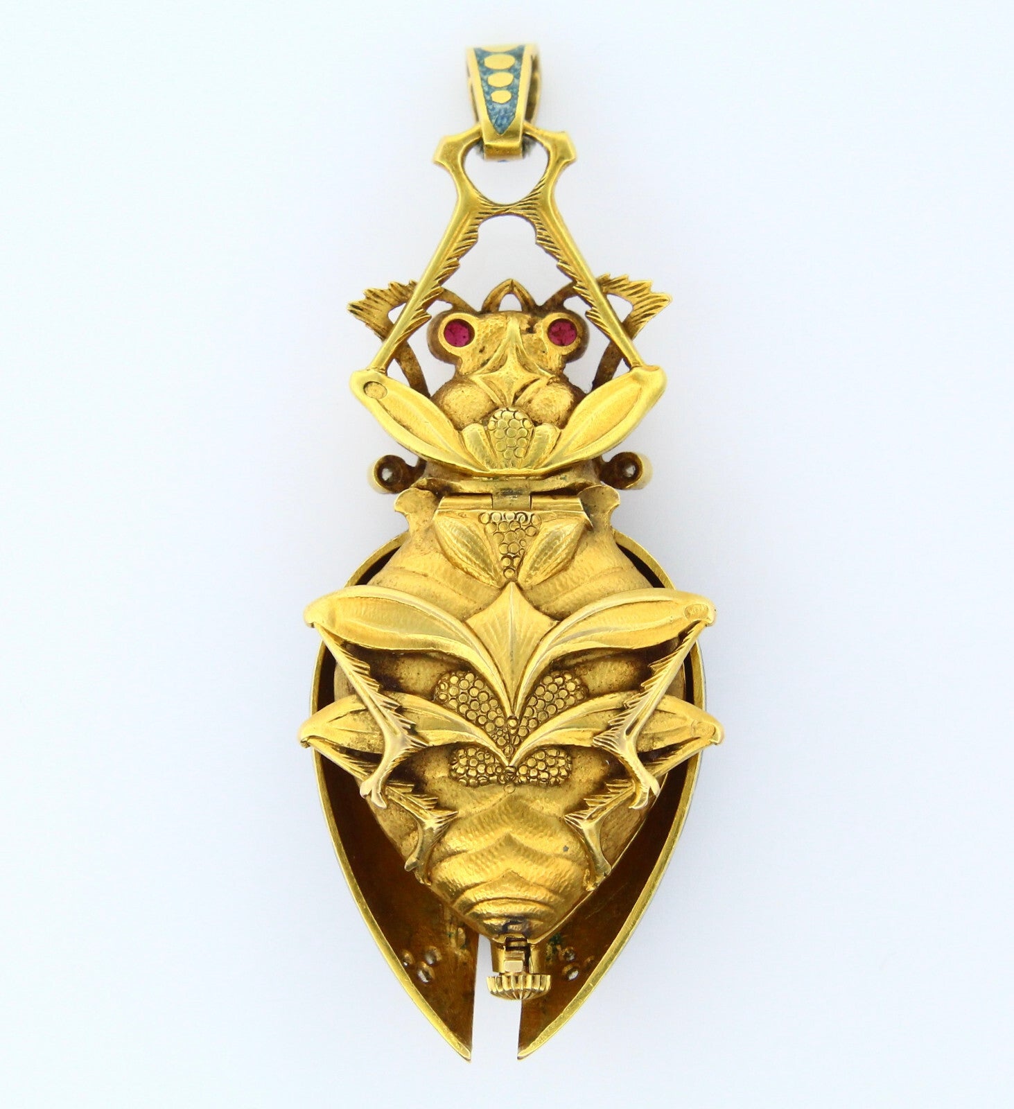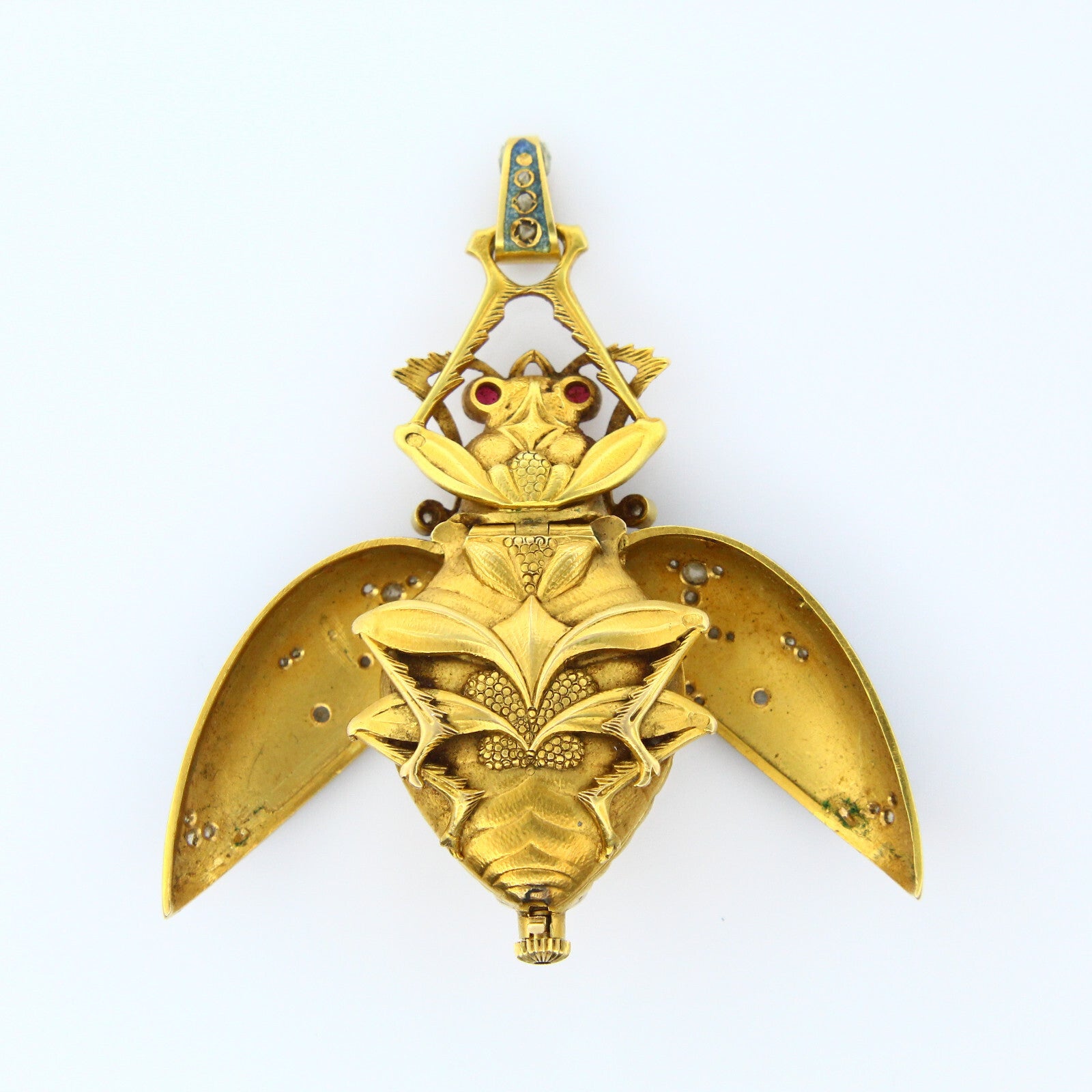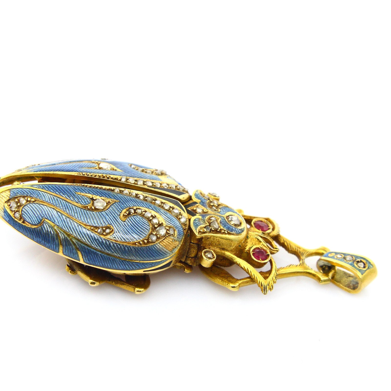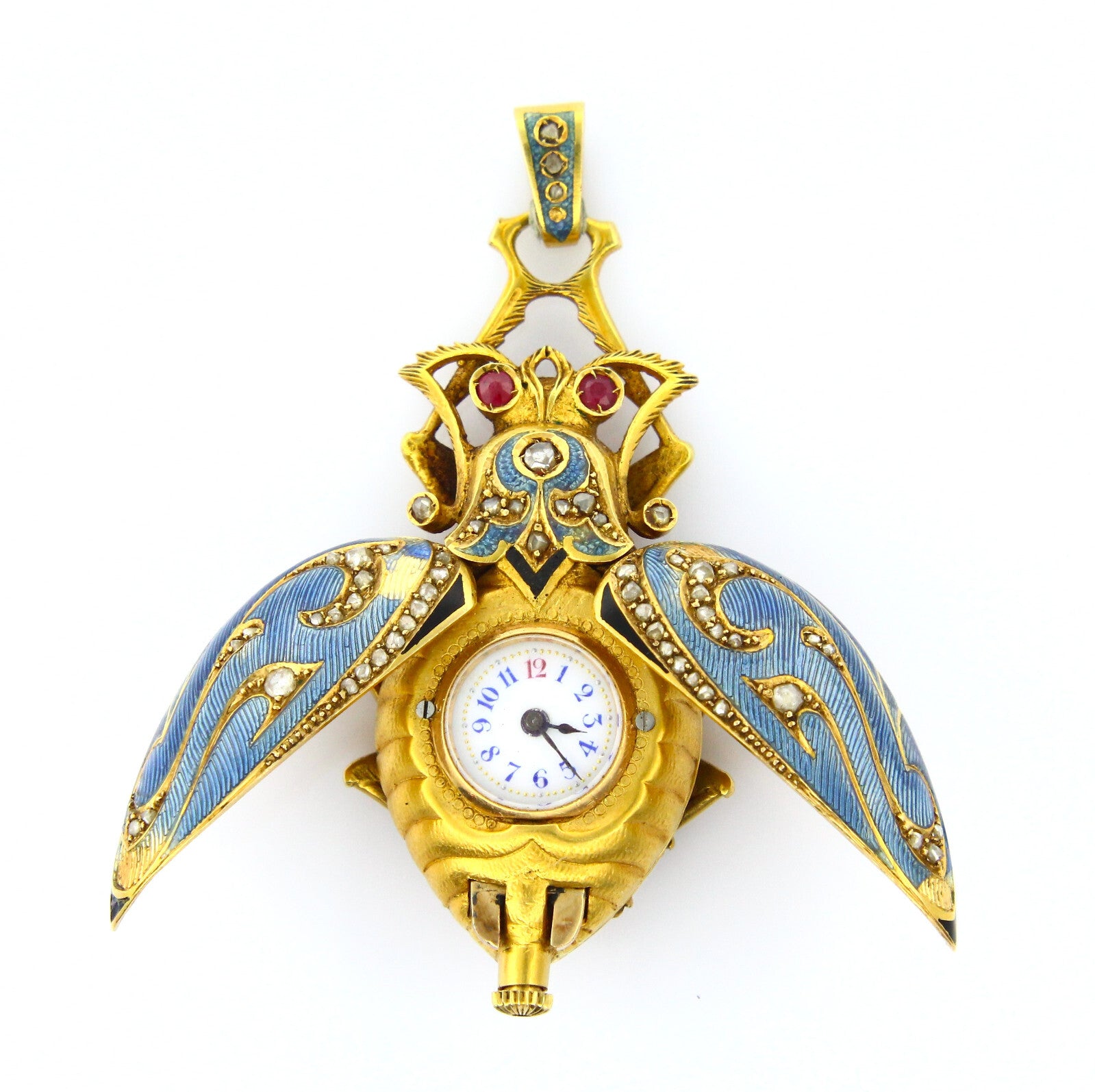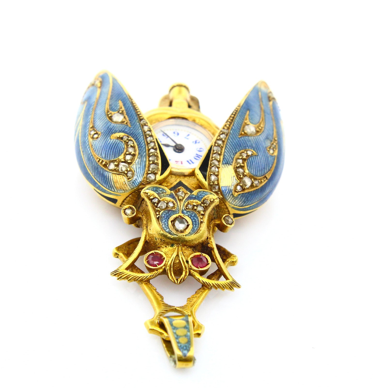 A very fine and very rare scarab lapel watch and pendant, made of 18K yellow gold, old mine diamonds, natural ruby, and teal colored enamel. The keyless movement is made of gilt brass and steel. The porcelain dial features arabic numerals. The piece is free from dents or dings, parts of the enamel on the wings has worn off but otherwise the piece is in excellent antique condition.
