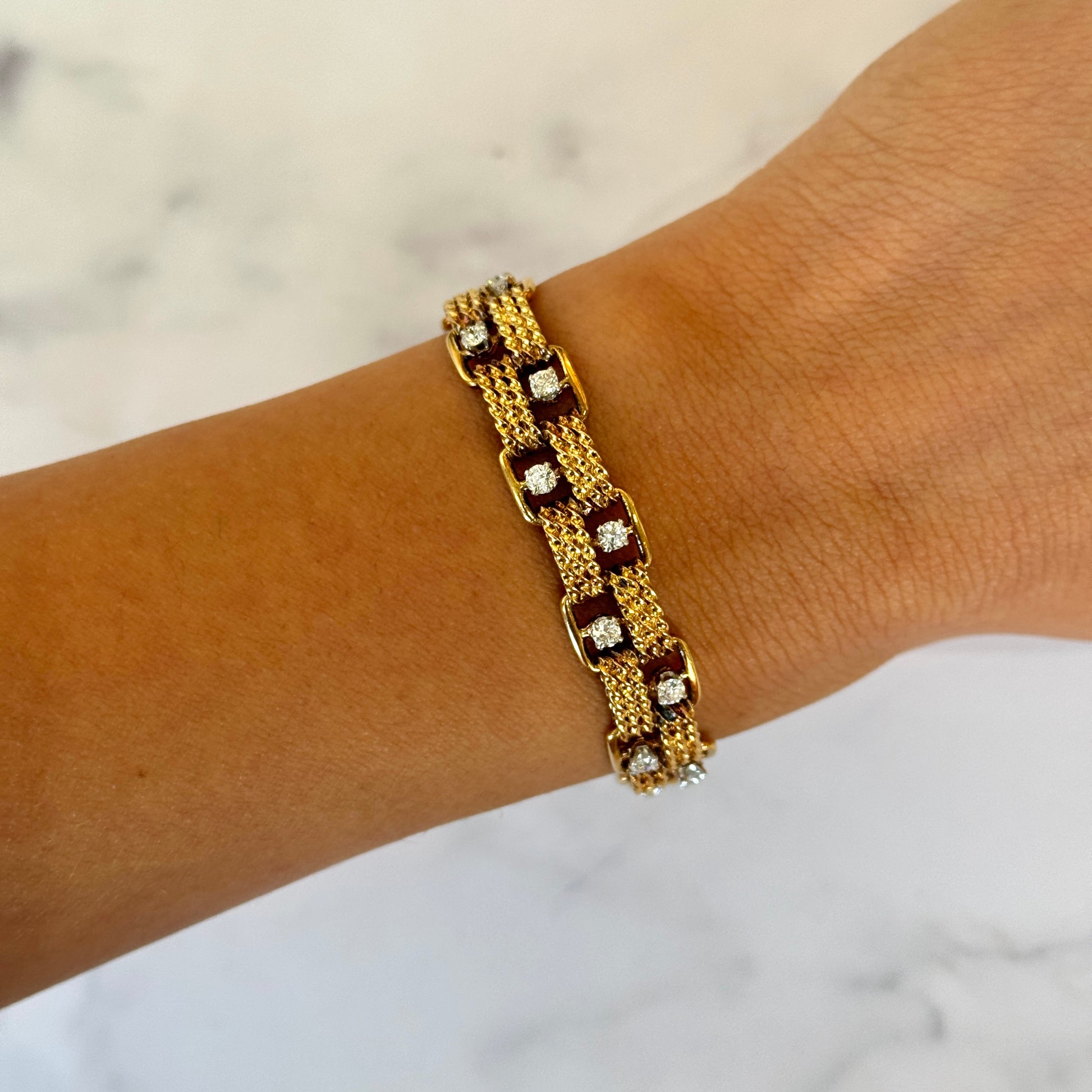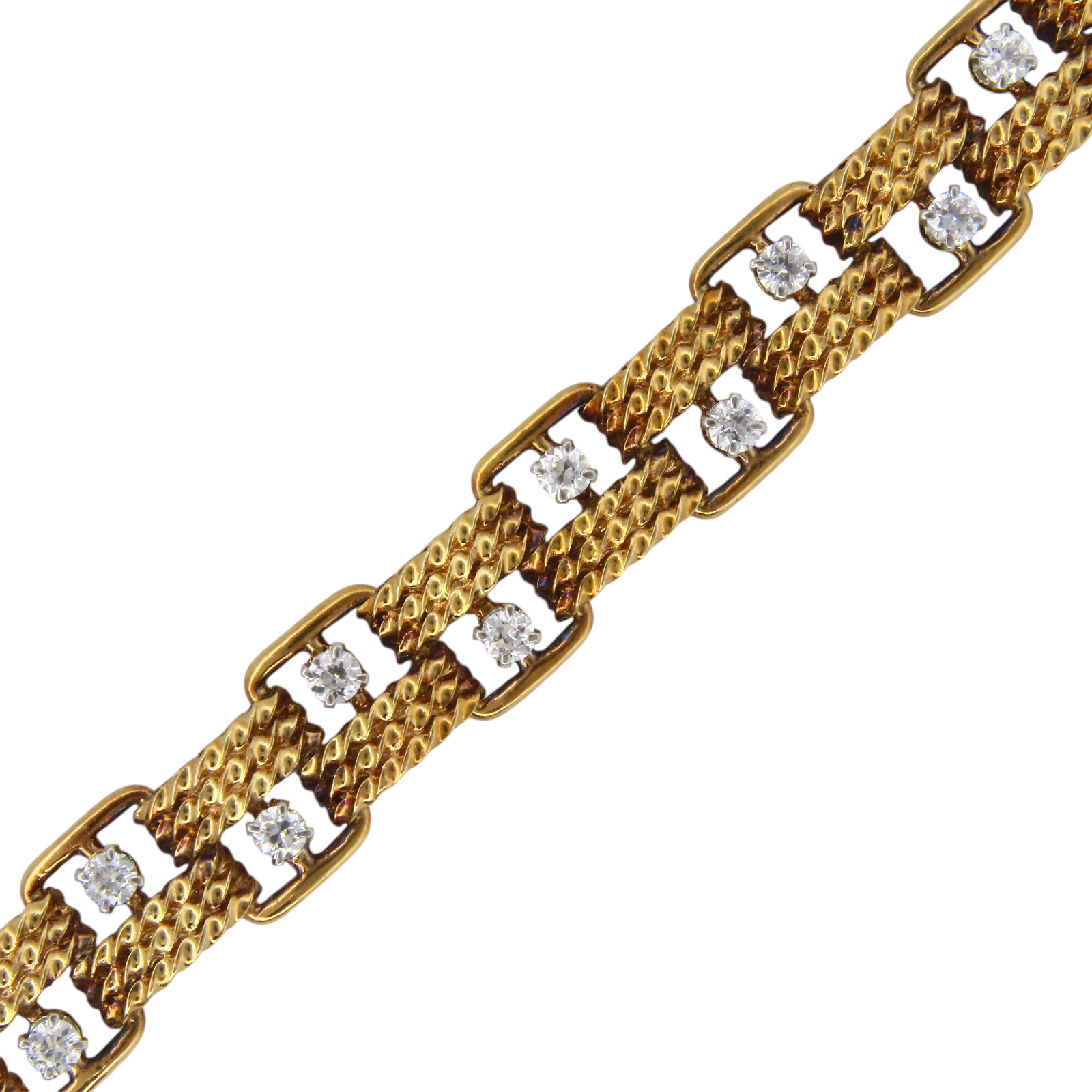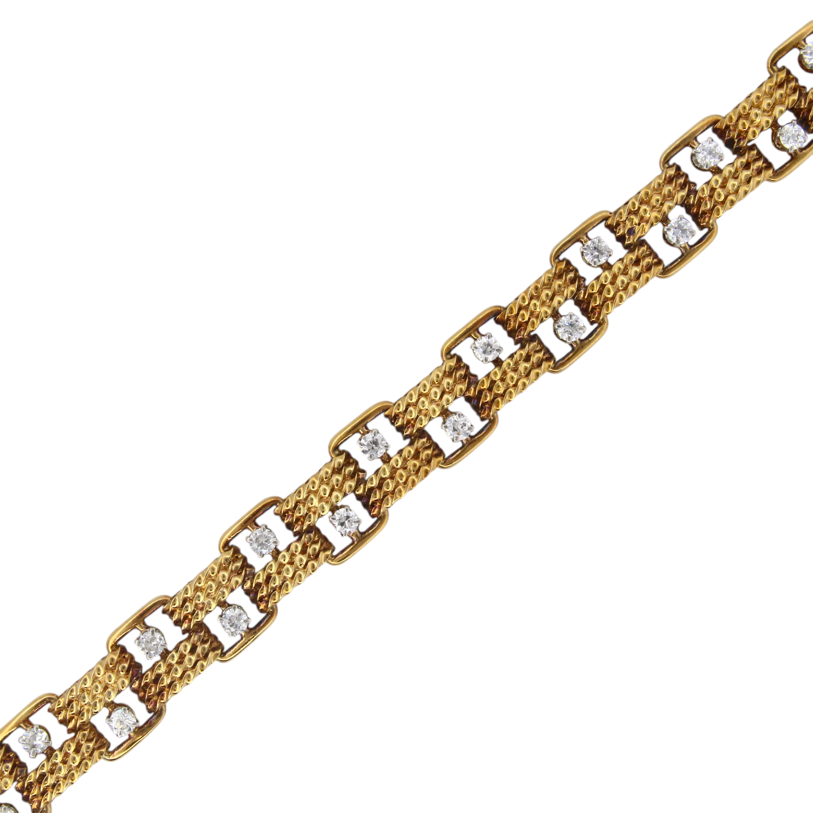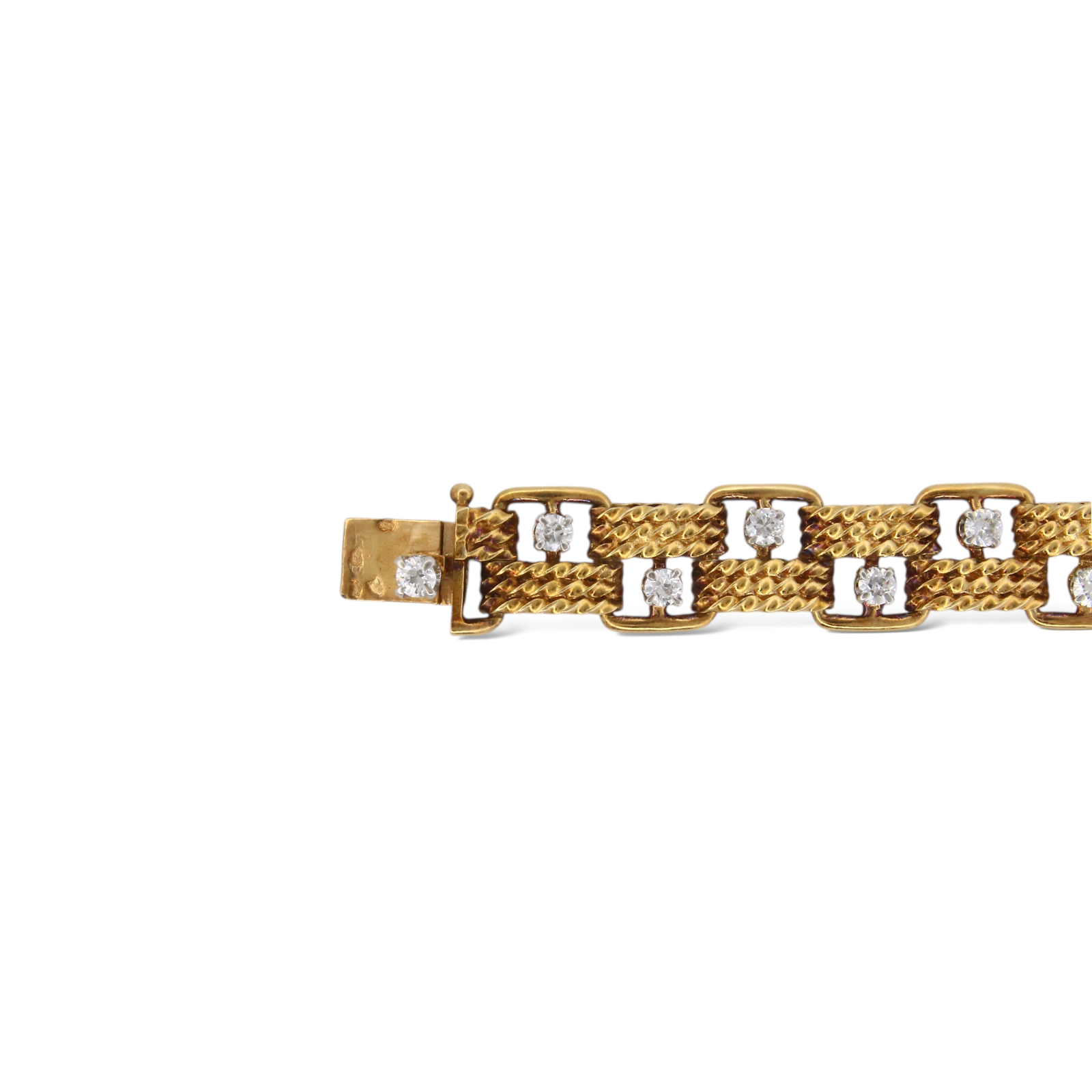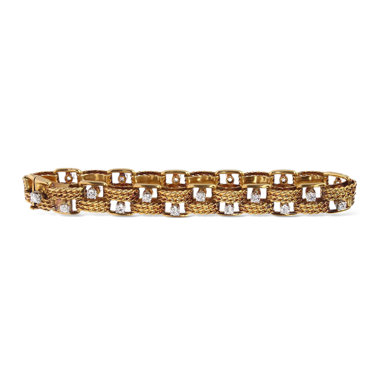 Circa 1950s Boucheron vintage bracelet set with diamonds made in Paris, France. This 18K yellow gold bracelet is composed of French braided links, accented by 24 diamonds set in platinum. The bracelet has a tongue lock with an extra safety on the side. The lock is stamped: Boucheron Paris, numbered, and has multiple French hallmarks. The lock is released by pushing down on one of the diamonds. The bracelet measures 7 inches long and 10 mm wide. The bracelet is in excellent condition with minor hairline scratches. There are no dings or dents and the diamonds are undamaged.