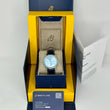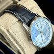Blue leather strap with white contrast stitching, secured with a stainless steel fold-over clasp. The strap shows minimal signs of wear and is adjustable from approximately 6.75 to 8.5 inches.