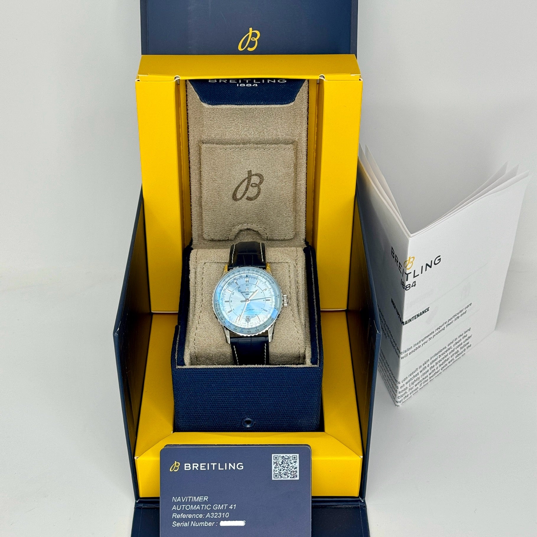 A 2024 Breitling Navitimer GMT reference A32310171C1P1, featuring a striking sunburst ice blue dial with a 24-hour inner ring, arrow-shaped GMT hand, and a date aperture at 6 o’clock. The 41mm stainless steel case is complemented by a matching steel bezel and a scratch resistant sapphire crystal. Fitted on a blue leather strap with steel fold clasp. This watch is all original and comes with its original box, outer box, warranty card, and paperwork.