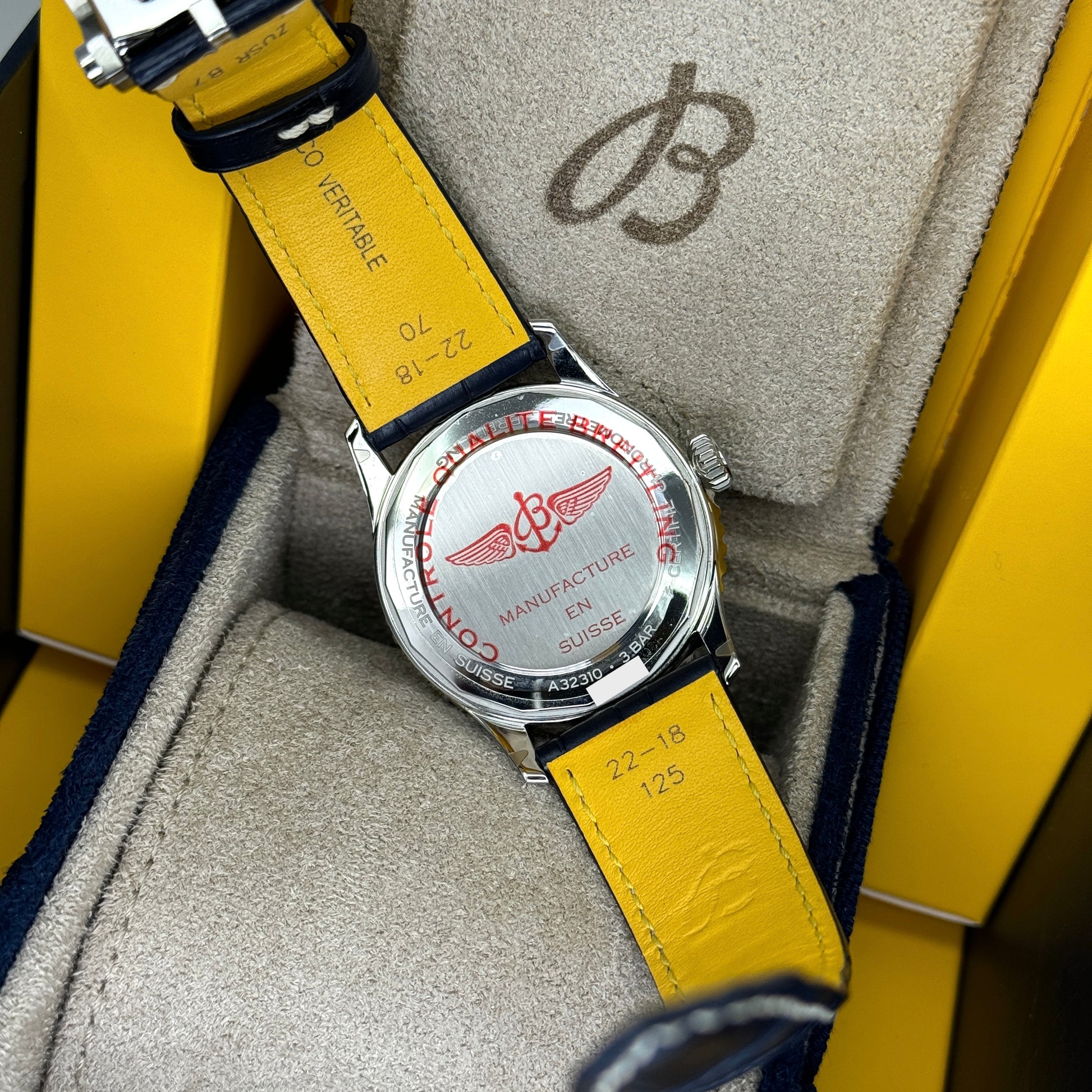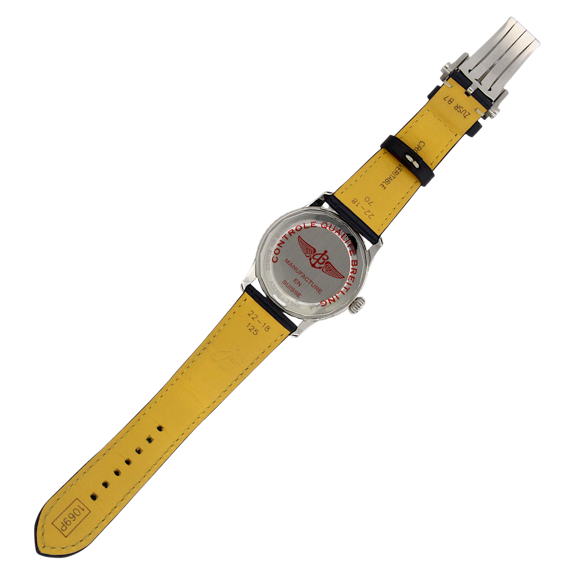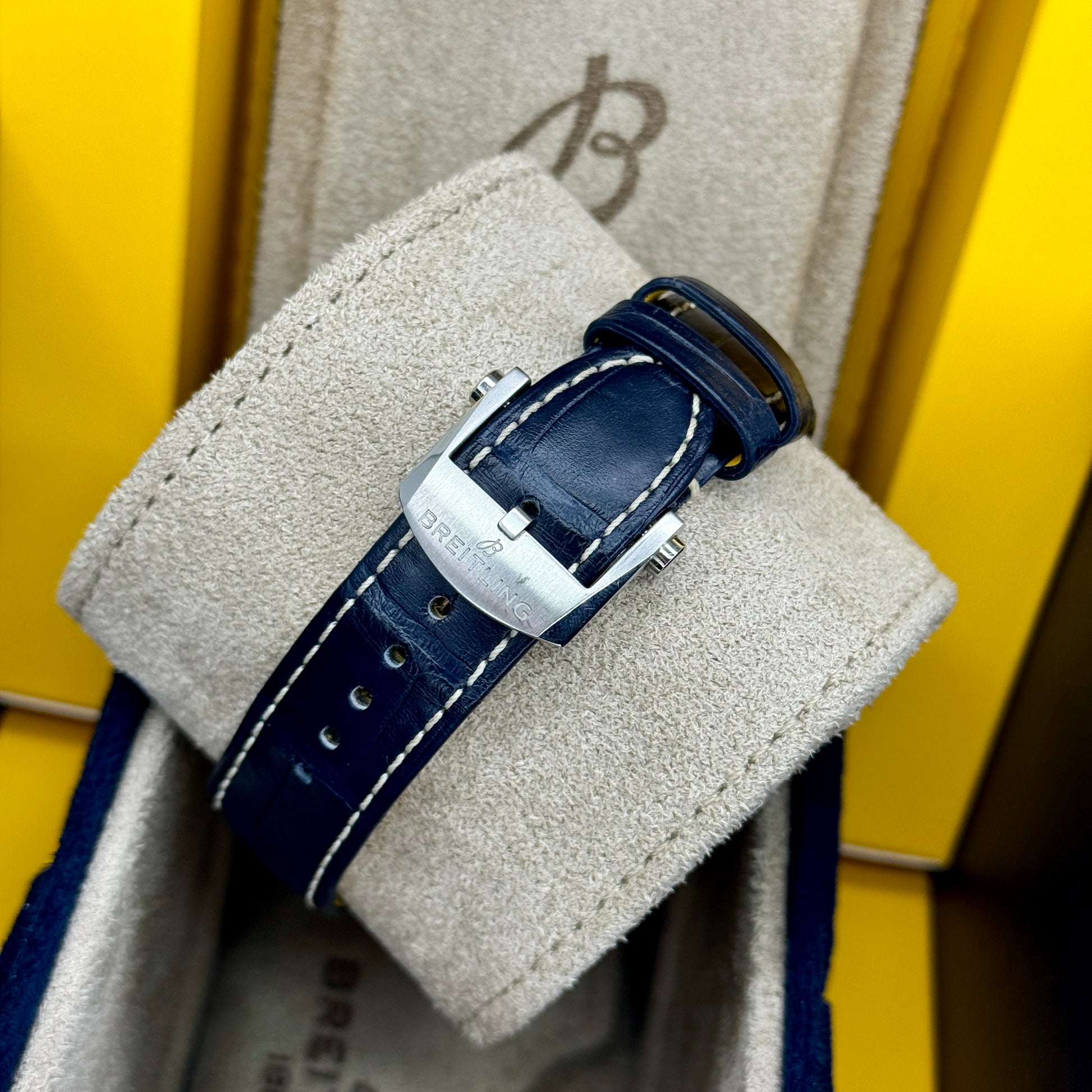The watch is in very good pre-owned condition with minor, intangible hairline scratches on the case back and bezel consistent with light use. The dial is clean. The crystal has minor hairline scratches between the 3 and 4 markers. The case still retains its original protective stickers. The leather strap is in great shape. The movement has been machine-tested for accuracy and water resistance, and performs within Breitling standards. The watch carries a 1-year warranty with Breitling.