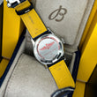 The 41mm stainless steel case has a thickness of 11.65mm and is topped with a scratch resistant sapphire crystal. Water resistance is rated to 3 ATM.