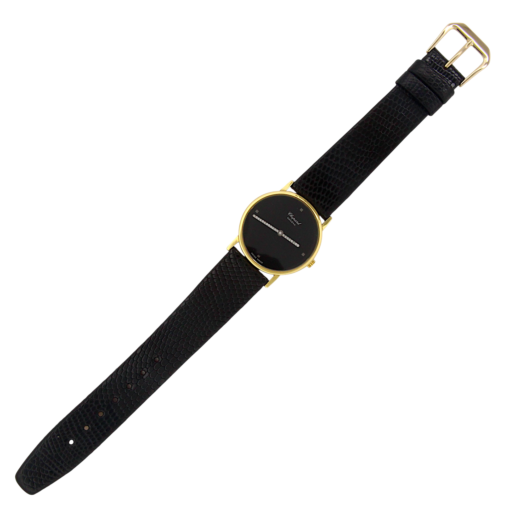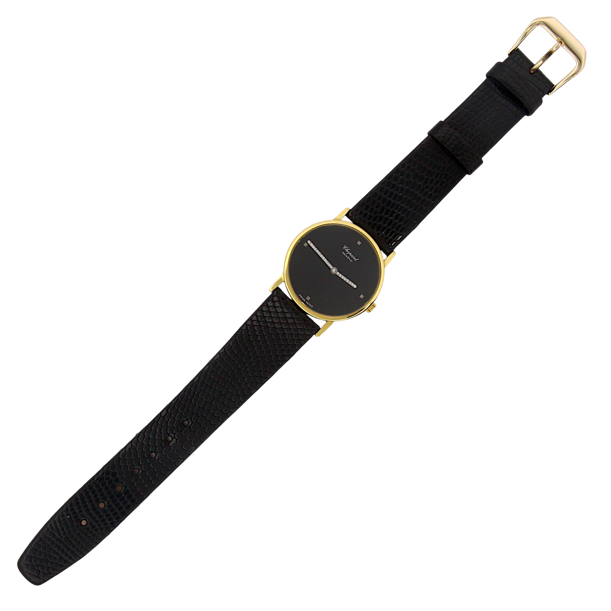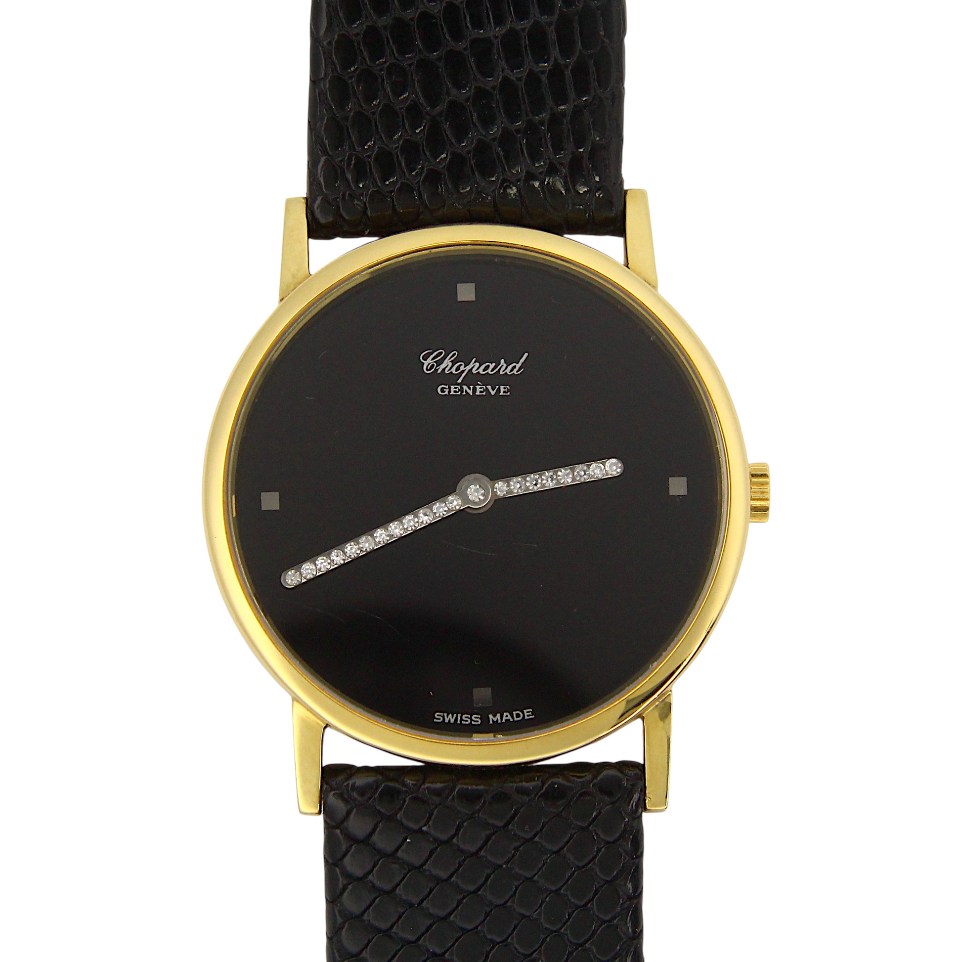 A vintage Chopard Classic women’s dress watch, reference 1057 2. This 30 mm model features a black dial with diamond-set hands and a 18K yellow gold case. Manual winding movement. Approximate production year: 1980. This watch is all original by Chopard except for the black strap and buckle.