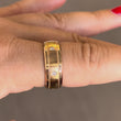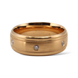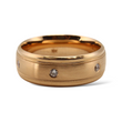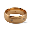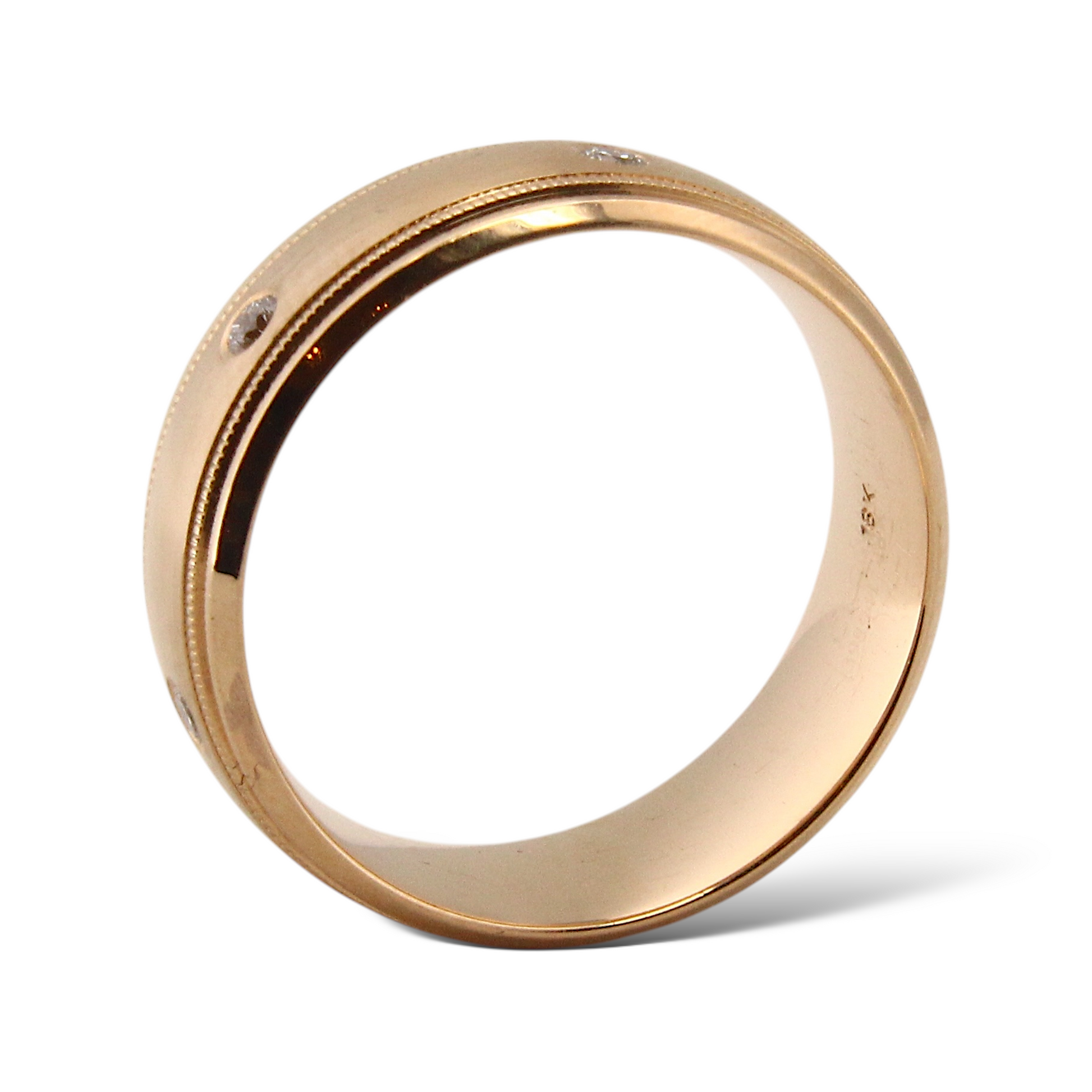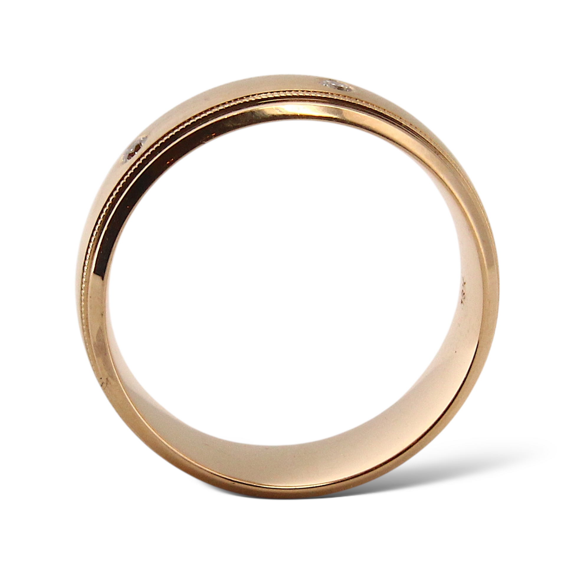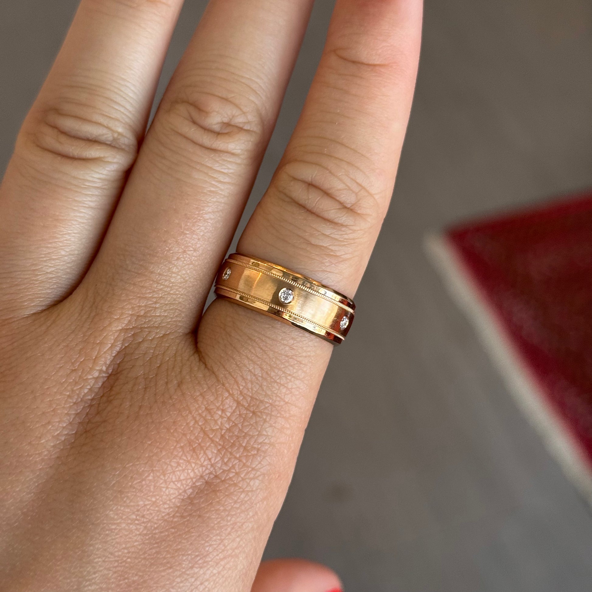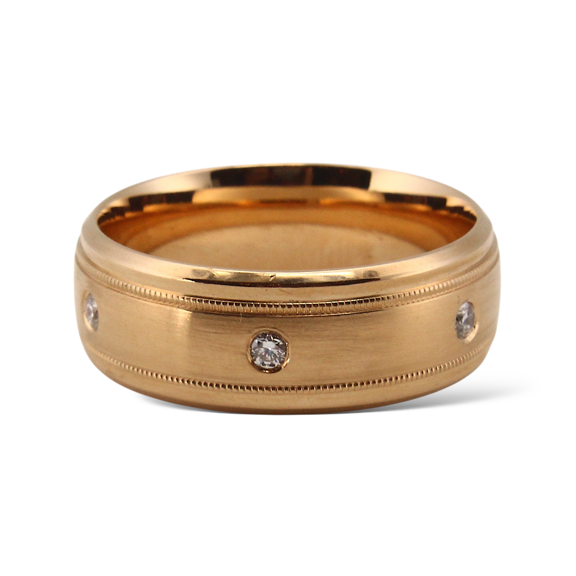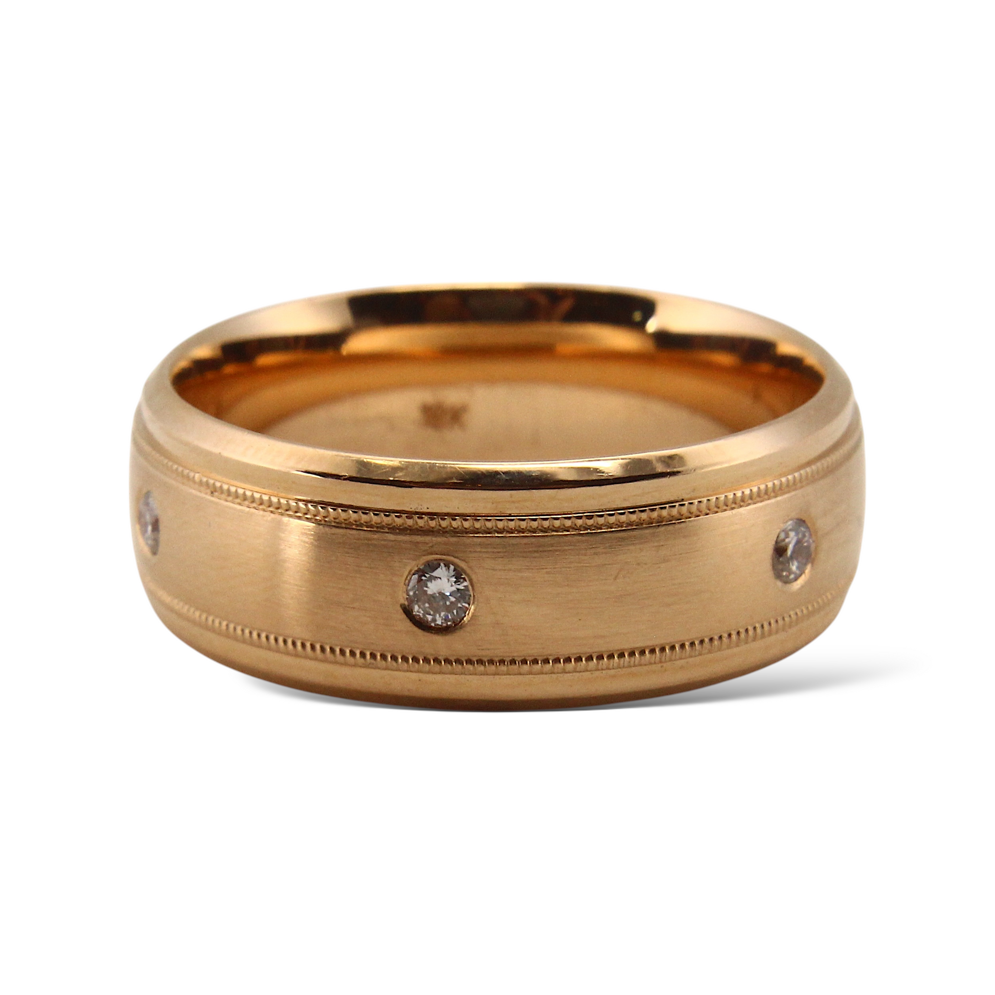 Classic 18K rose gold band featuring a satin-finished center panel bordered by fine milgrain edges and polished rims. Flush, bezel-set natural diamonds are evenly spaced around the band, adding subtle sparkle while maintaining a sleek and timeless look. Designed for both elegance and comfort, this band is ideal as a wedding ring or refined statement piece.