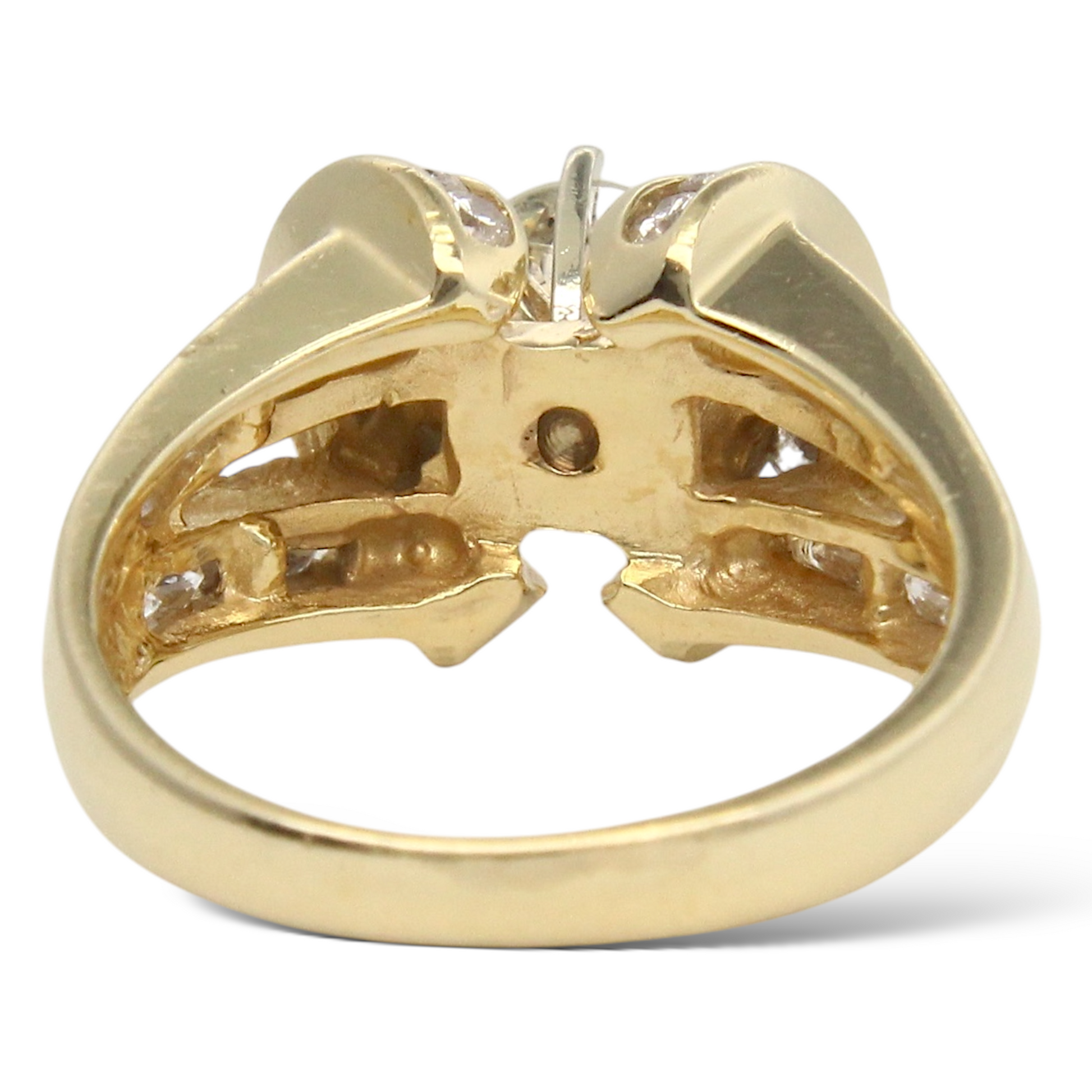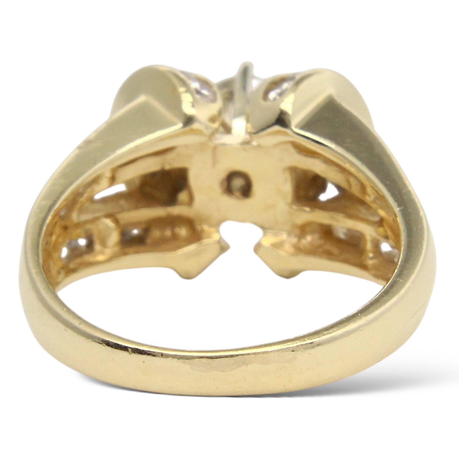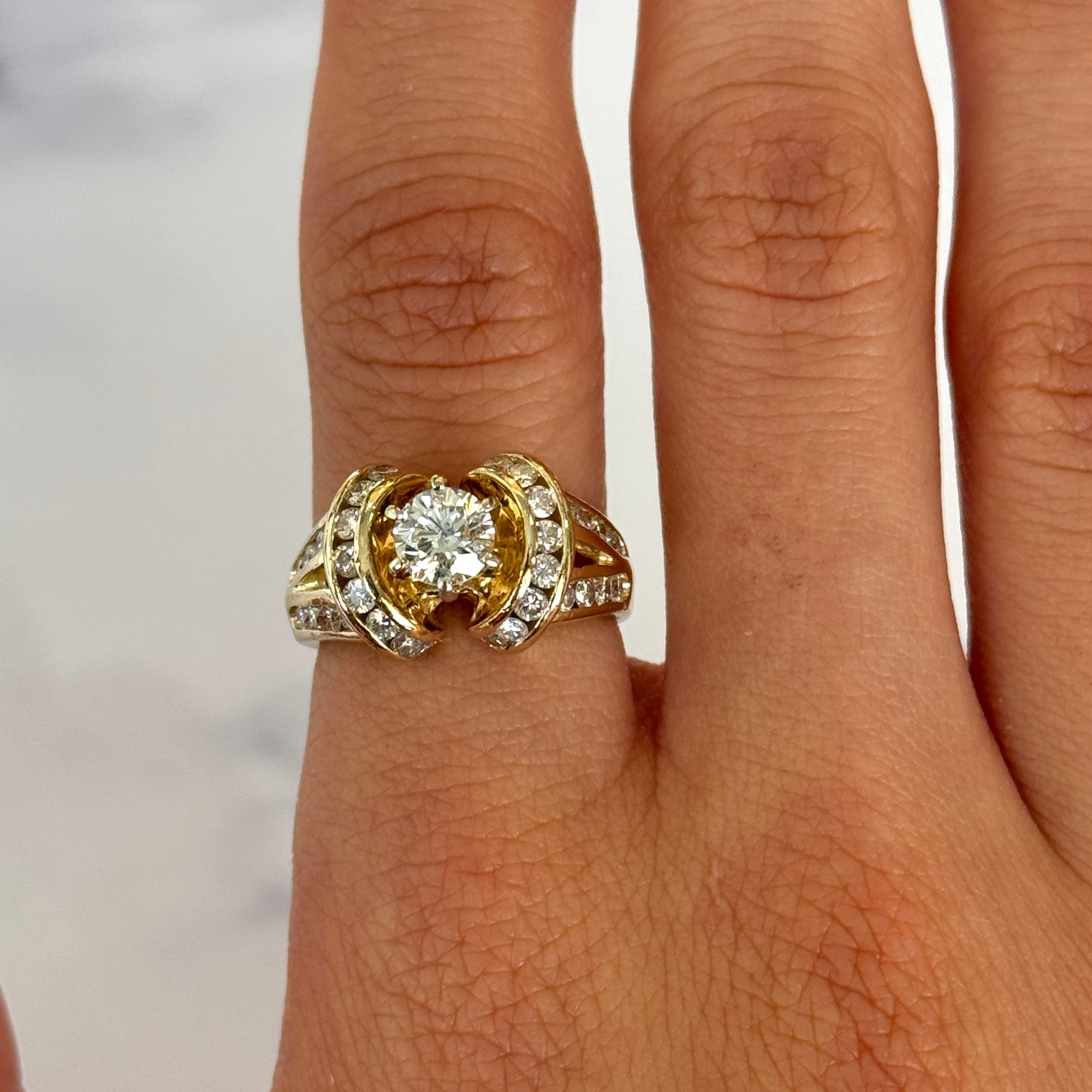 This 14K yellow gold diamond ring features an impressive approximately 1.40 CT natural earth-mined round brilliant diamond at its center. The diamond is mounted in a raised prong setting, beautifully framed by an open sculpted design. Additional round brilliant cut diamonds accent the shoulders, enhancing the ring with sparkle and depth. The wide tapered shank provides a bold, luxurious presence while remaining elegant and wearable.