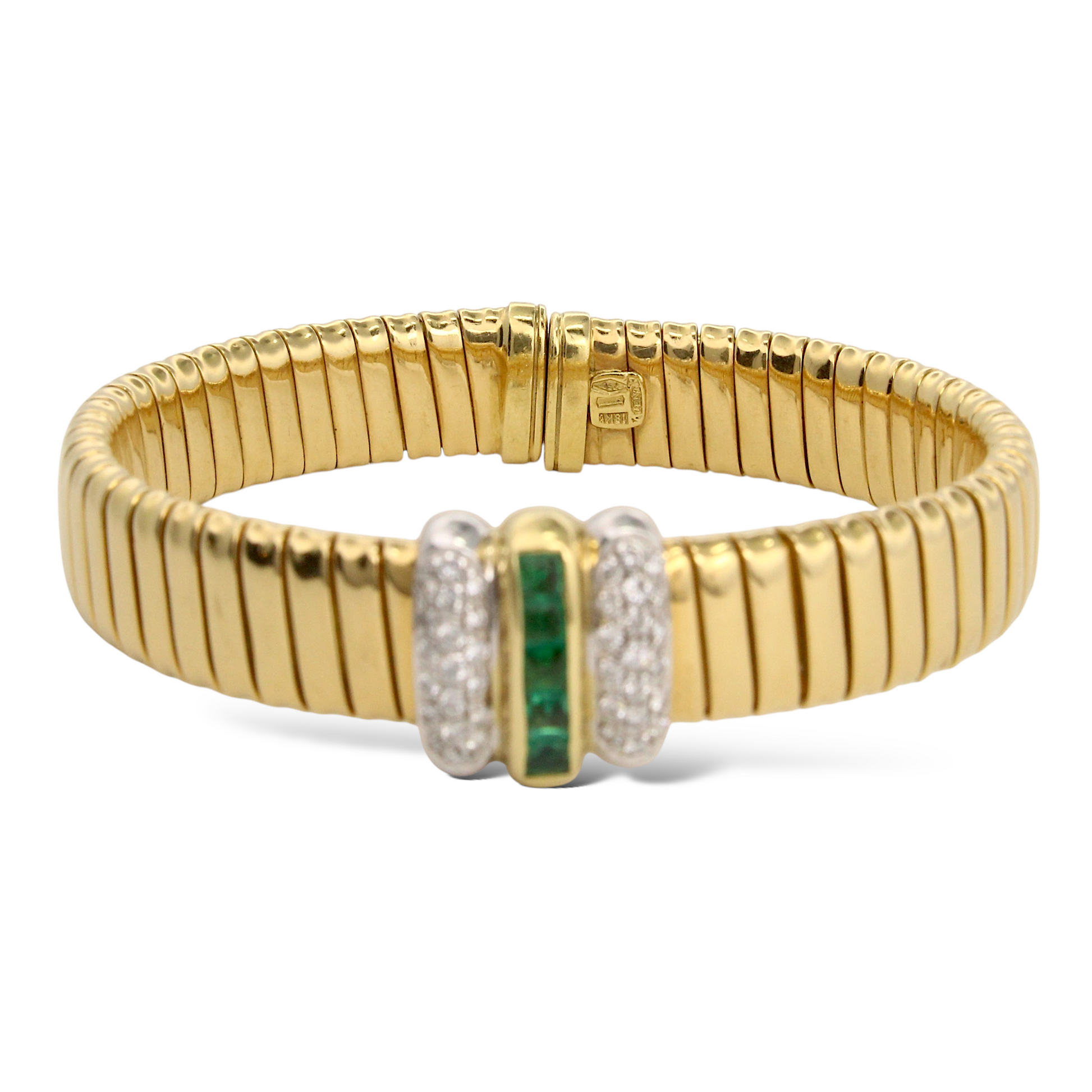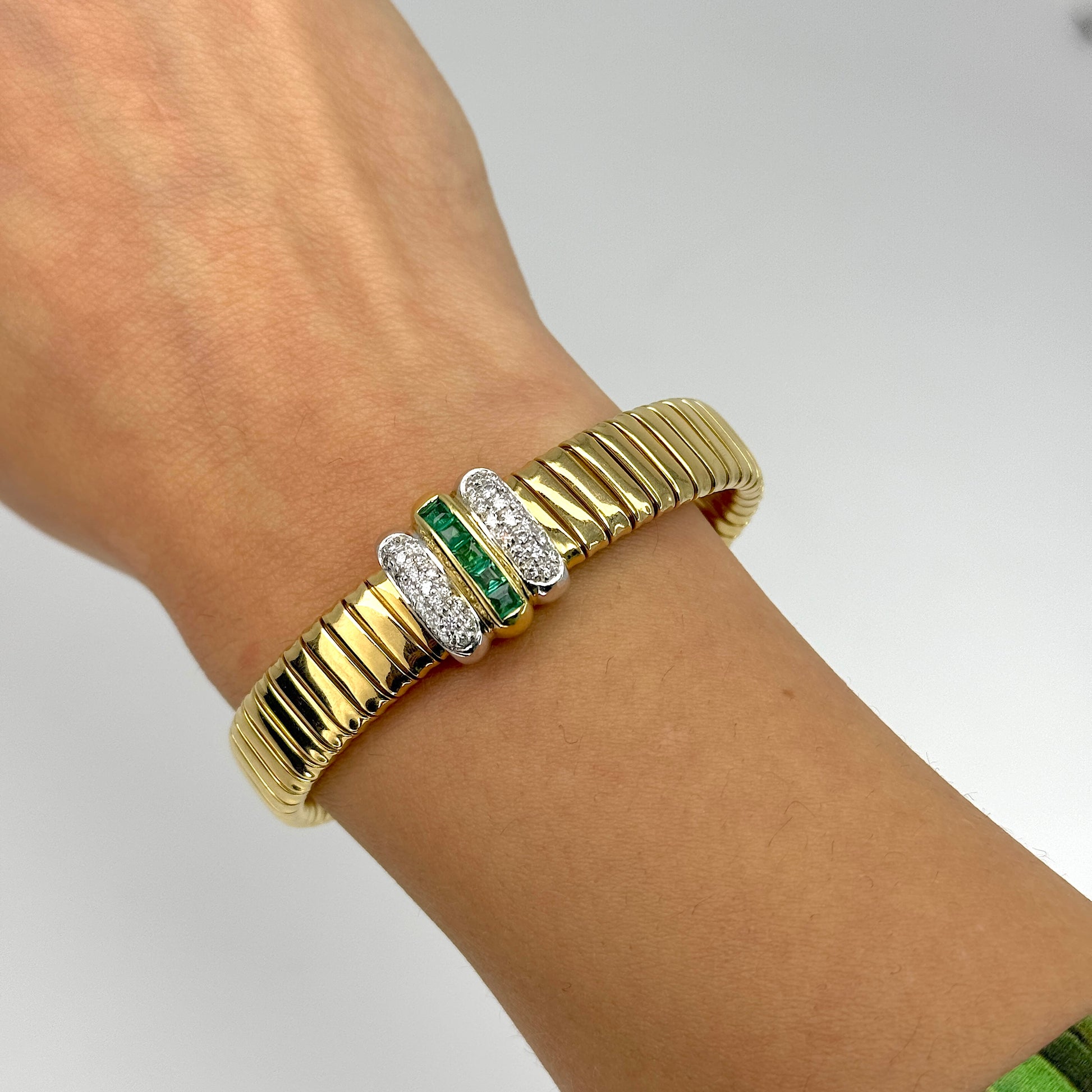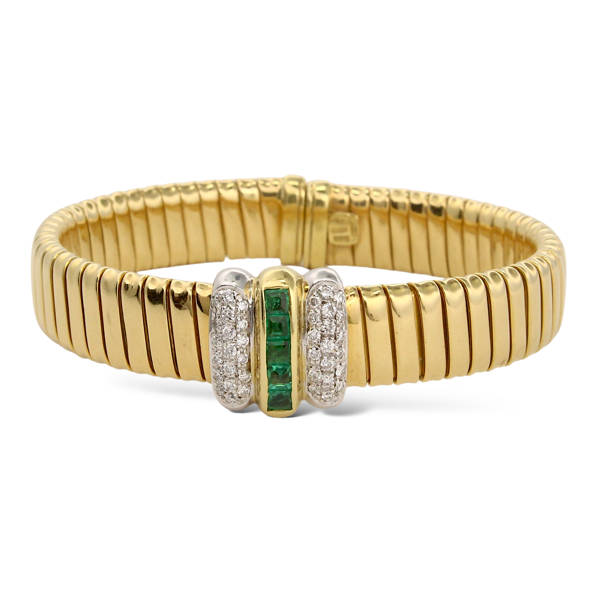 This elegant Italian-made bracelet is crafted in solid 18K yellow gold and features a refined combination of natural diamonds and vivid clean green emeralds. The centerpiece displays approximately 0.40 carats of natural round brilliant cut diamonds in pavé settings, offering bright white sparkle and fine craftsmanship. Framed between the diamond accents is a row of natural square emerald cut green emeralds, and totaling approximately 0.50 carats, adding a rich pop of color and a luxurious finish.