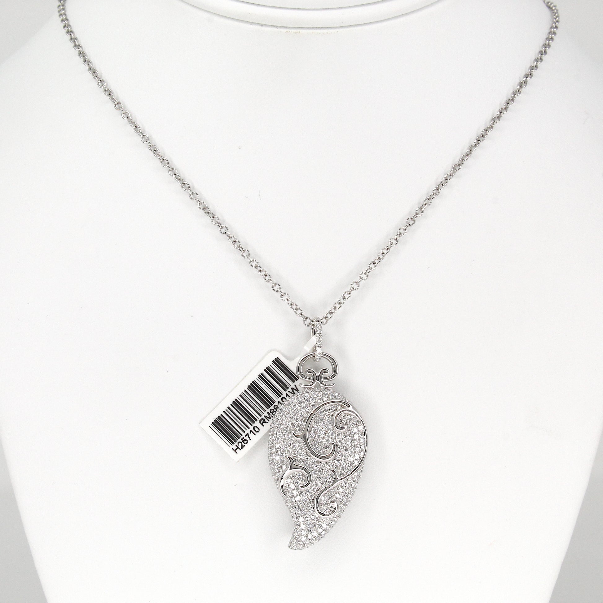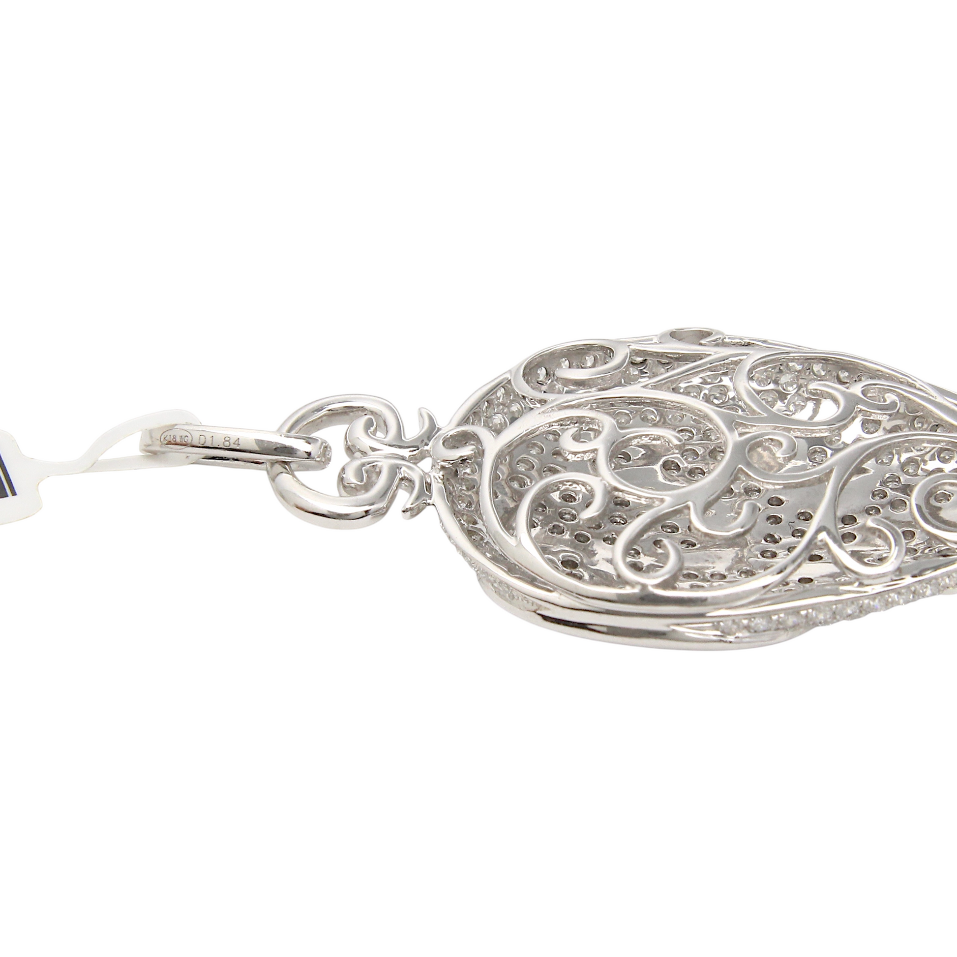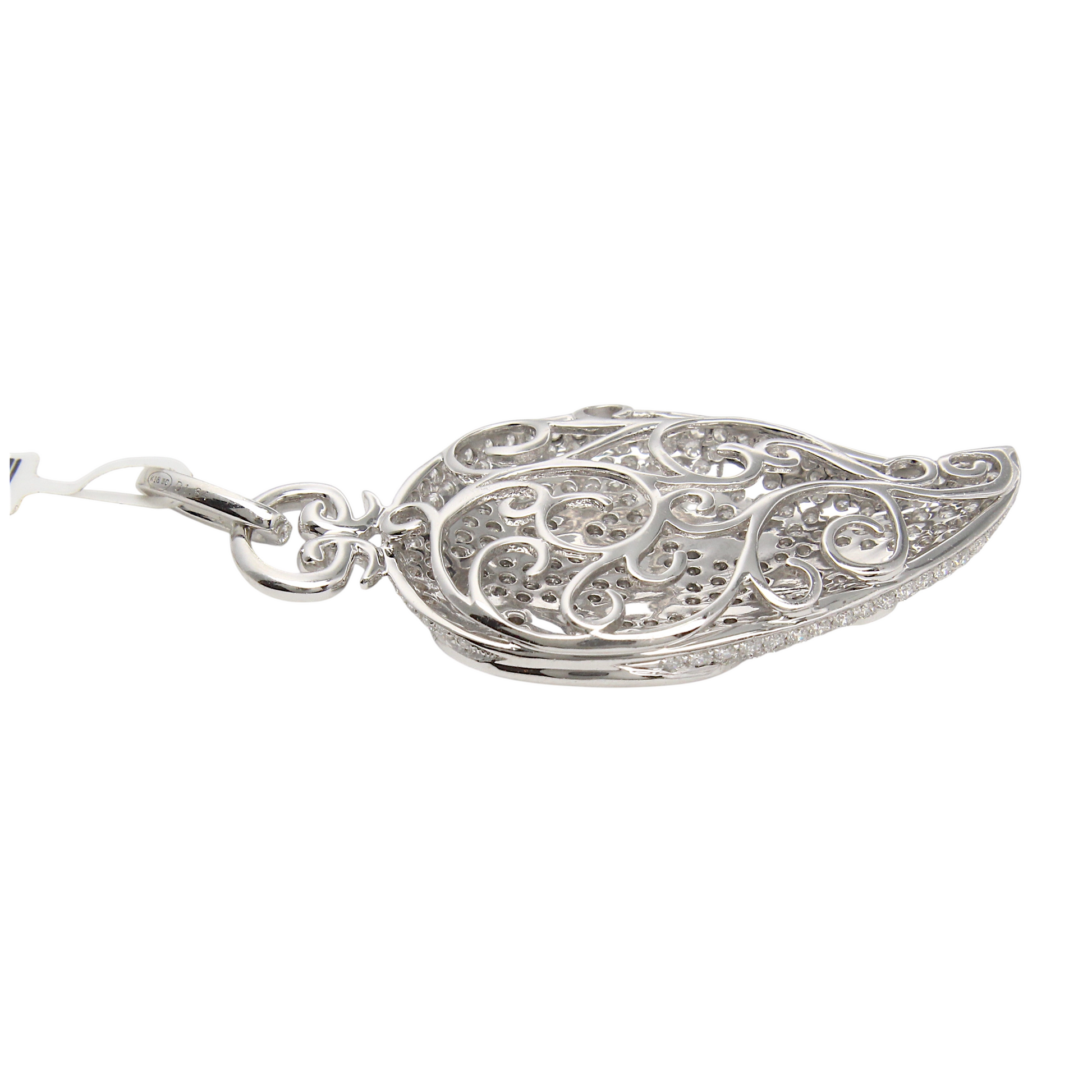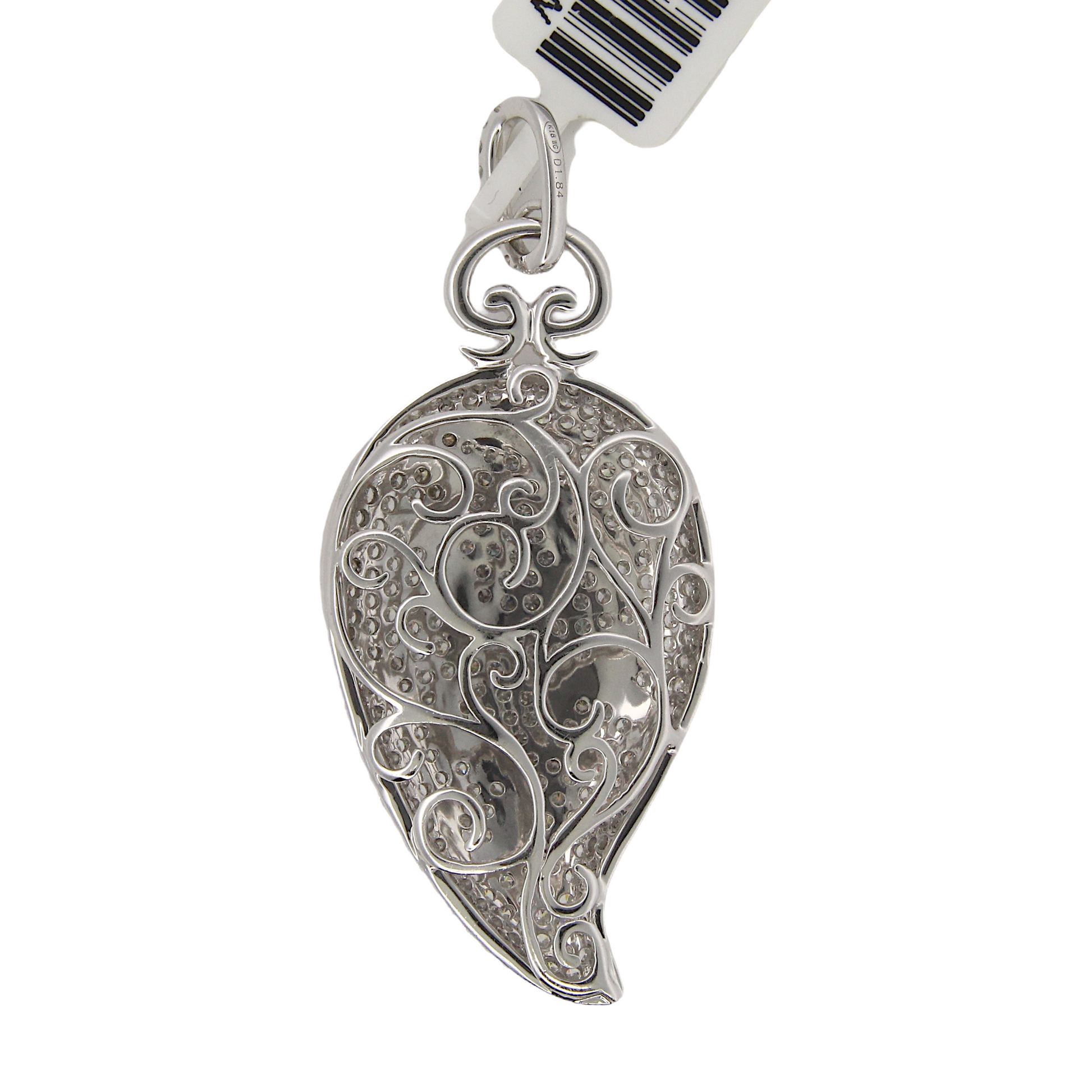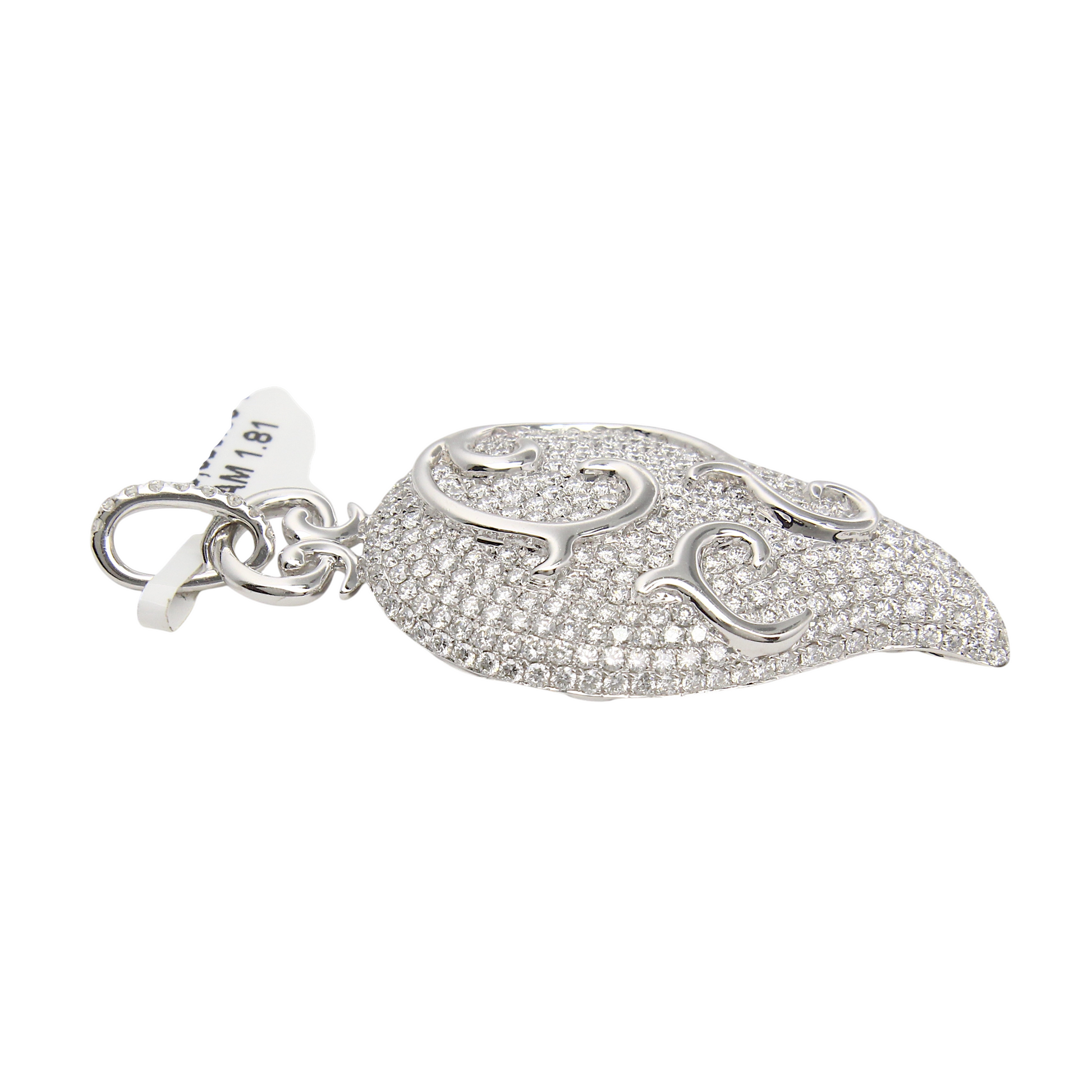 This graceful pendant is crafted in solid 18K white gold and showcases an elegant leaf-inspired silhouette fully pavé-set with natural earth-mined round brilliant cut diamonds. Intricate scrollwork detailing enhances the dimensional structure, while the softly curved organic form creates refined movement and visual depth. With approximately 1.81 carats total weight of diamonds displaying G–H color and VS–SI clarity, this pendant offers exceptional brilliance and timeless sophistication. A versatile and elegant design suitable for both everyday wear and formal occasions.