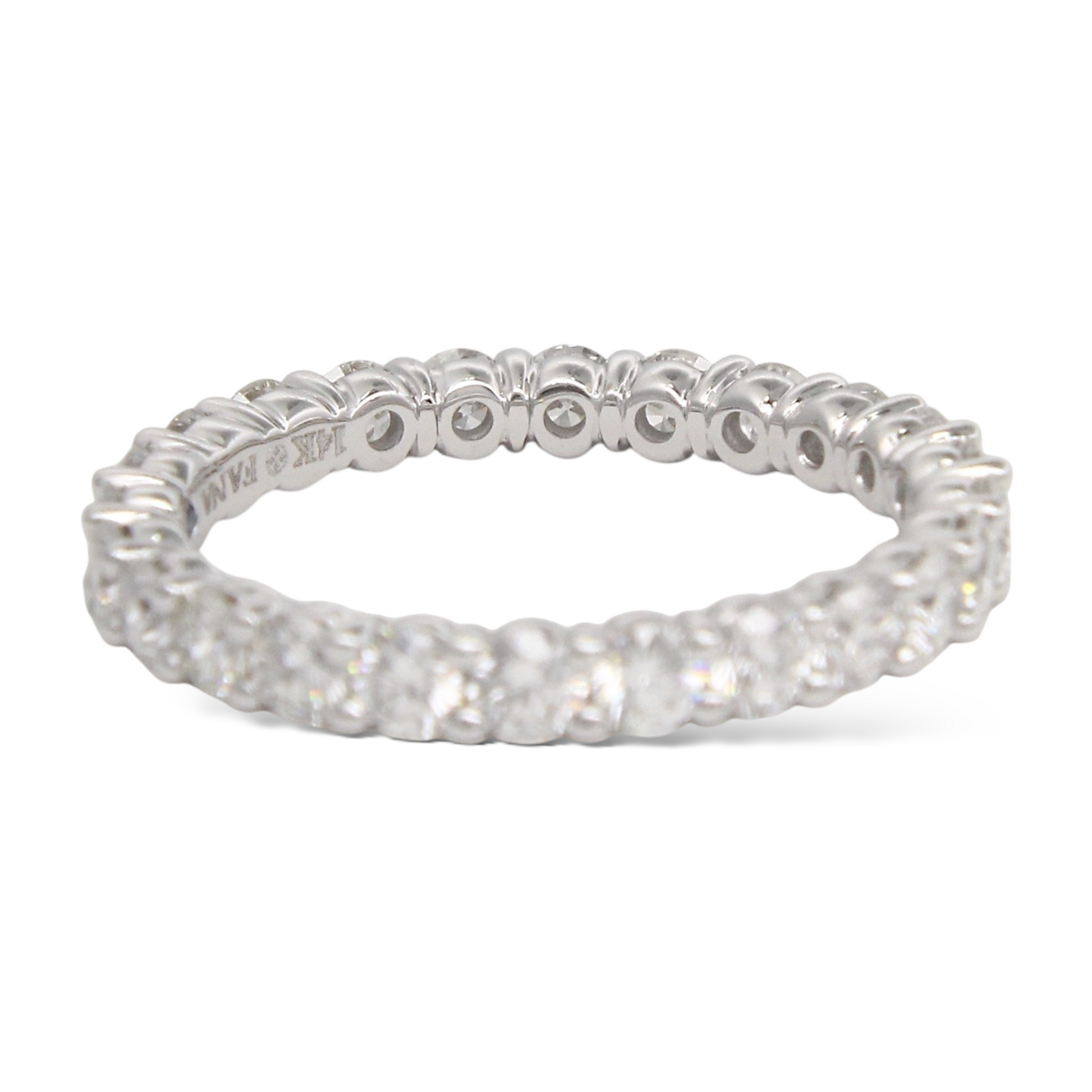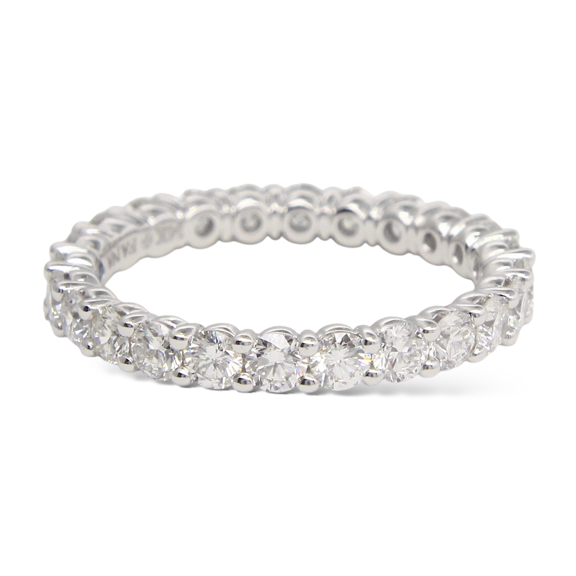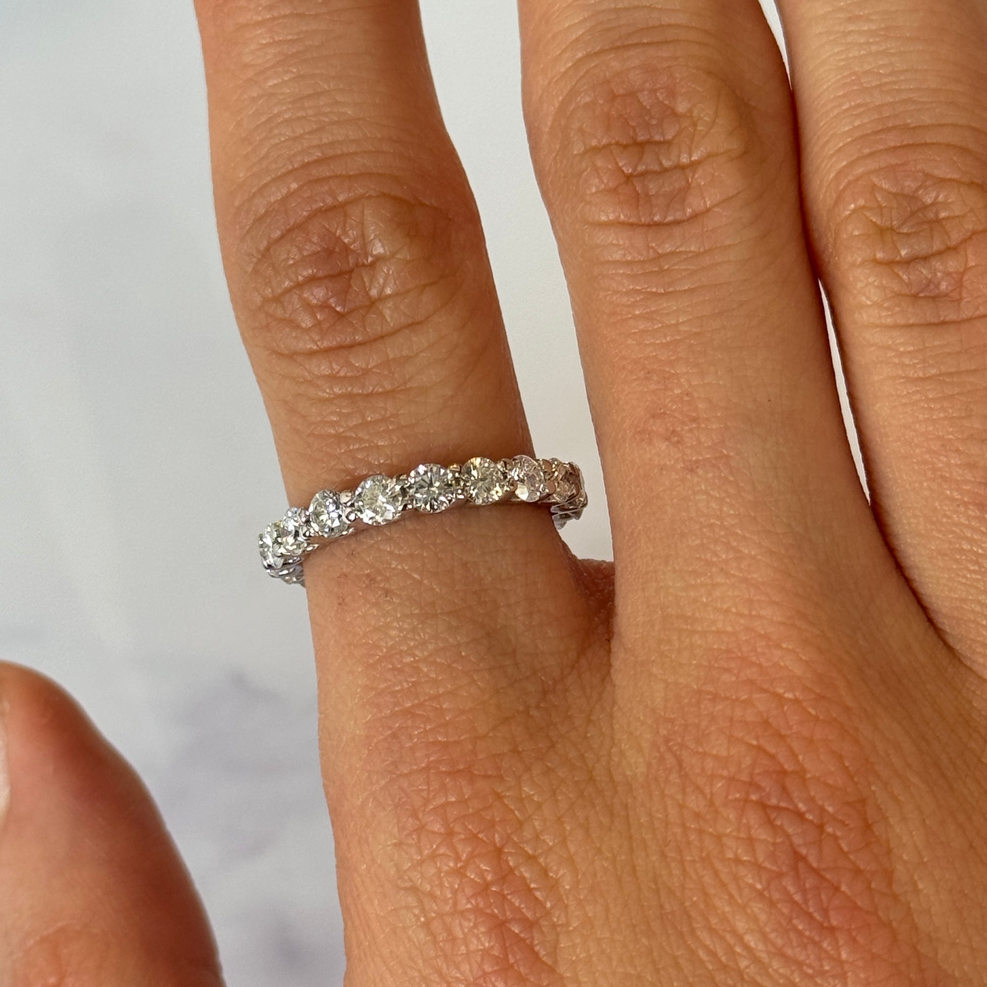 This elegant eternity band features approximately 1.80 CT of natural earth-mined round brilliant diamonds arranged continuously around the band for full-circle sparkle. Each diamond is set in polished shared-prong mounts, allowing maximum light exposure and brilliance. Crafted in 18K white gold, the design offers a refined and timeless look, ideal as a wedding band, anniversary ring, or classic stacking piece. A beautifully balanced luxury ring with exceptional brilliance from every angle.