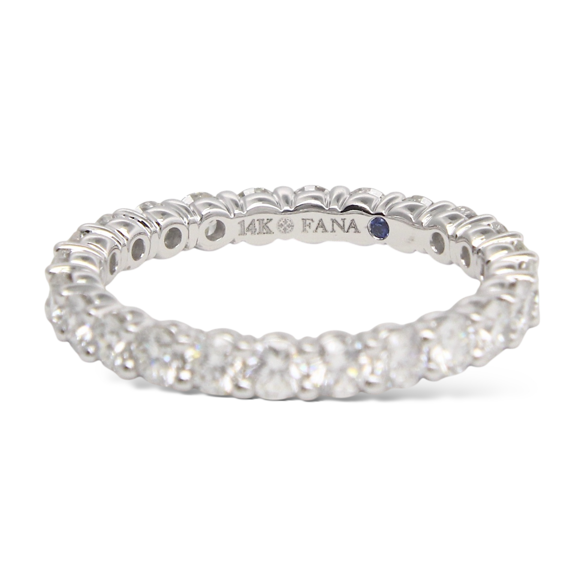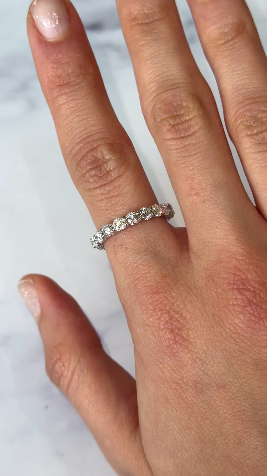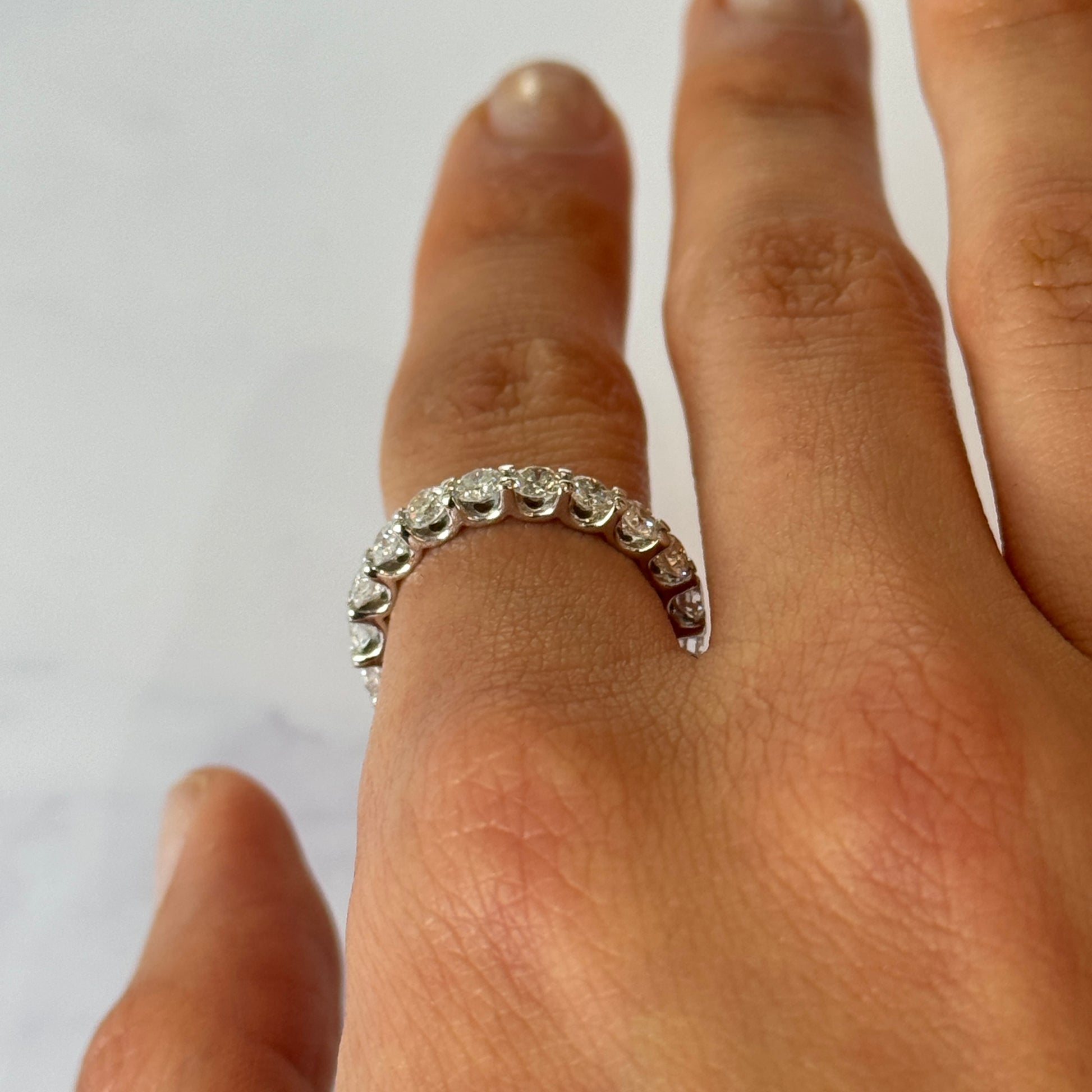 This elegant eternity band features approximately 1.80 CT of natural earth-mined round brilliant diamonds arranged continuously around the band for full-circle sparkle. Each diamond is set in polished shared-prong mounts, allowing maximum light exposure and brilliance. Crafted in 18K white gold, the design offers a refined and timeless look, ideal as a wedding band, anniversary ring, or classic stacking piece. A beautifully balanced luxury ring with exceptional brilliance from every angle.