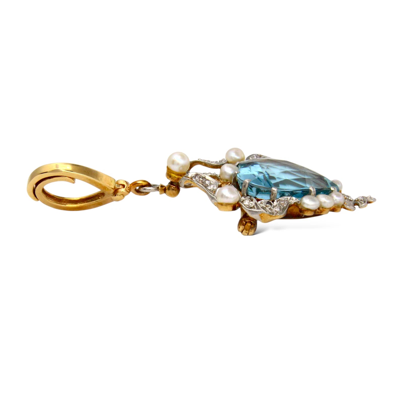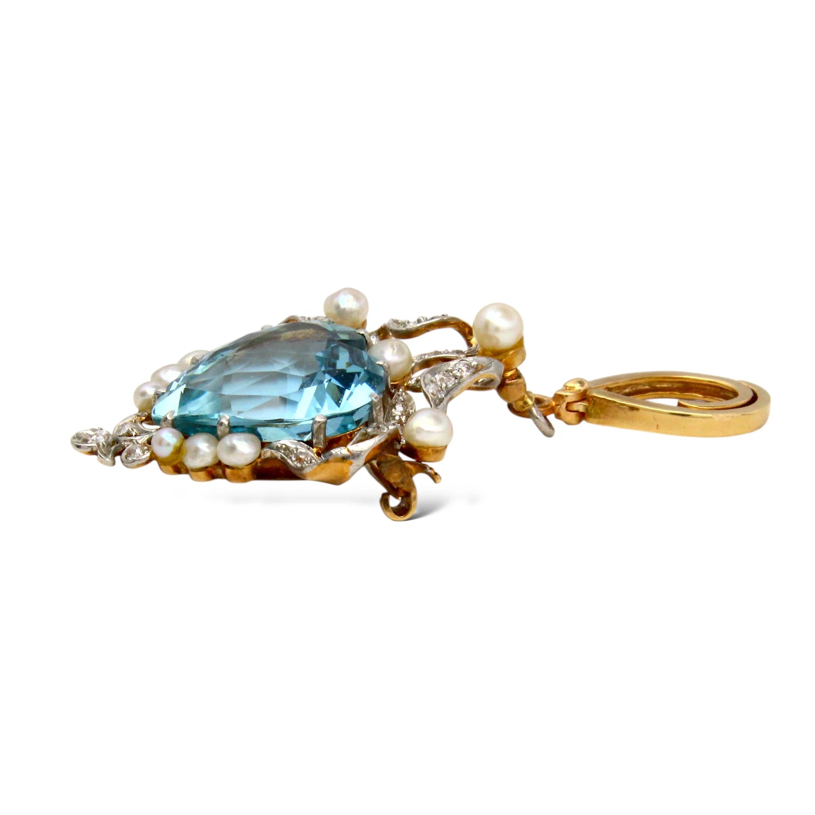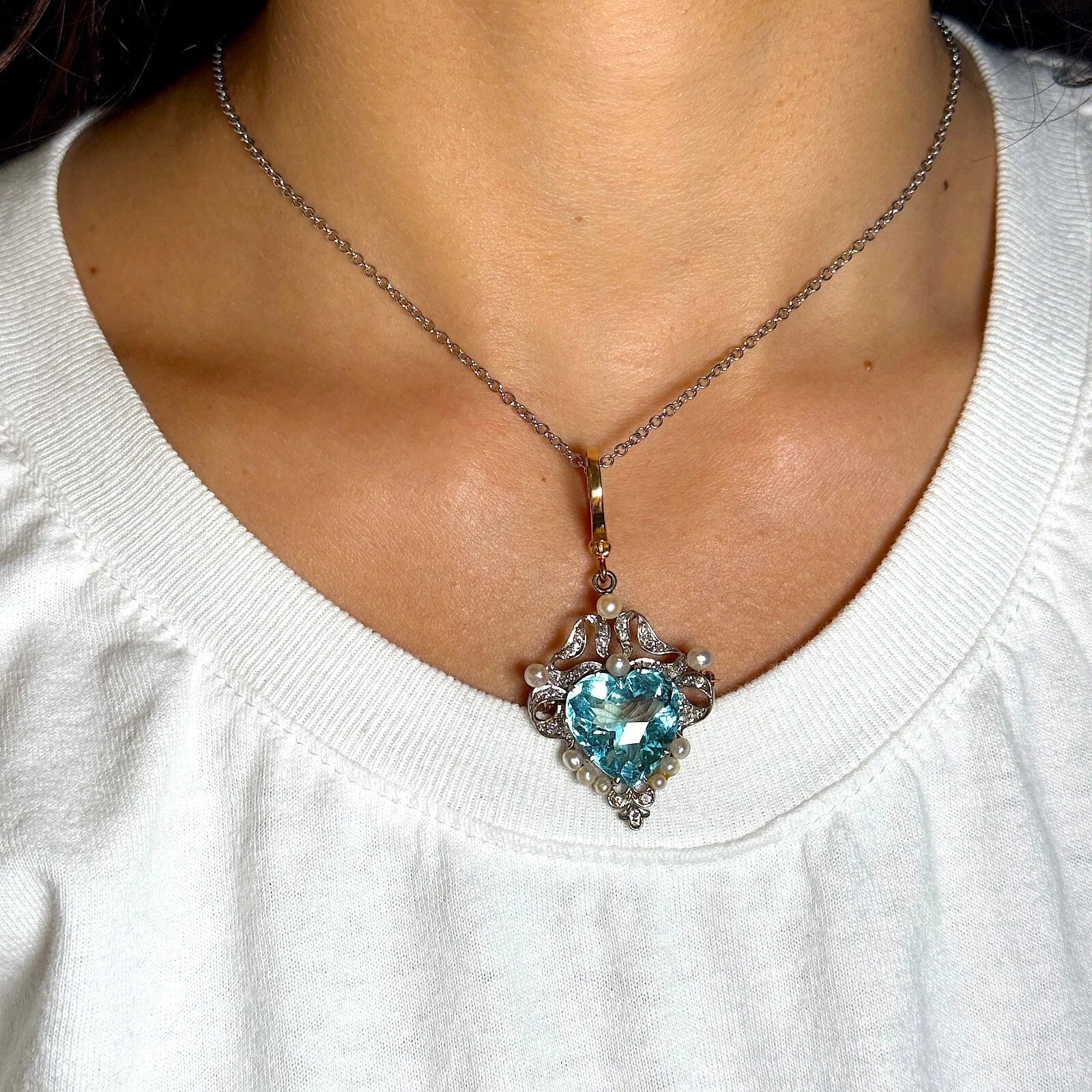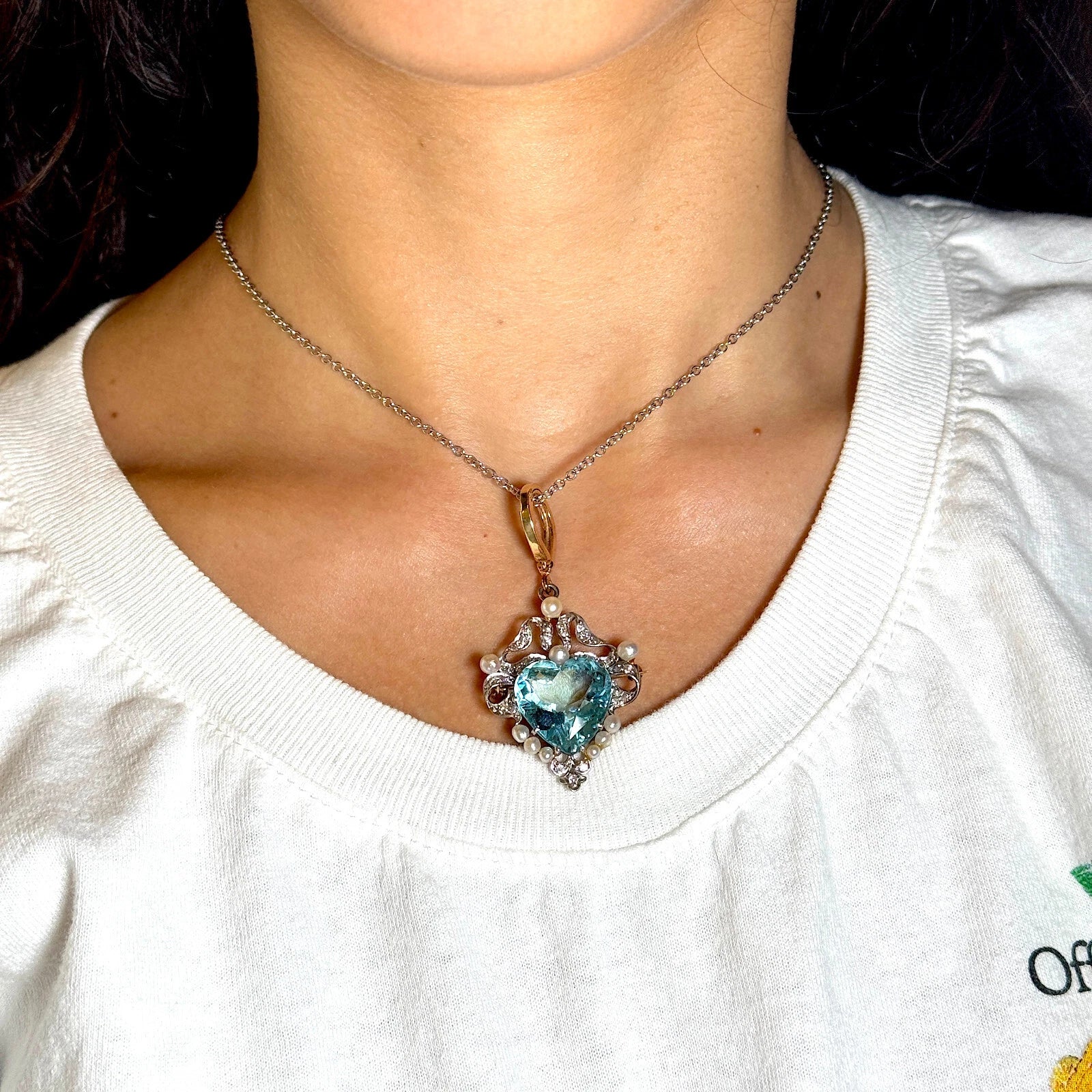 Edwardian Aquamarine Heart Diamond Pearl Pendant Pin 14K Yellow Gold & Platinum