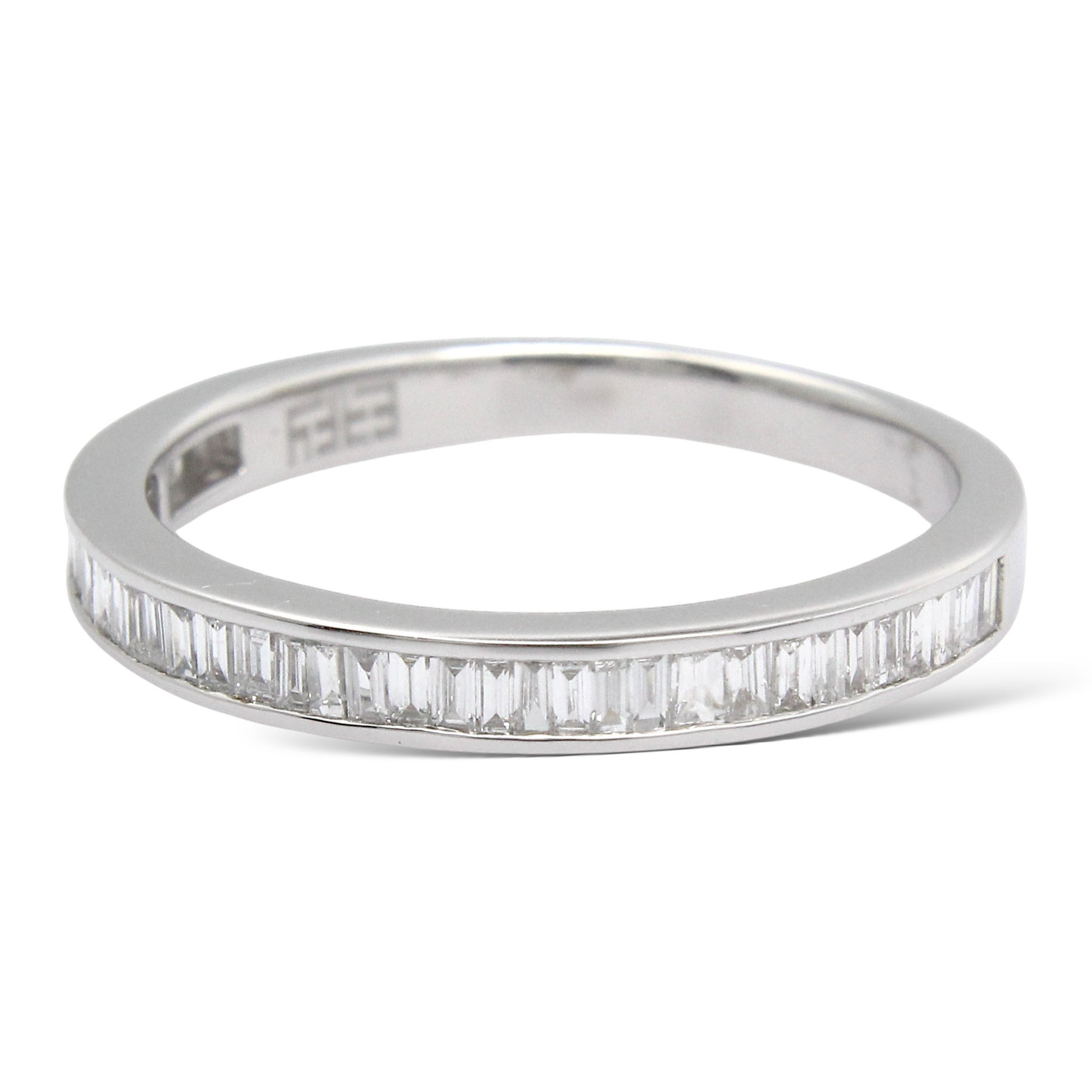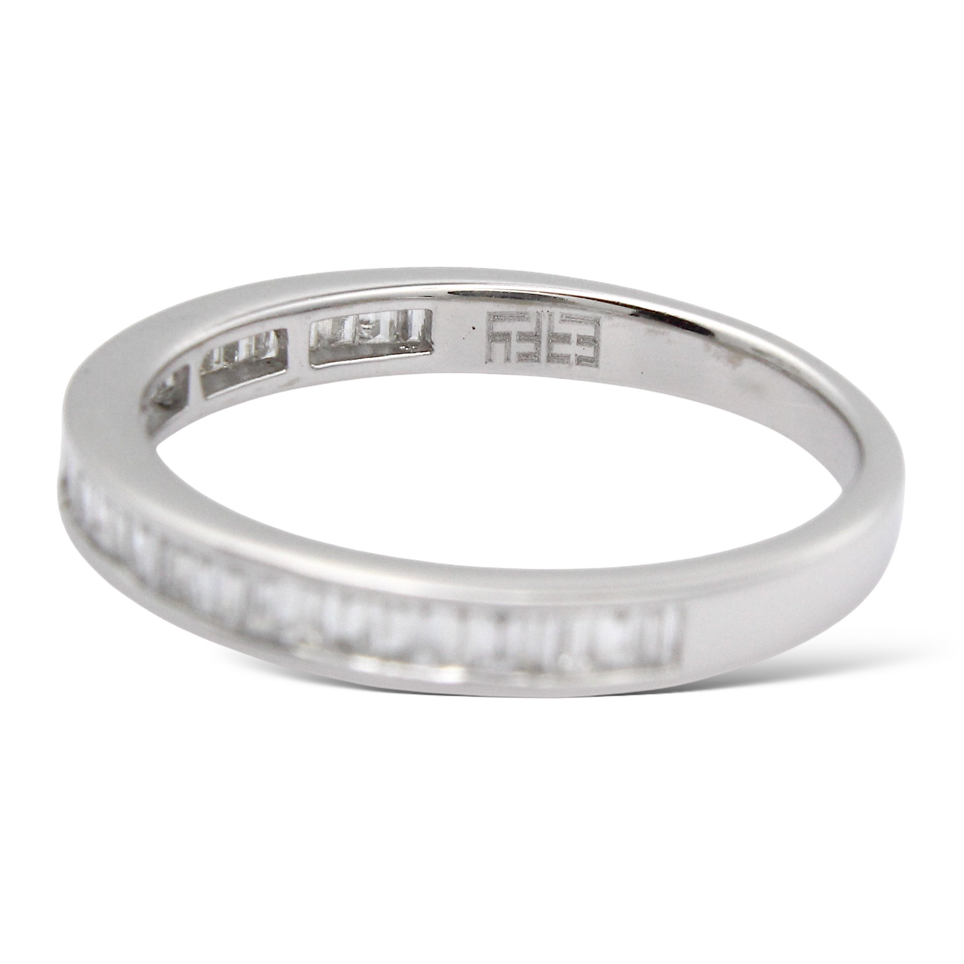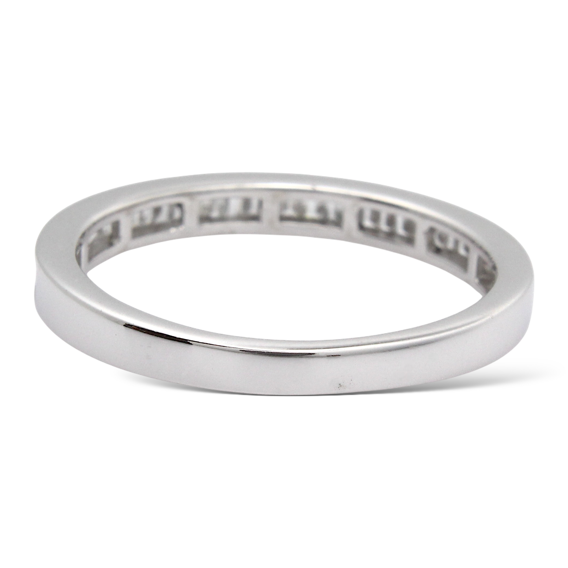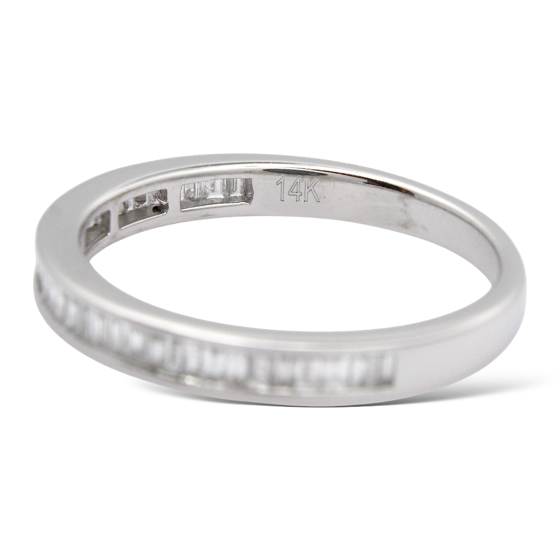 This elegant EFFY diamond band ring is crafted in 14K white gold, featuring a seamless row of approximately 0.25 carats of natural earth-mined baguette-cut white diamonds channel-set around the band. The clean, geometric lines and refined brilliance create a sophisticated and modern aesthetic, ideal for stacking, pairing with an engagement ring, or wearing as a standalone band.