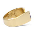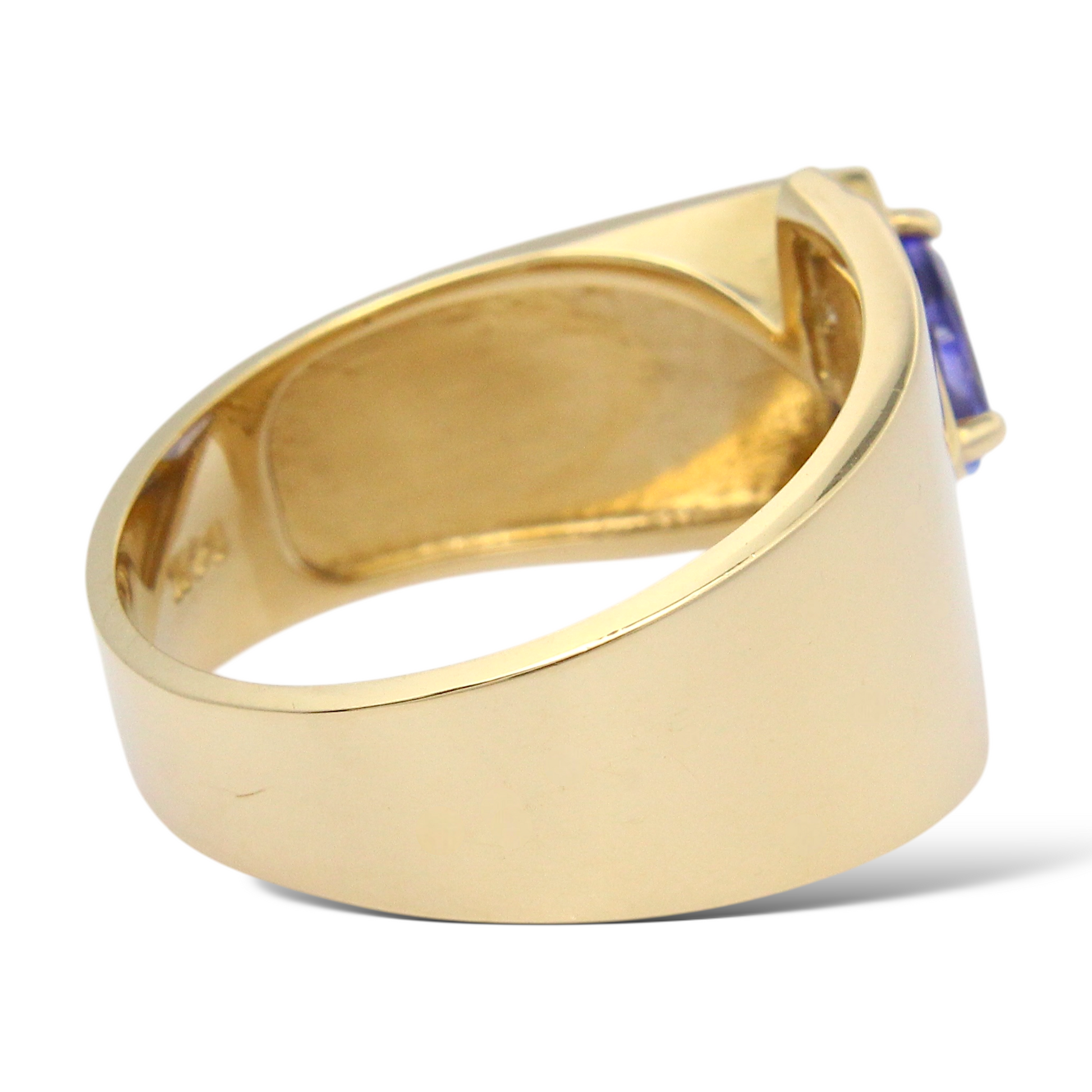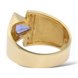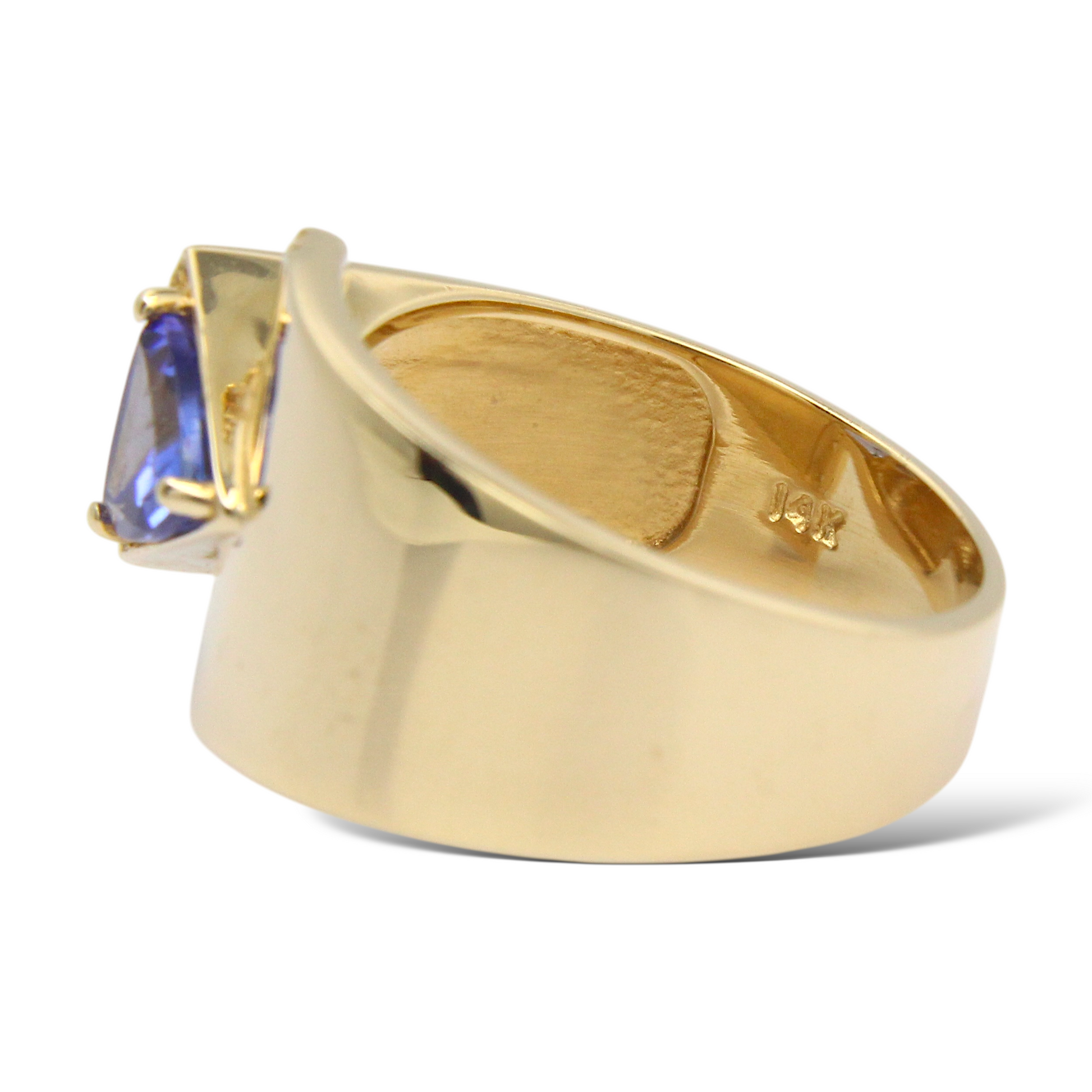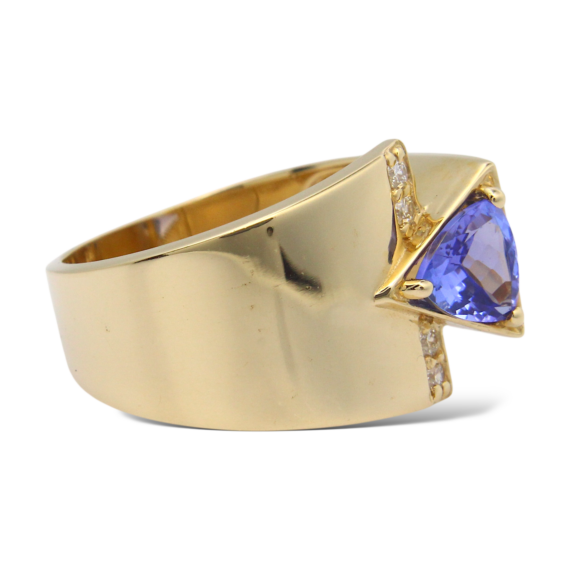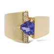 This bold and elegant statement ring is crafted in 14K yellow gold, showcasing a striking trillion-cut natural tanzanite displaying a vivid bluish-violet hue. The center gemstone is complemented by natural earth-mined round brilliant cut diamonds, arranged vertically in a modern channel-style layout that enhances the geometric structure and contemporary design of the piece. A refined and distinctive ring combining vibrant color with clean architectural lines.
