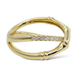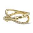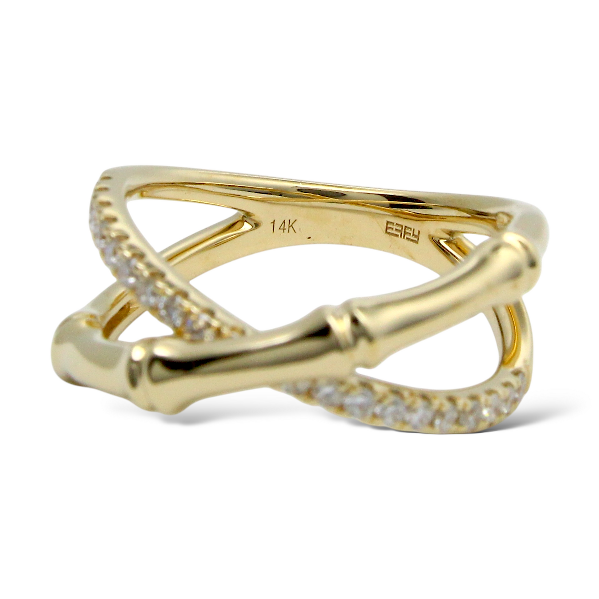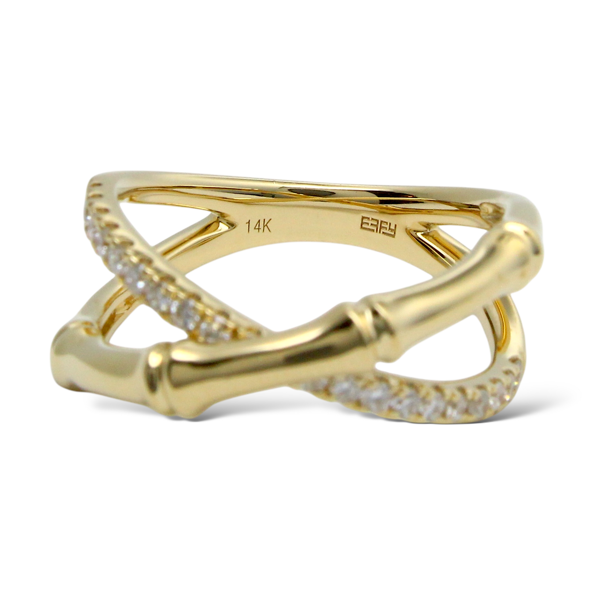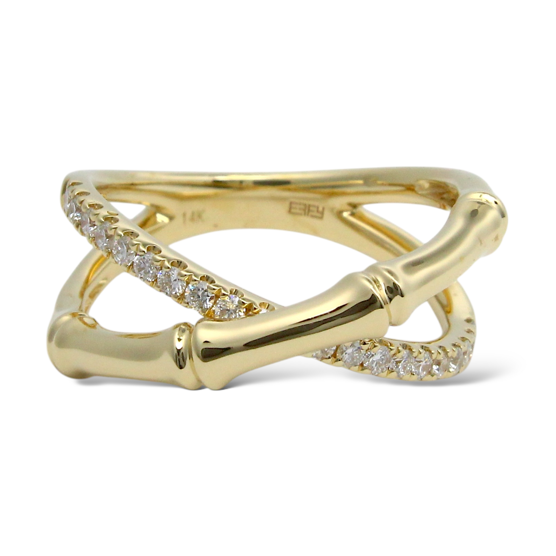 This elegant EFFY diamond ring is crafted in 14K yellow gold and features a distinctive bamboo-inspired crossover design. One band is accented with natural earth-mined round brilliant cut diamonds, while the opposing band remains sleek and highly polished, creating a refined contrast between brilliance and smooth gold surfaces. The sculptural bamboo motif reflects nature-inspired artistry combined with modern sophistication, exemplifying EFFY’s signature craftsmanship.