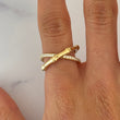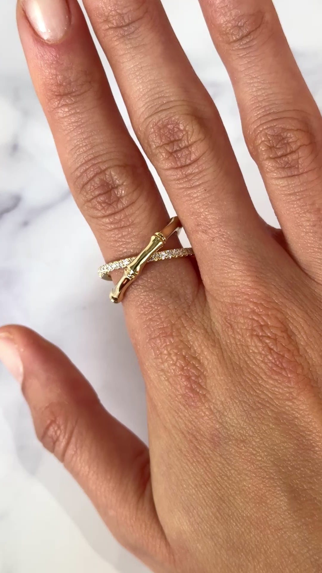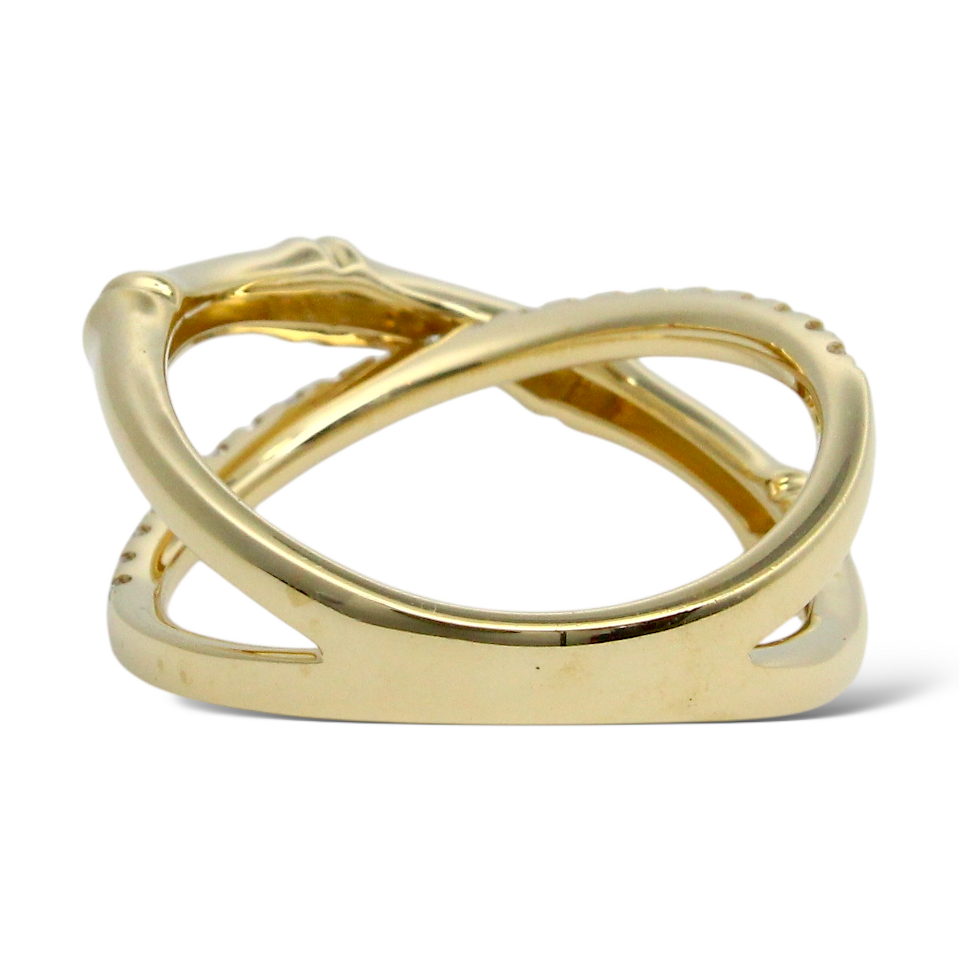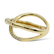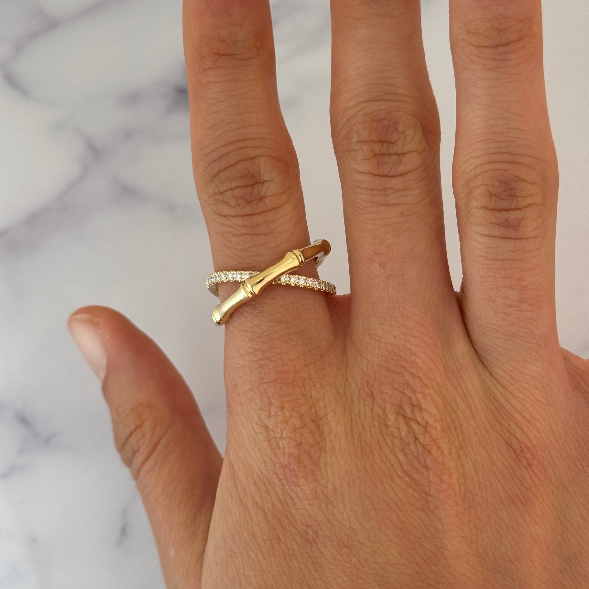 This elegant EFFY diamond ring is crafted in 14K yellow gold and features a distinctive bamboo-inspired crossover design. One band is accented with natural earth-mined round brilliant cut diamonds, while the opposing band remains sleek and highly polished, creating a refined contrast between brilliance and smooth gold surfaces. The sculptural bamboo motif reflects nature-inspired artistry combined with modern sophistication, exemplifying EFFY’s signature craftsmanship.