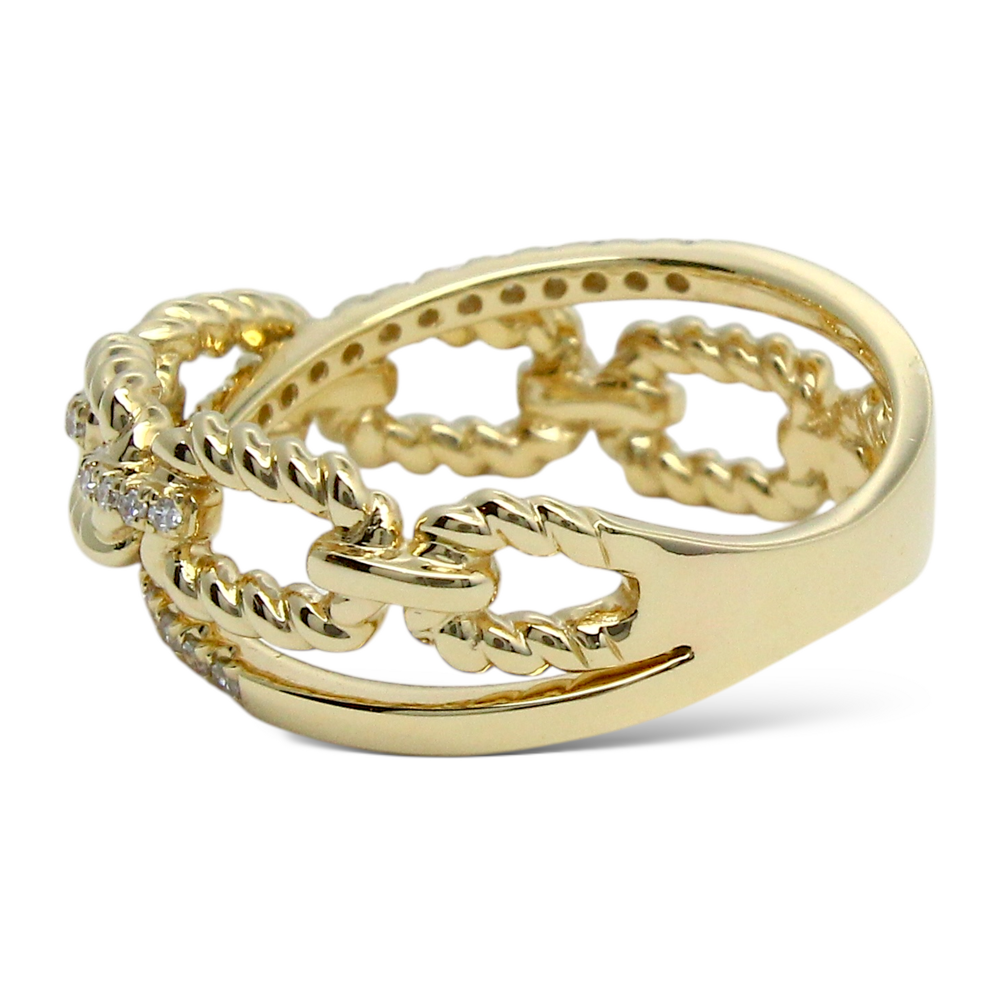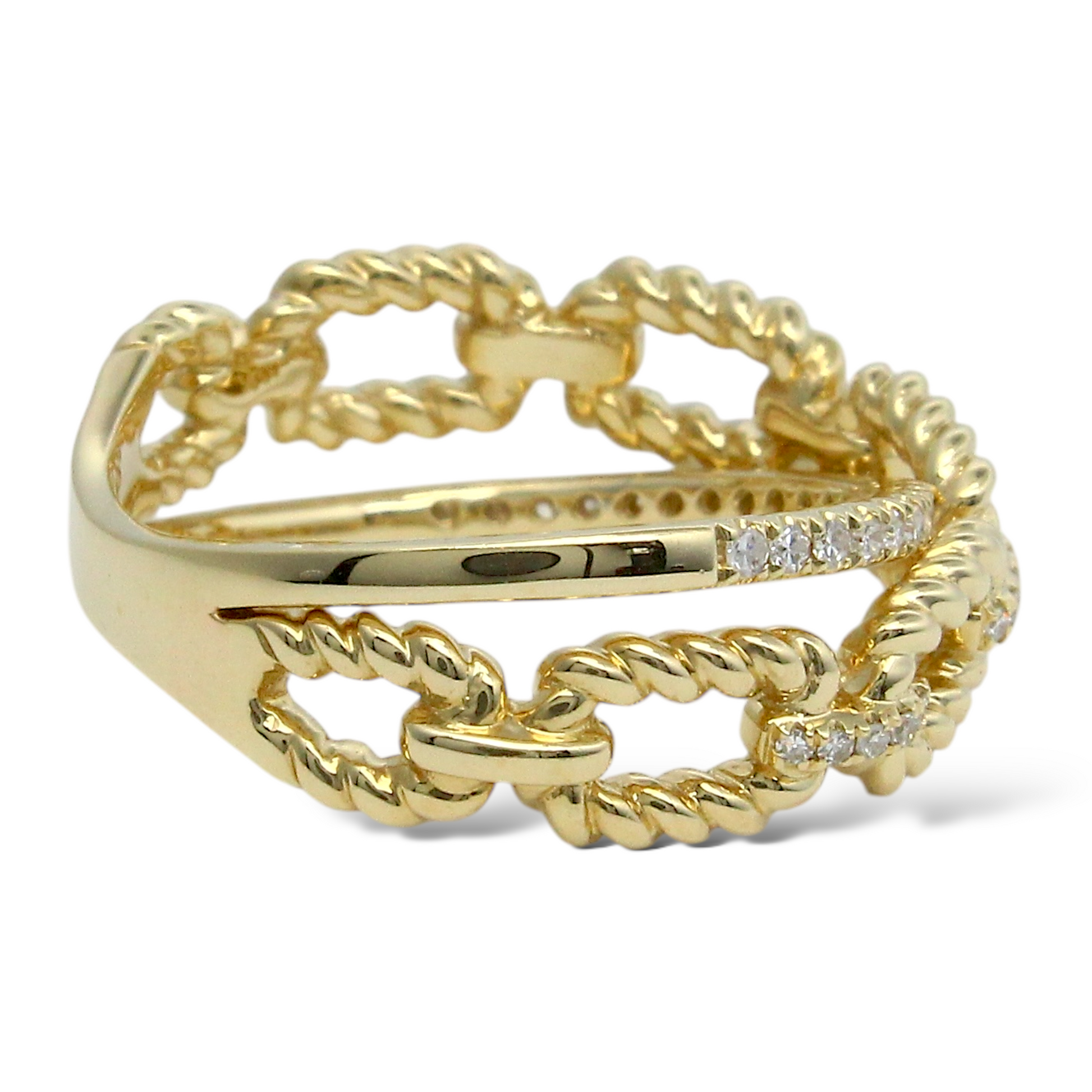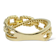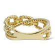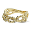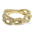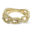 This stylish and modern EFFY ring is crafted in 14K yellow gold and showcases a distinctive twisted cable link motif. Alternating polished gold and diamond-set links create an elegant interplay of texture and brilliance. The natural earth-mined round brilliant cut diamonds add refined sparkle while complementing the sculptural rope-inspired design. A sophisticated and versatile piece that blends contemporary styling with timeless craftsmanship.