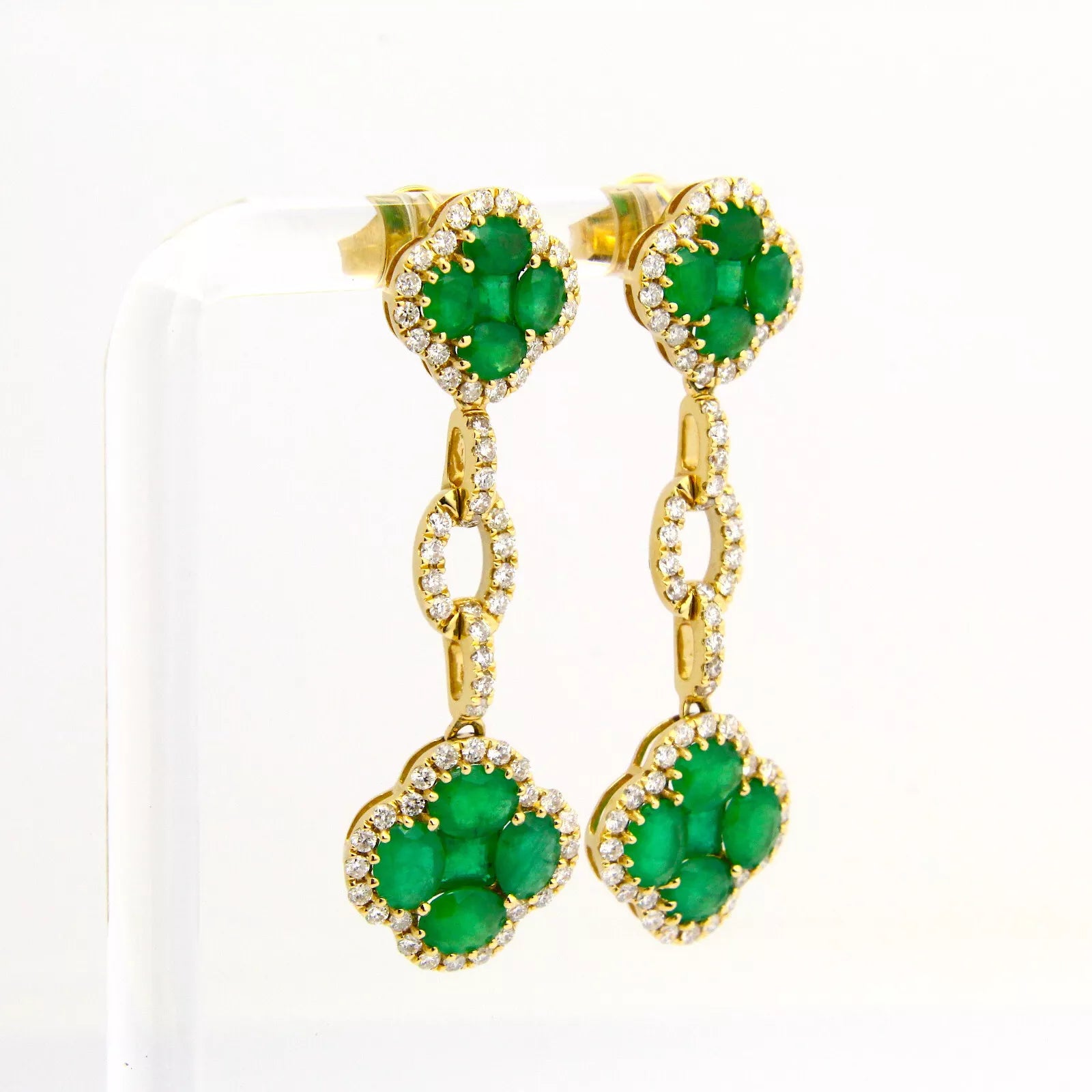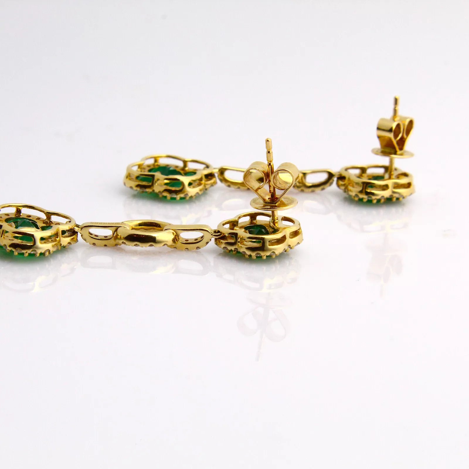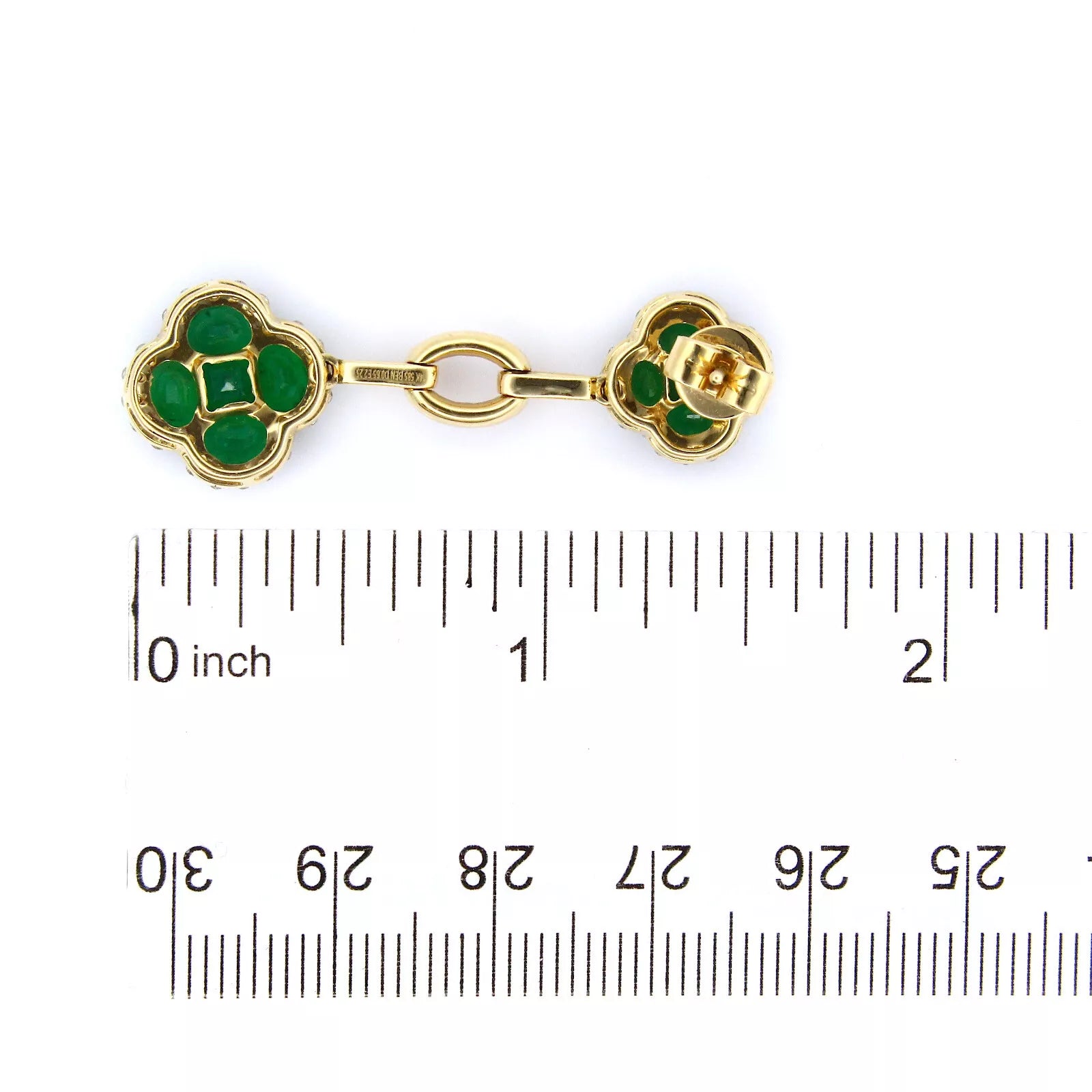 Estate Natural Diamond 0.65 CT and Emerald 2.25 CT 14K Yellow Gold Earrings Materials: 14K Yellow Gold Weight: 6.9 grams Stone: Green Emerald and Natural White Diamonds Measurements: 42 mm tall x 13.2 mm widest point Closure: Butterfly White Natural Diamond: Total Carat Weight: 0.65 CT Treatment: Not Enhanced (Natural) Shape: Round Green Emerald: Total Carat Weight: 2.25 CT |