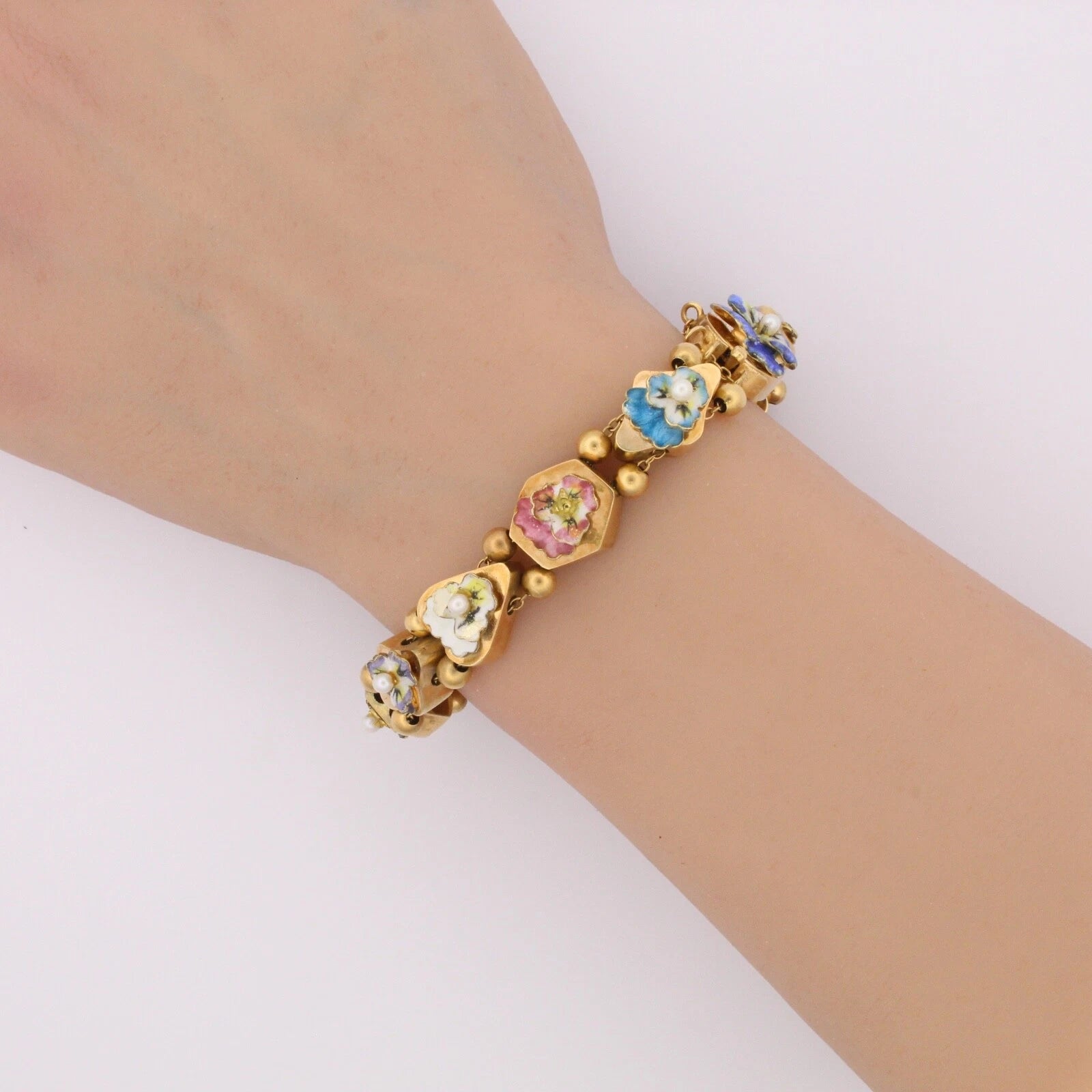 Estate Vintage Enamel 14k Rose Gold Pearl Flower Pansy Ladies Elegant Bracelet