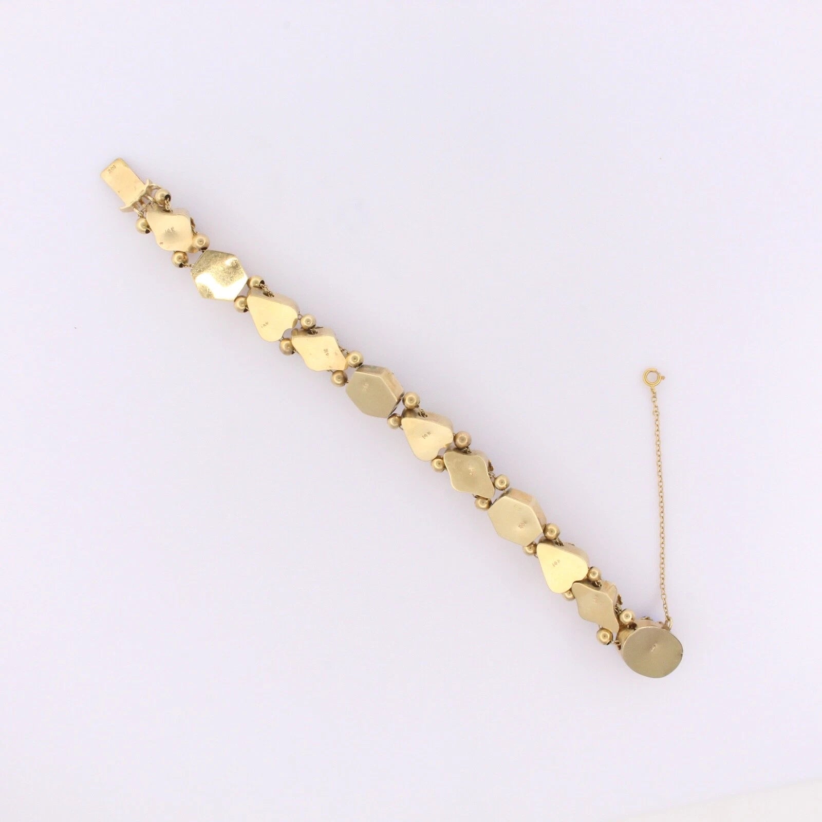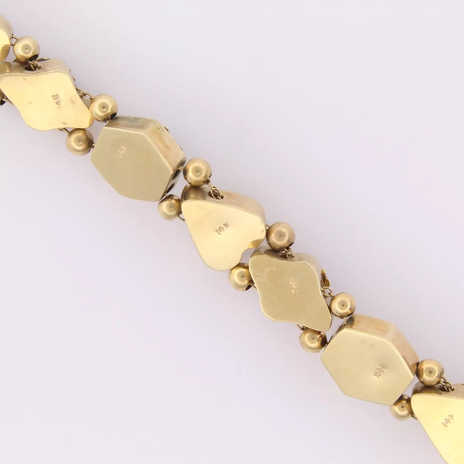 Materials: 14k Rose Gold, Cultured Pearl, Enamel Length: 7 inches Width: approx 0.5 inch Weight of bracelet: 31.5 grams |