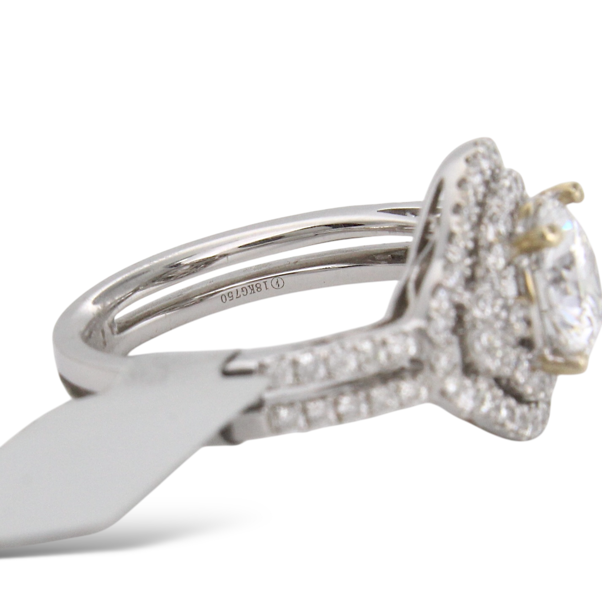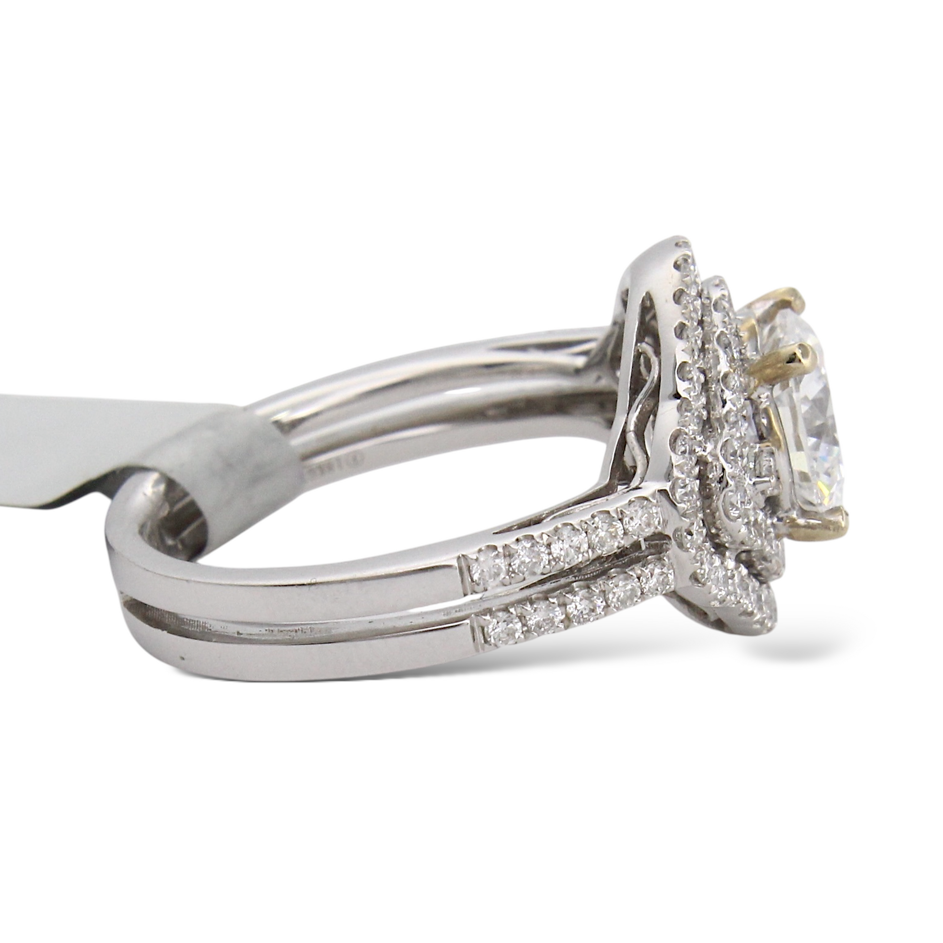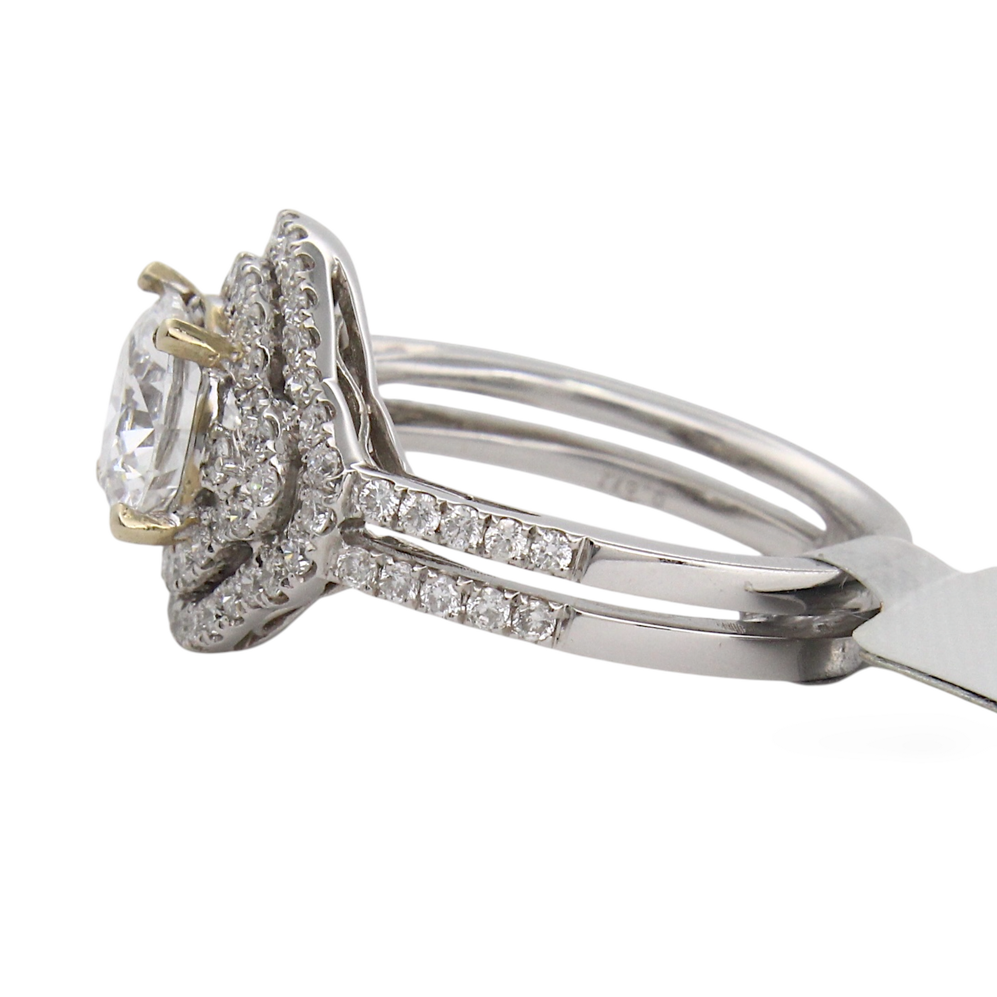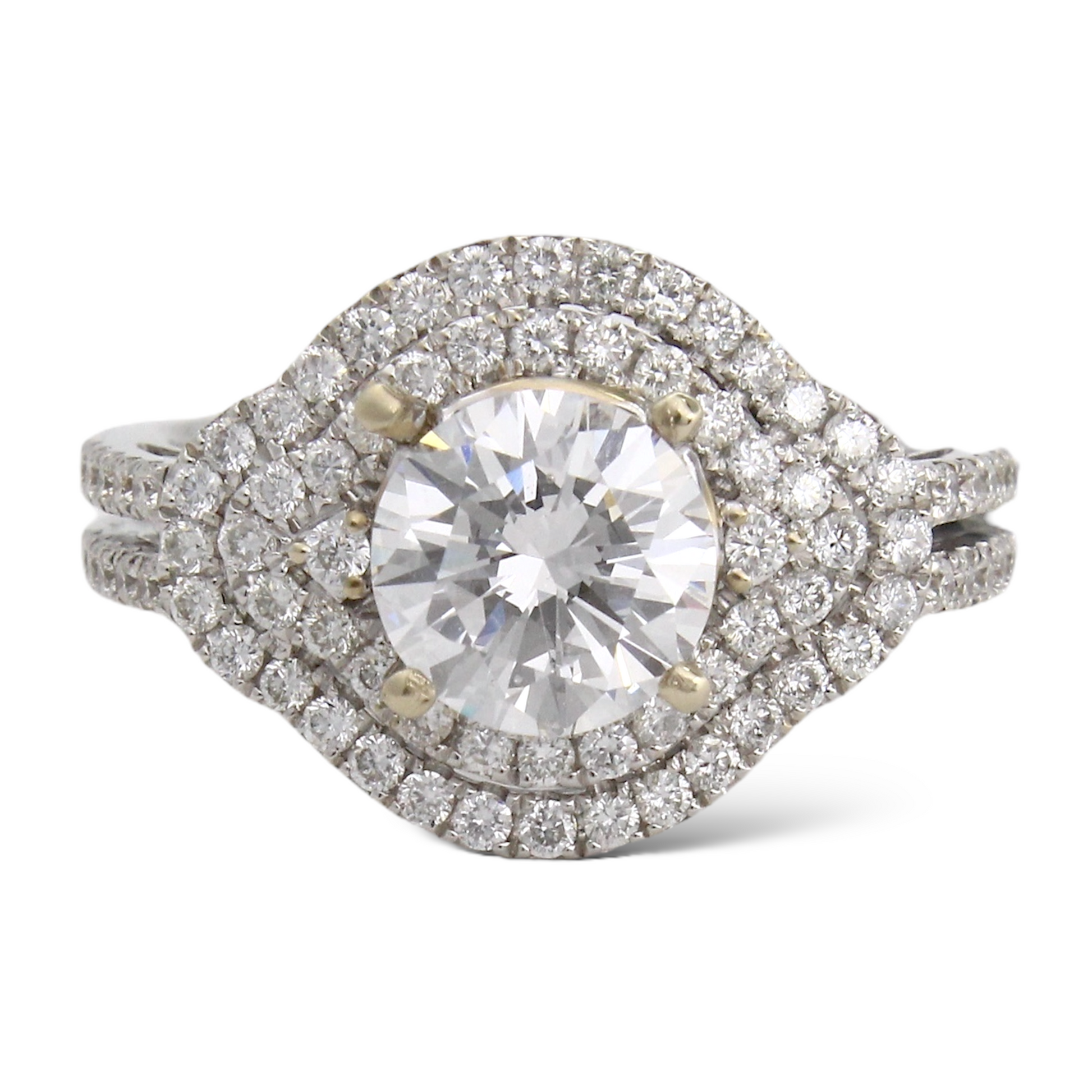 This elegant diamond halo ring showcases a GIA-certified 1.50 CT natural earth-mined round brilliant diamond at its center. The center stone features exceptional D color and SI1 clarity, offering a bright, crisp, and highly desirable appearance. Surrounding the center diamond is a triple-row halo of natural round brilliant cut diamonds, adding impressive sparkle and depth to the design. Additional natural earth-mined diamonds continue down the split shank, bringing the total side diamond weight to approximately 0.85 CT. The side stones display G–H color and SI clarity, beautifully complementing the brilliance of the center stone.