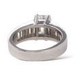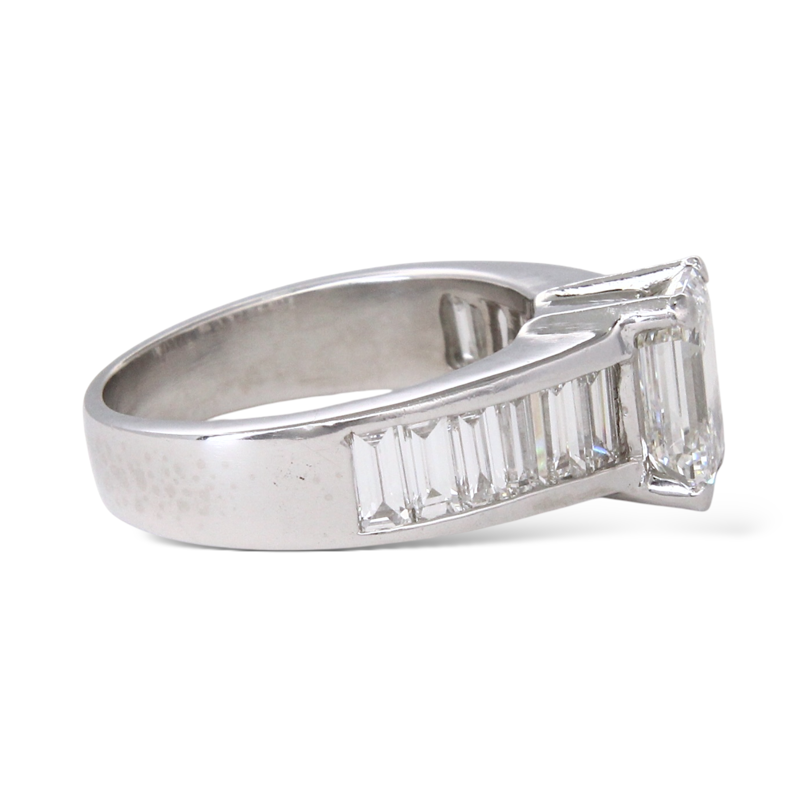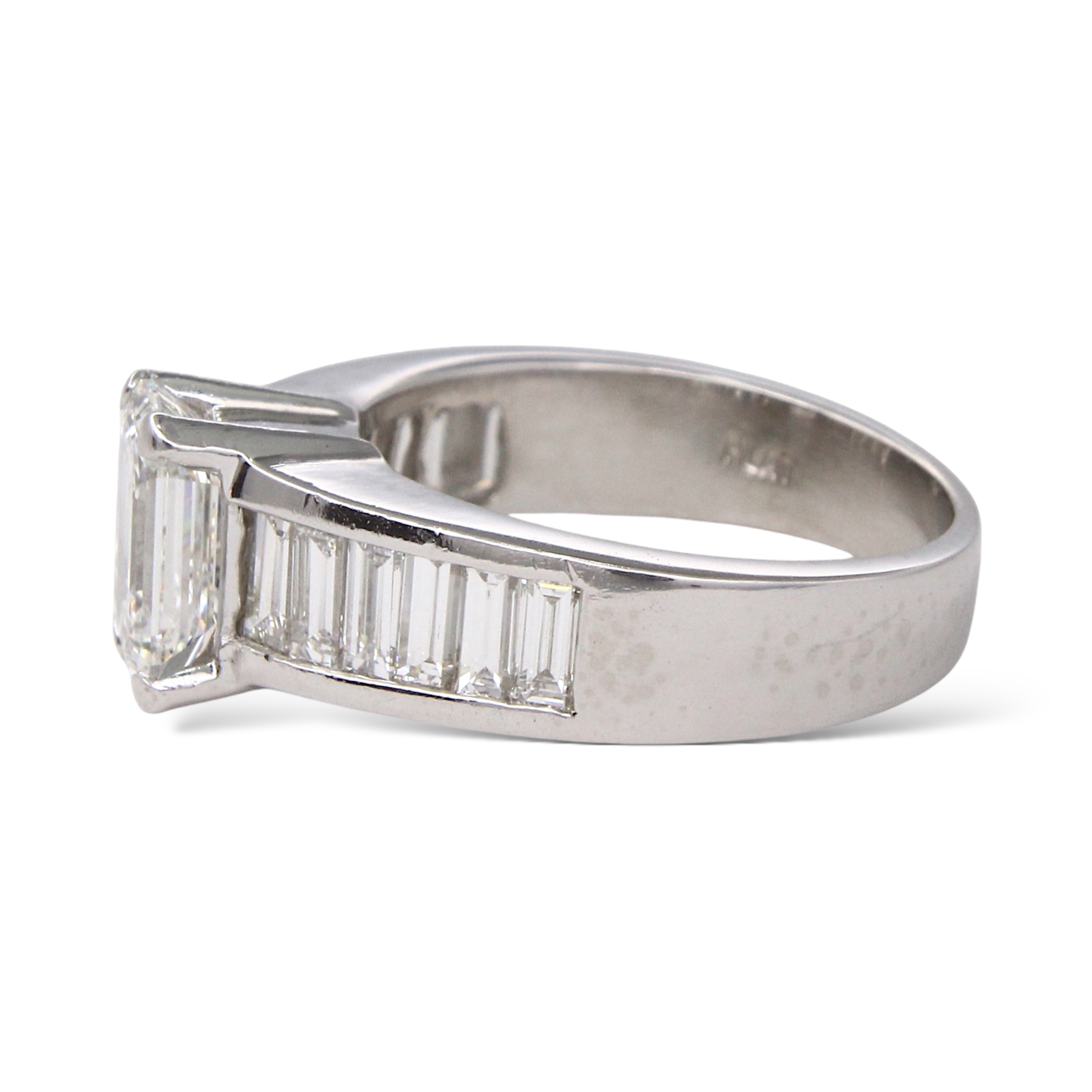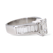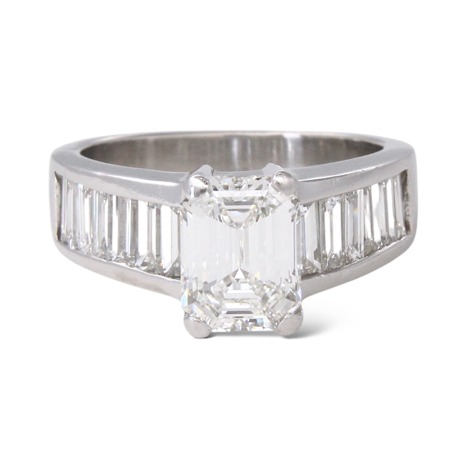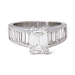 This elegant ring is crafted in platinum and showcases a striking GIA-certified emerald cut diamond at the center. The center stone weighs 1.59 carats, graded G color and VS1 clarity. Flanking the center diamond are baguette-cut natural earth-mined white diamonds, totaling approximately 1.25 carats, adding clean lines and refined brilliance. A timeless platinum design that highlights the geometry and clarity of the emerald cut, complemented by classic baguette side stones.