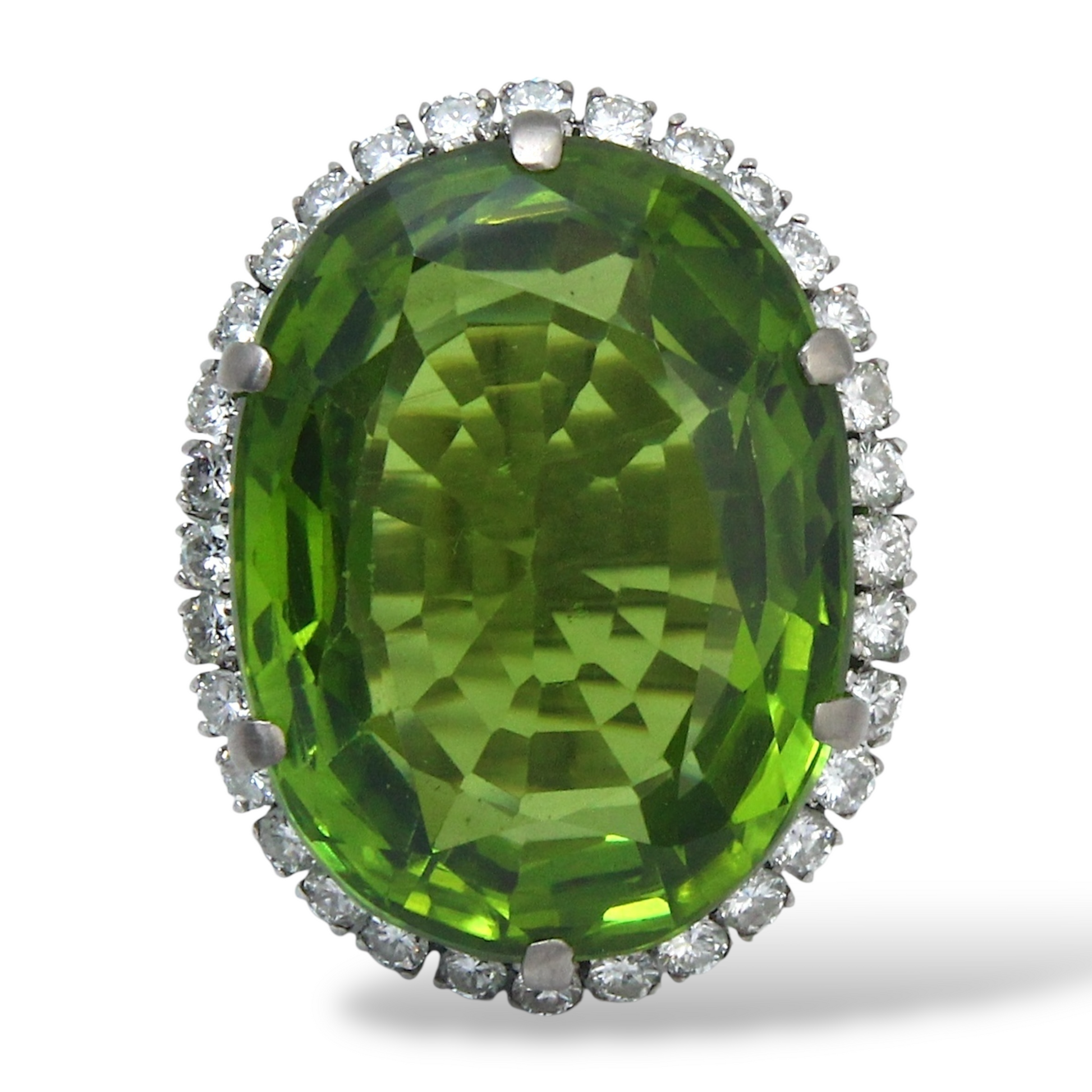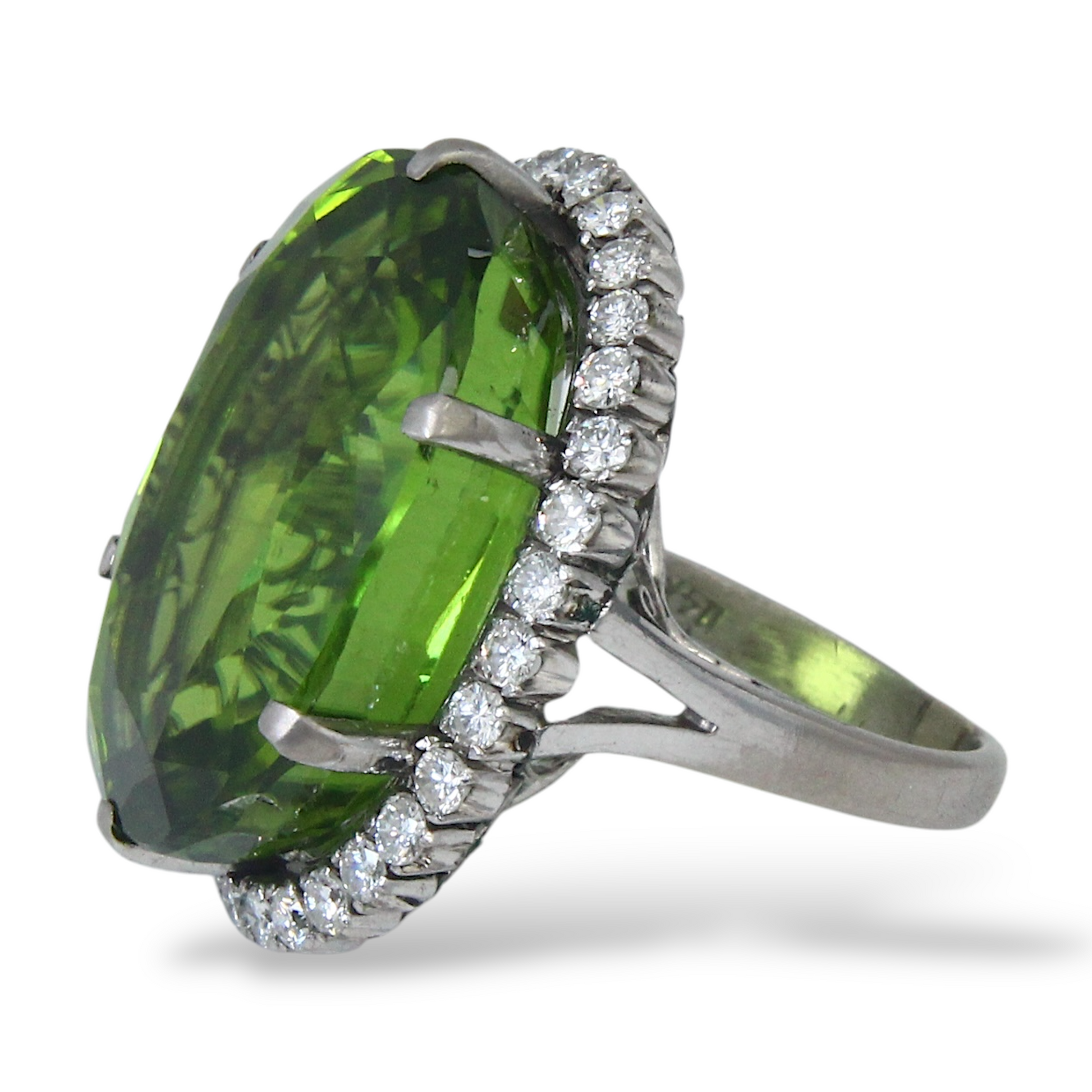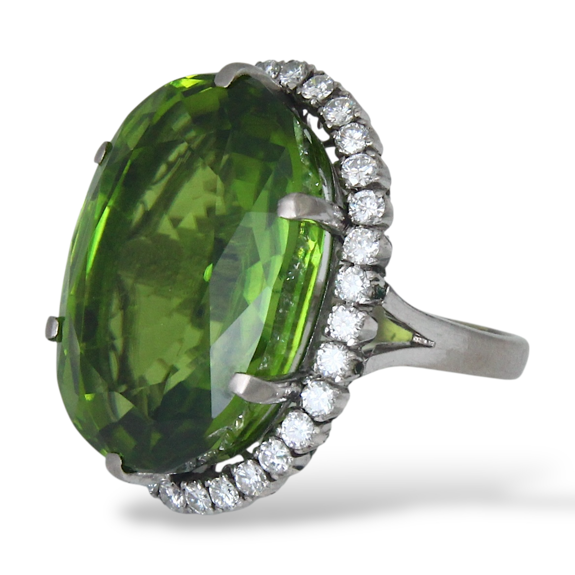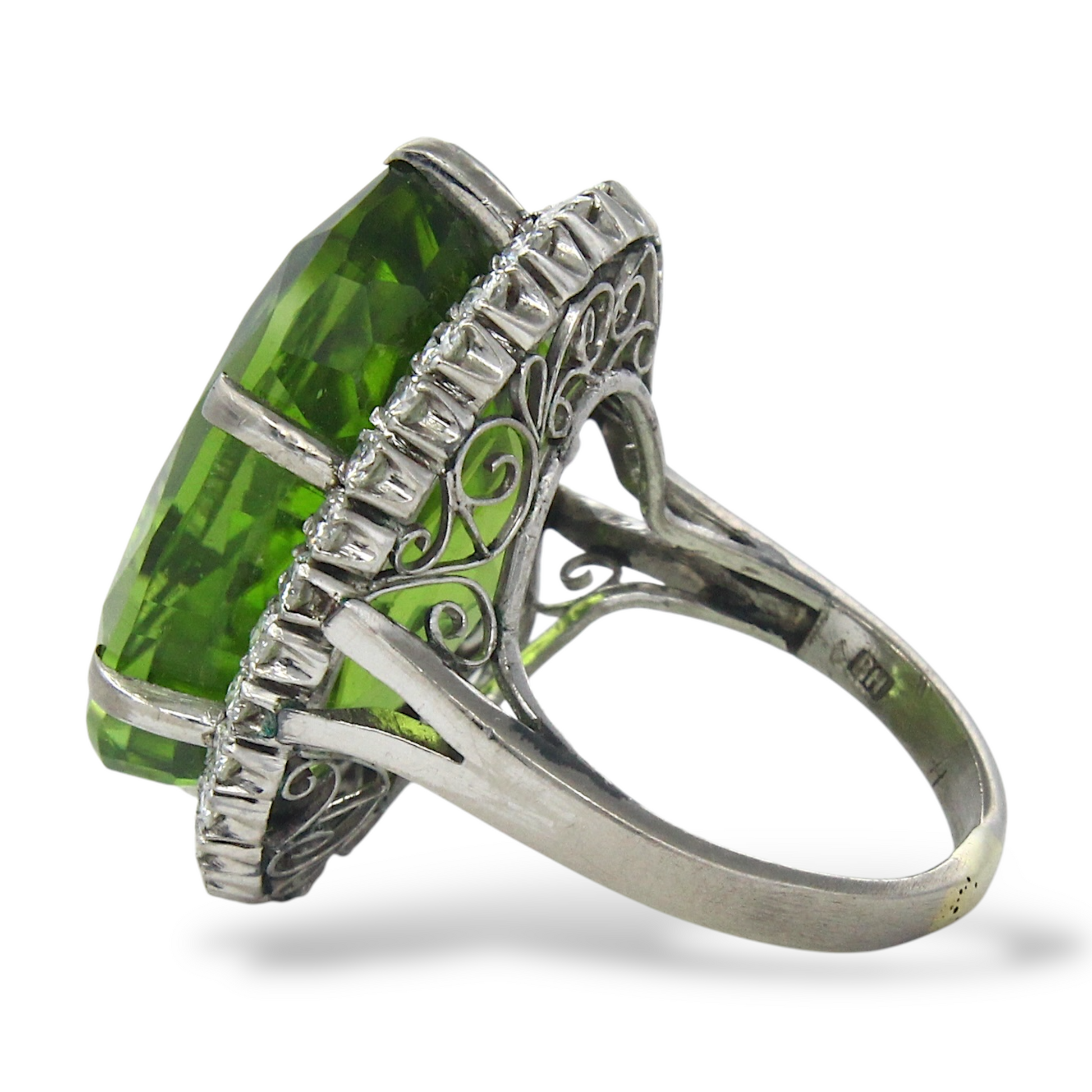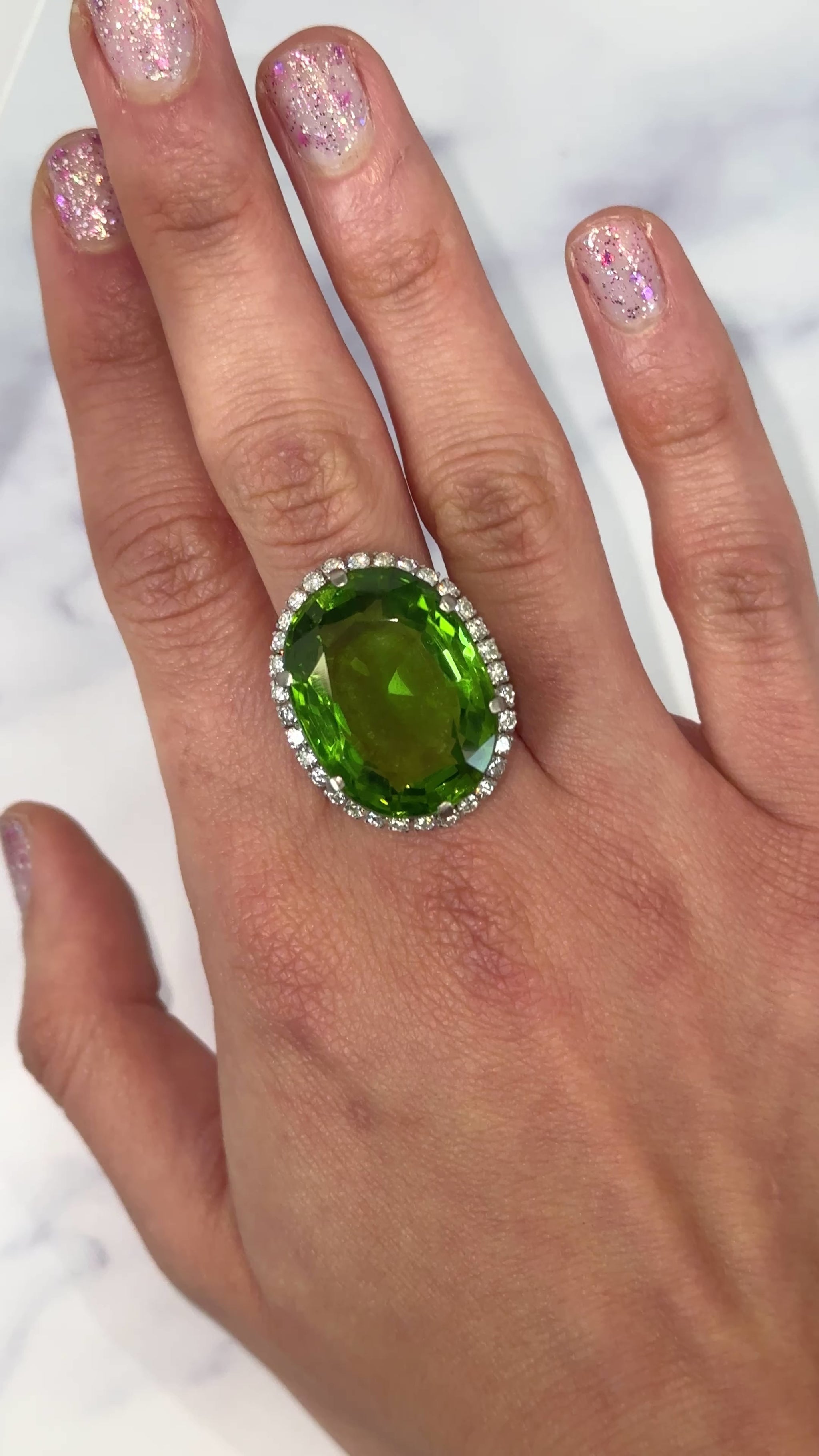 This striking ring is crafted in solid 14K white gold and features a commanding GIA-certified natural peridot in an oval cut, weighing approximately 30.00 carats. The peridot displays a vivid yellowish-green hue with excellent transparency and is surrounded by a halo of natural earth-mined white diamonds in round brilliant cuts, adding refined contrast and brilliance. Elegant in scale and presence, this piece showcases a bold gemstone centerpiece balanced by classic diamond accents for a timeless, high-impact design.