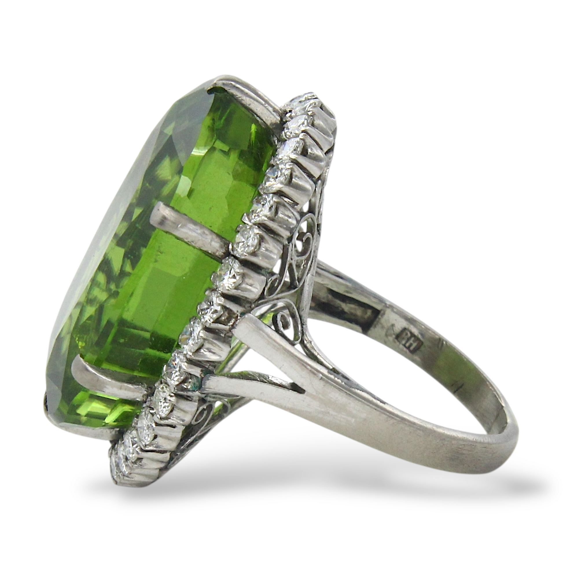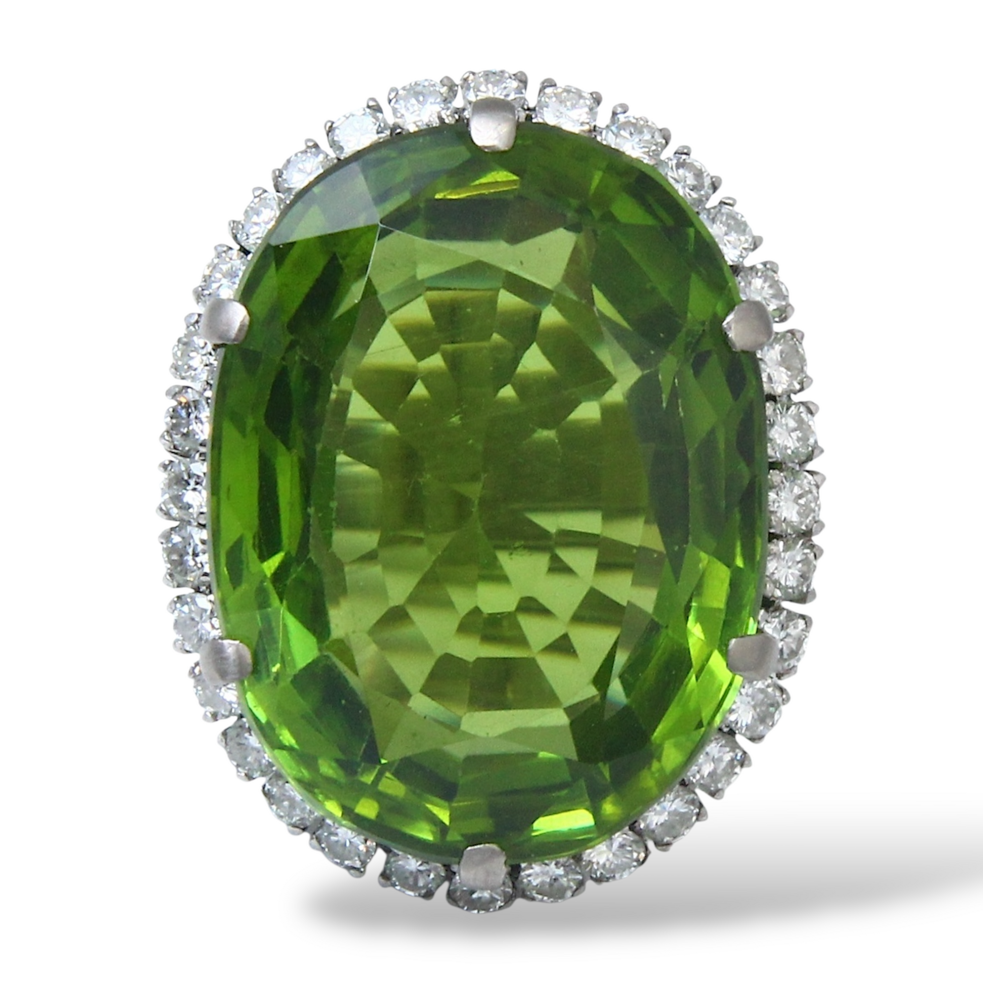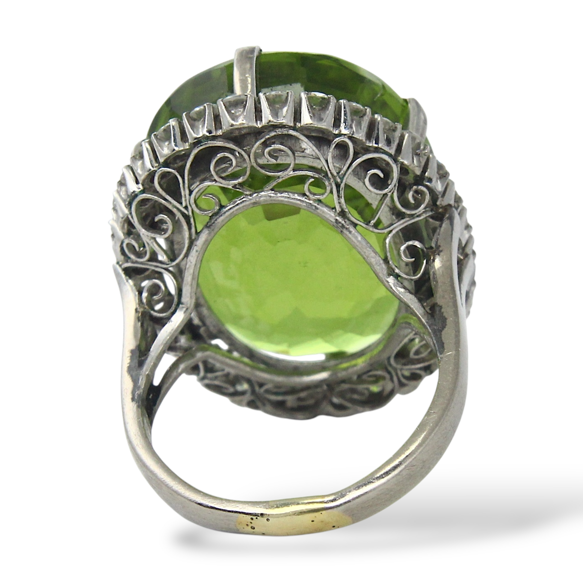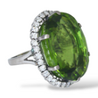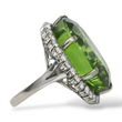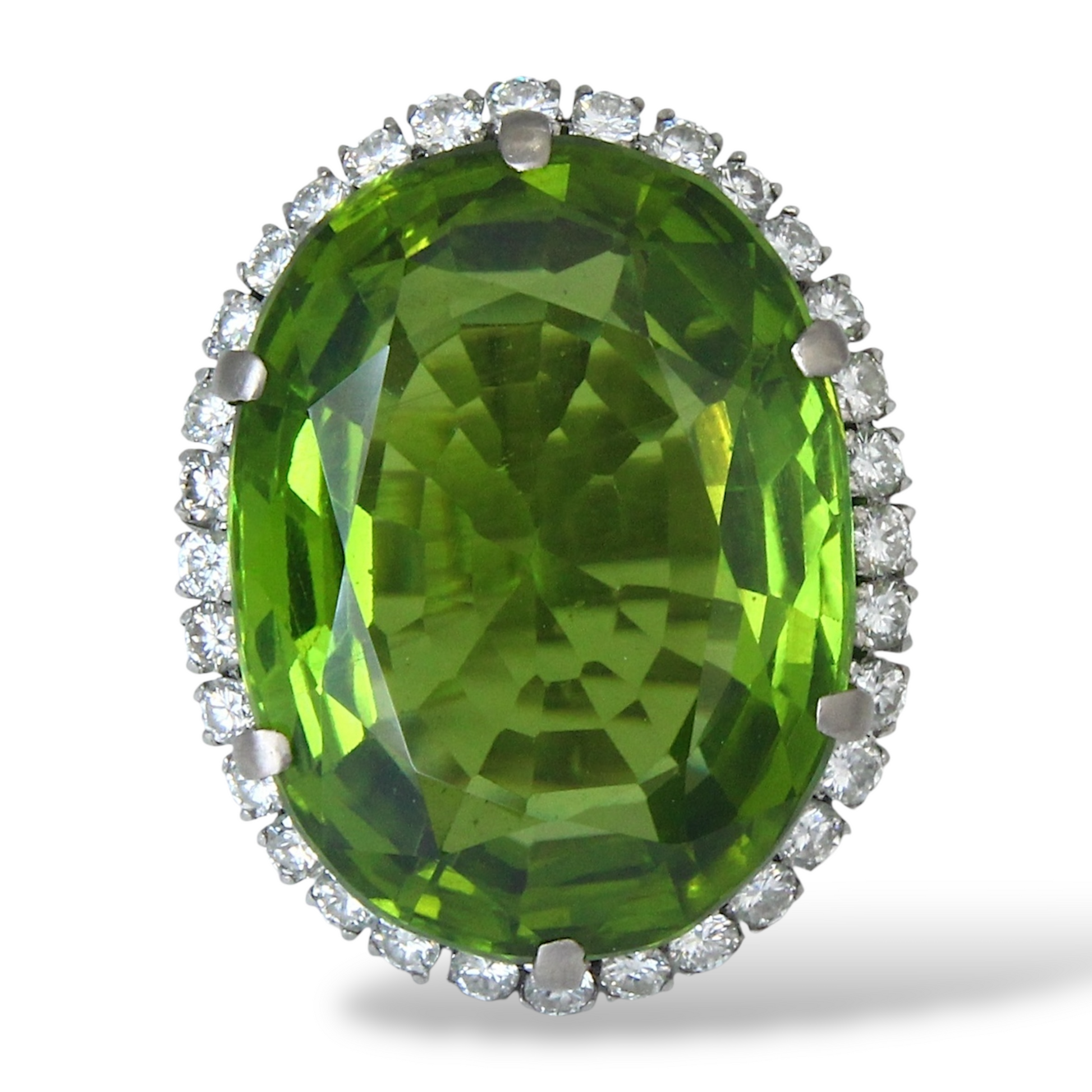This striking ring is crafted in solid 14K white gold and features a commanding GIA-certified natural peridot in an oval cut, weighing approximately 30.00 carats. The peridot displays a vivid yellowish-green hue with excellent transparency and is surrounded by a halo of natural earth-mined white diamonds in round brilliant cuts, adding refined contrast and brilliance. Elegant in scale and presence, this piece showcases a bold gemstone centerpiece balanced by classic diamond accents for a timeless, high-impact design.