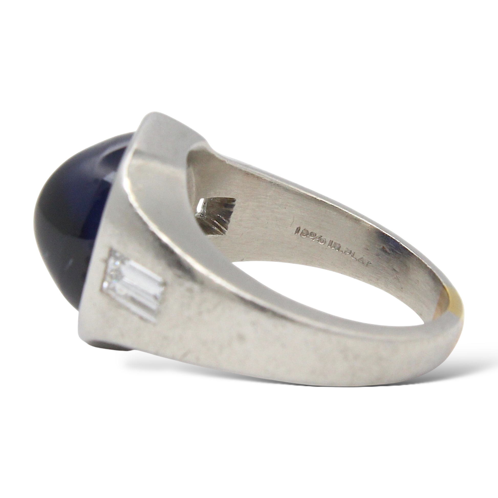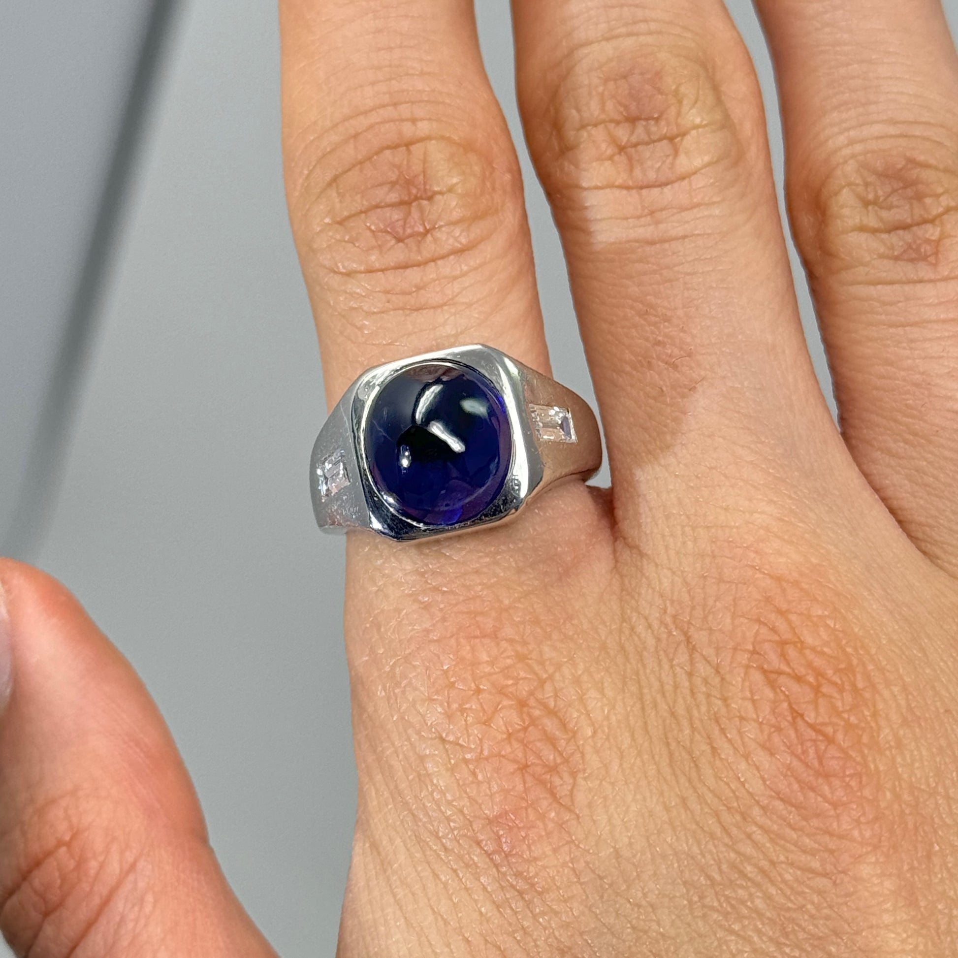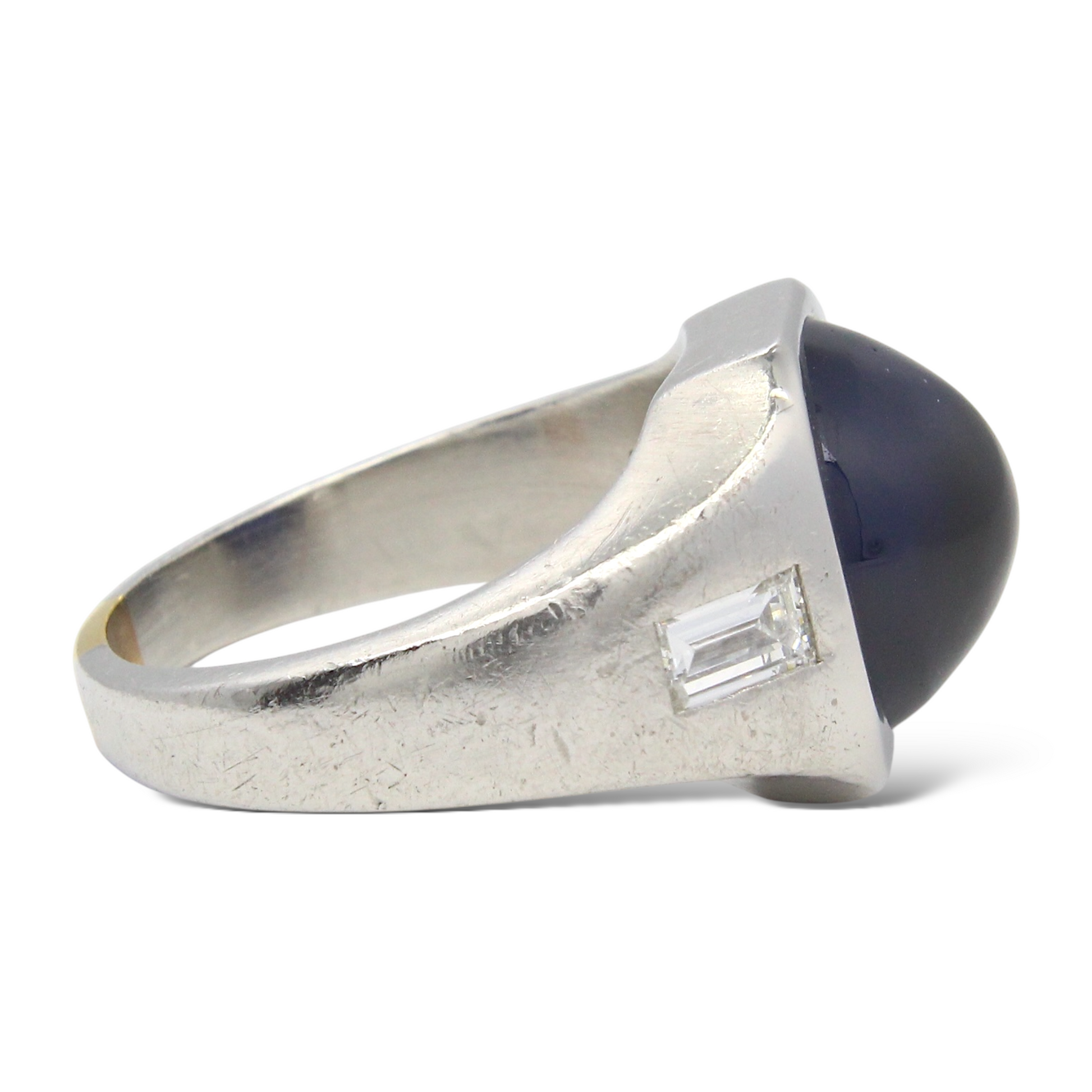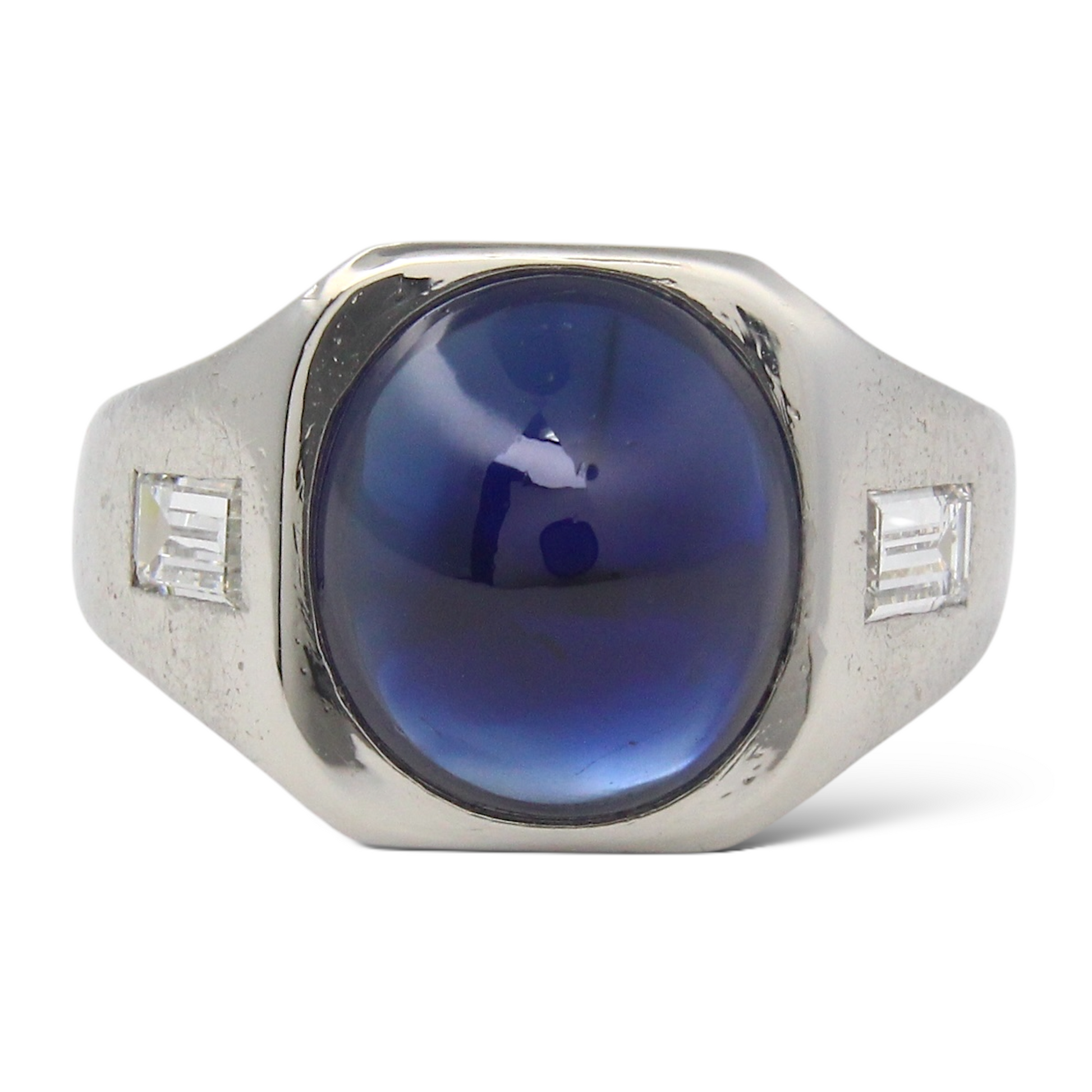 This platinum ring showcases a striking natural blue sapphire cut in a smooth oval cabochon style, displaying beautiful transparency and depth of color. The sapphire measures approximately 11.80 x 10.60 x 6.25 mm and originates from Cambodia. Two natural earth-mined baguette-cut diamonds flank the center stone, each bezel-set to add refined brilliance and clean Art Deco geometry to the design. A bold and elegant piece with timeless architectural character.