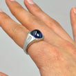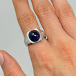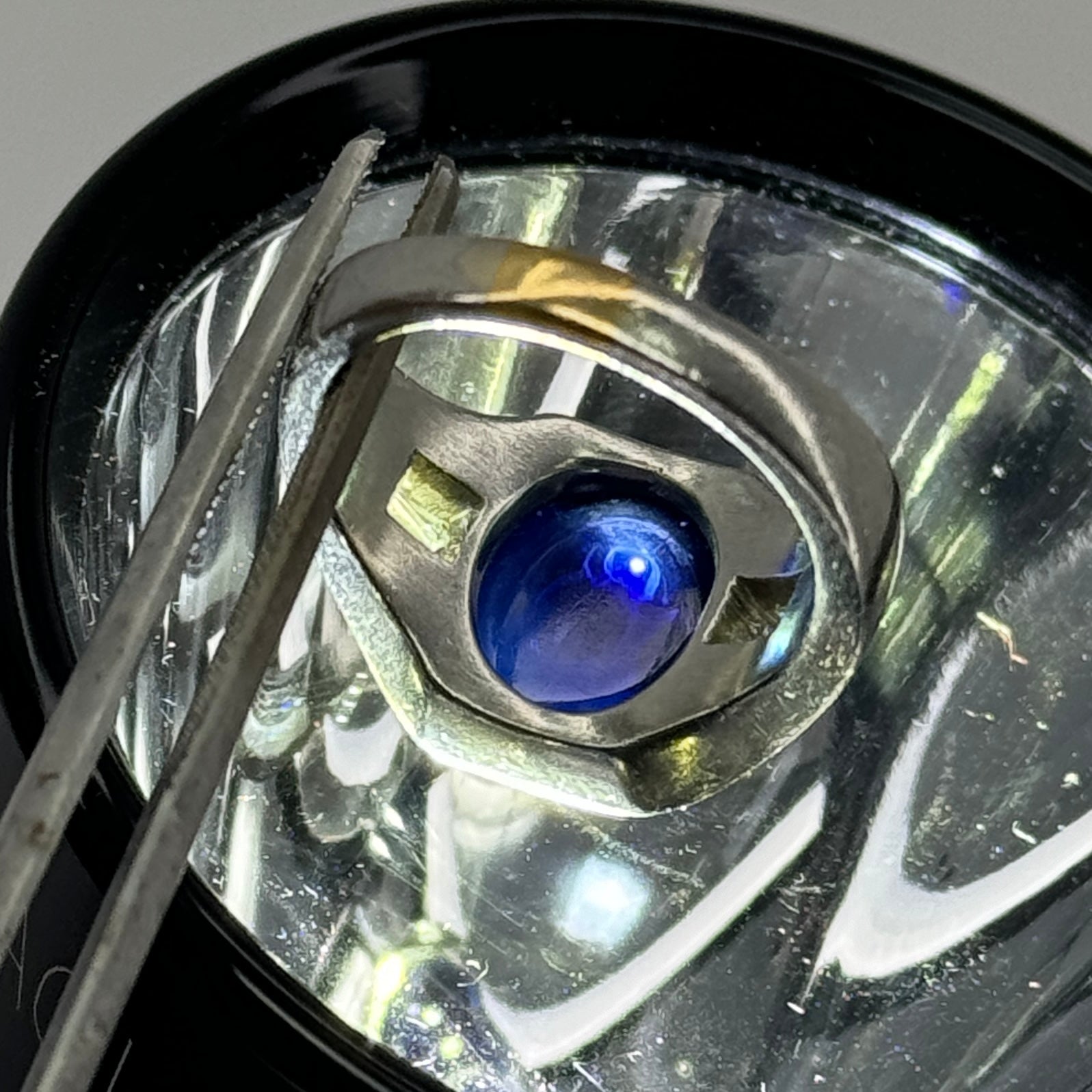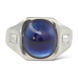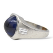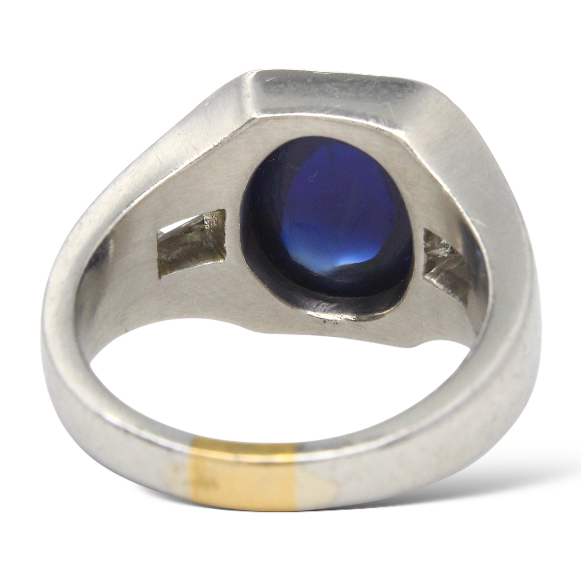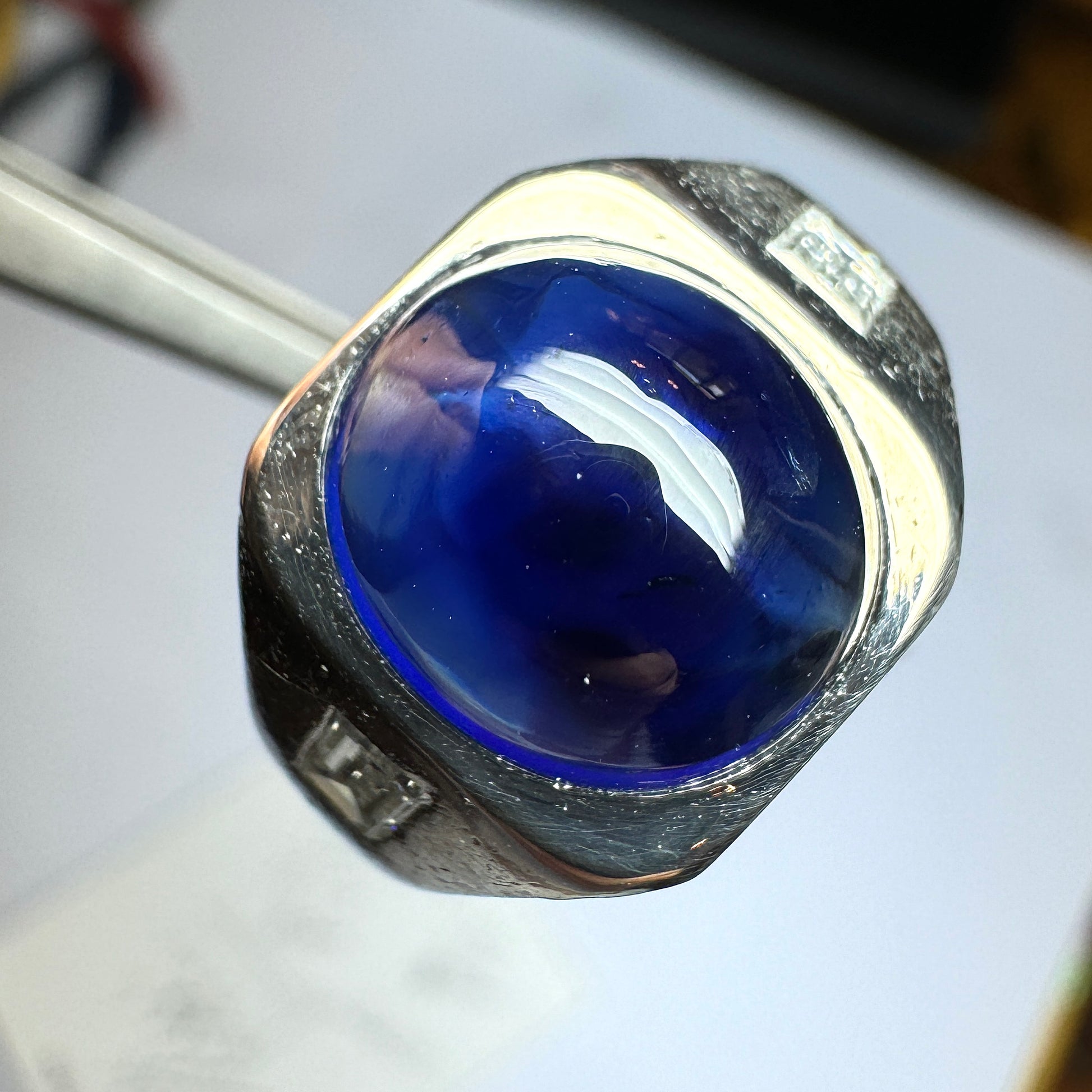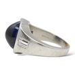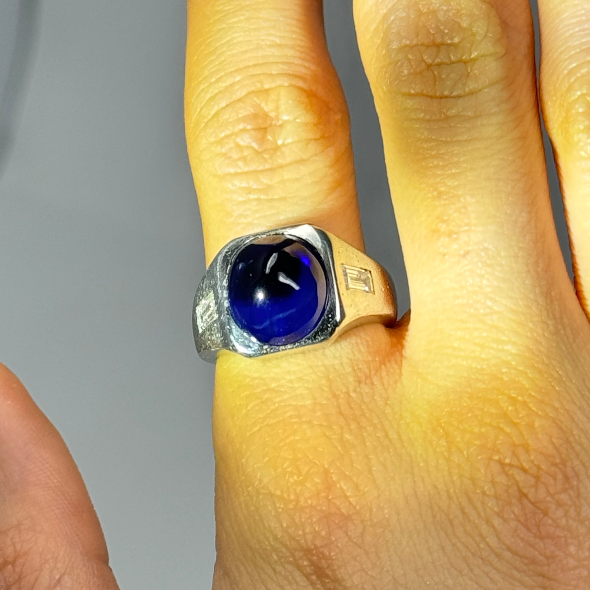 This platinum ring showcases a striking natural blue sapphire cut in a smooth oval cabochon style, displaying beautiful transparency and depth of color. The sapphire measures approximately 11.80 x 10.60 x 6.25 mm and originates from Cambodia. Two natural earth-mined baguette-cut diamonds flank the center stone, each bezel-set to add refined brilliance and clean Art Deco geometry to the design. A bold and elegant piece with timeless architectural character.