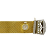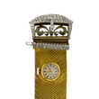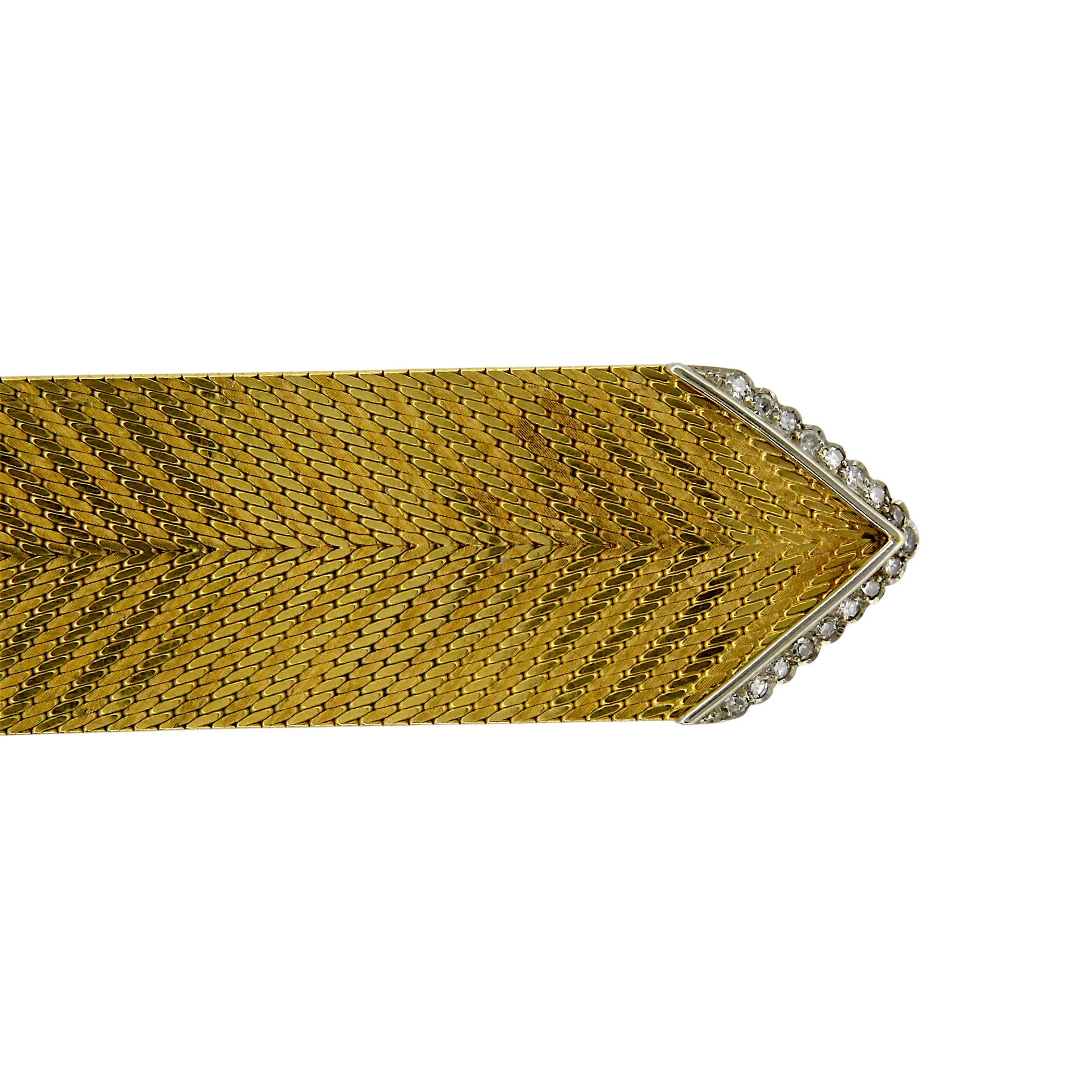 The watch is fitted with a solid 18K yellow gold woven mesh bracelet, secured with a jewelry-style clasp in 18K white gold, adorned with diamonds for a refined finish. The belt bracelet will fit up to a 7 inch wrist and can be sized down to a 6.75 inch or 6.5 inch bracelet using the sizing mechanism. The bracelet was made in Milano, Italy with the jewelers hallmark "M R",