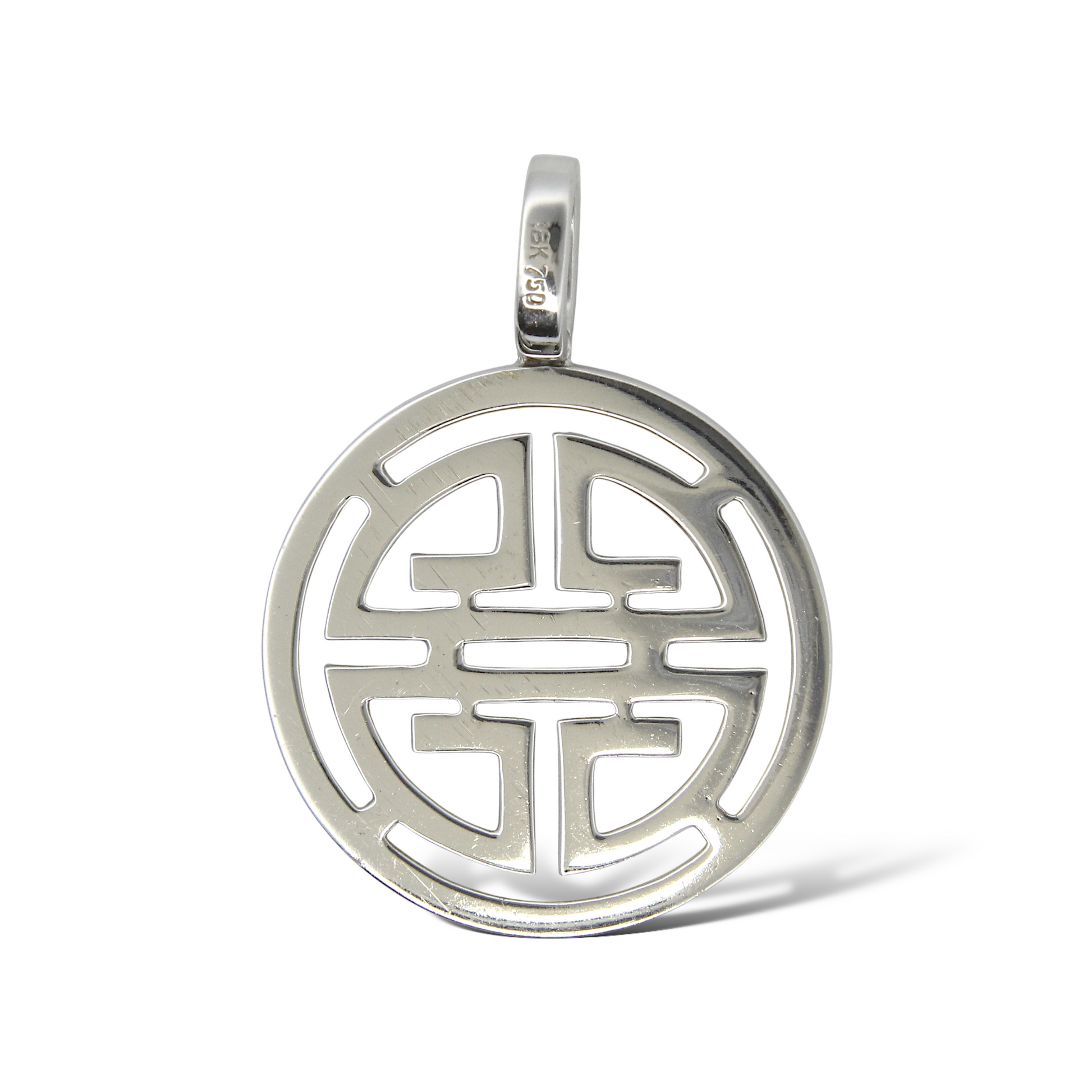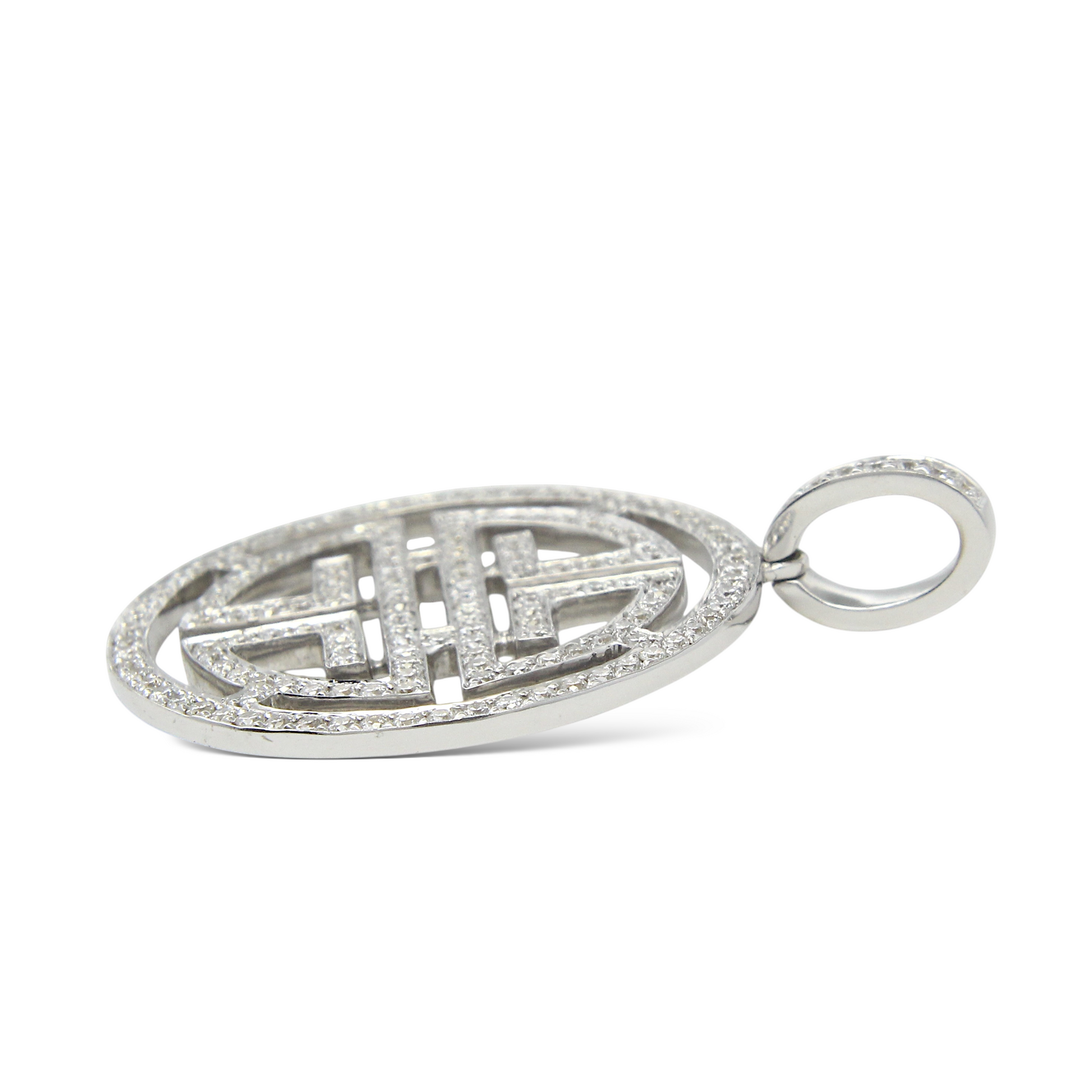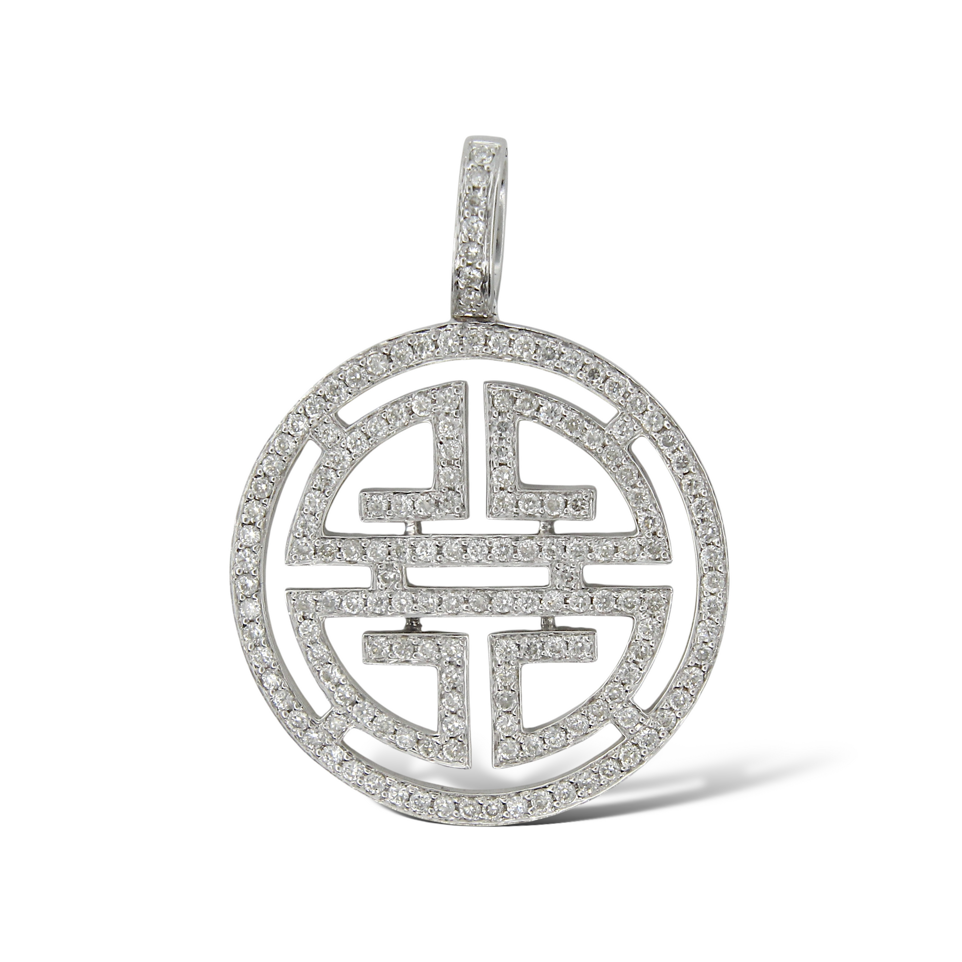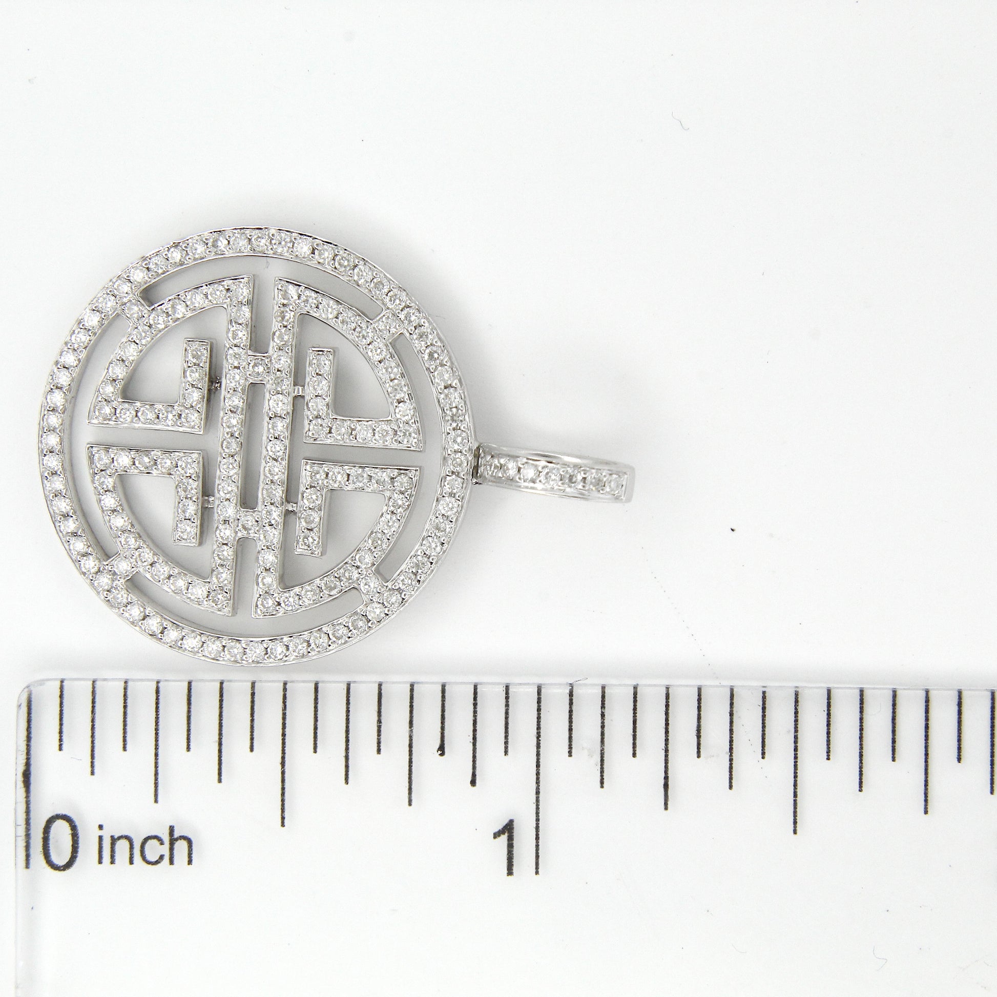Elegant 18K white gold pendant featuring the traditional Chinese “Double Happiness” symbol, set with approximately 0.85 carats of natural earth-mined round brilliant cut diamonds. The diamonds are bright white, well-matched, and pavé-set to emphasize the intricate design. The pendant measures 30 mm in height (including loop) by 21.8 mm in width, and has a thickness of 1.2 mm. Weighing 4.2 grams, this piece is ideal as a wedding, anniversary, or celebratory gift.