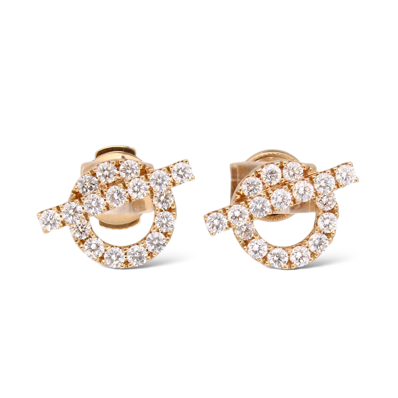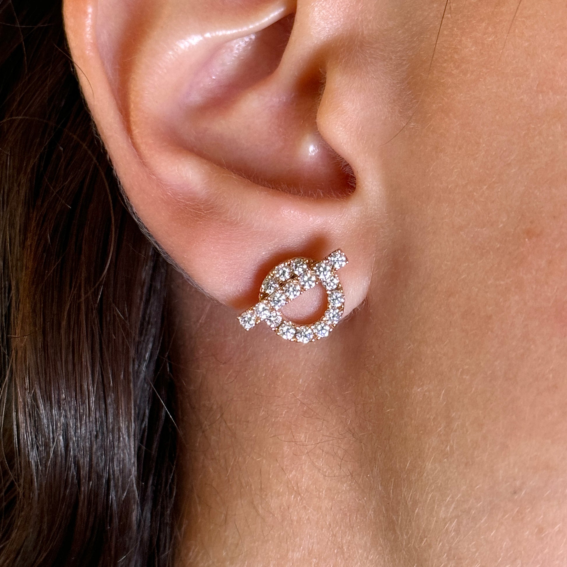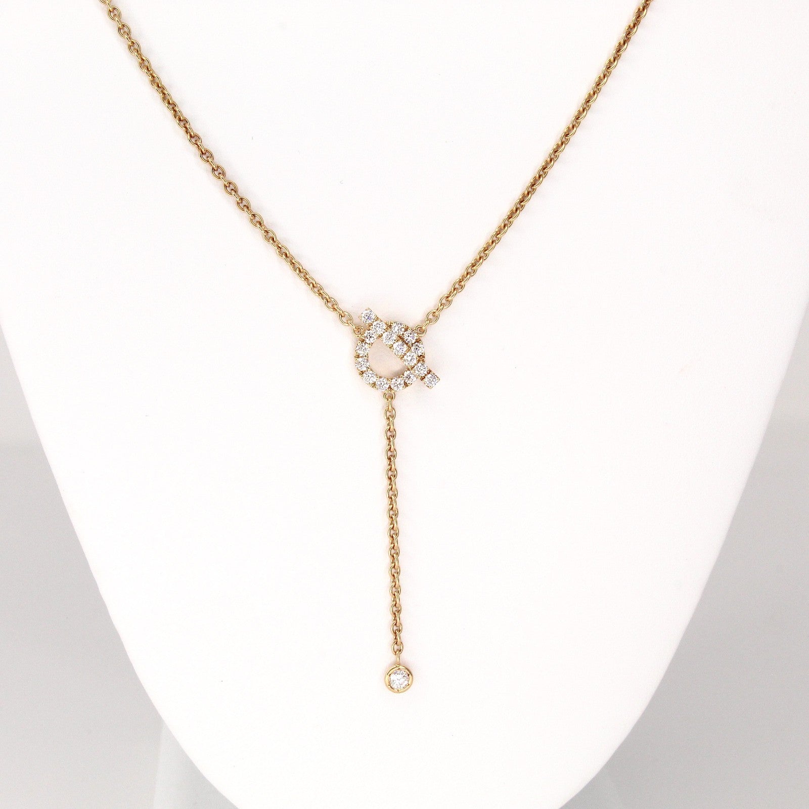 This elegant Hermès Finesse set features a matching necklace and earrings crafted in rich 18K rose gold. The necklace showcases a refined lariat-style drop centered around the iconic Hermès Finesse motif, adorned with brilliant-cut natural diamonds that add exceptional sparkle. The matching earrings echo the same motif, providing a coordinated and sophisticated look. The set is in excellent pre-owned condition. No dents. Minor hairline scratches from previous use.
