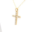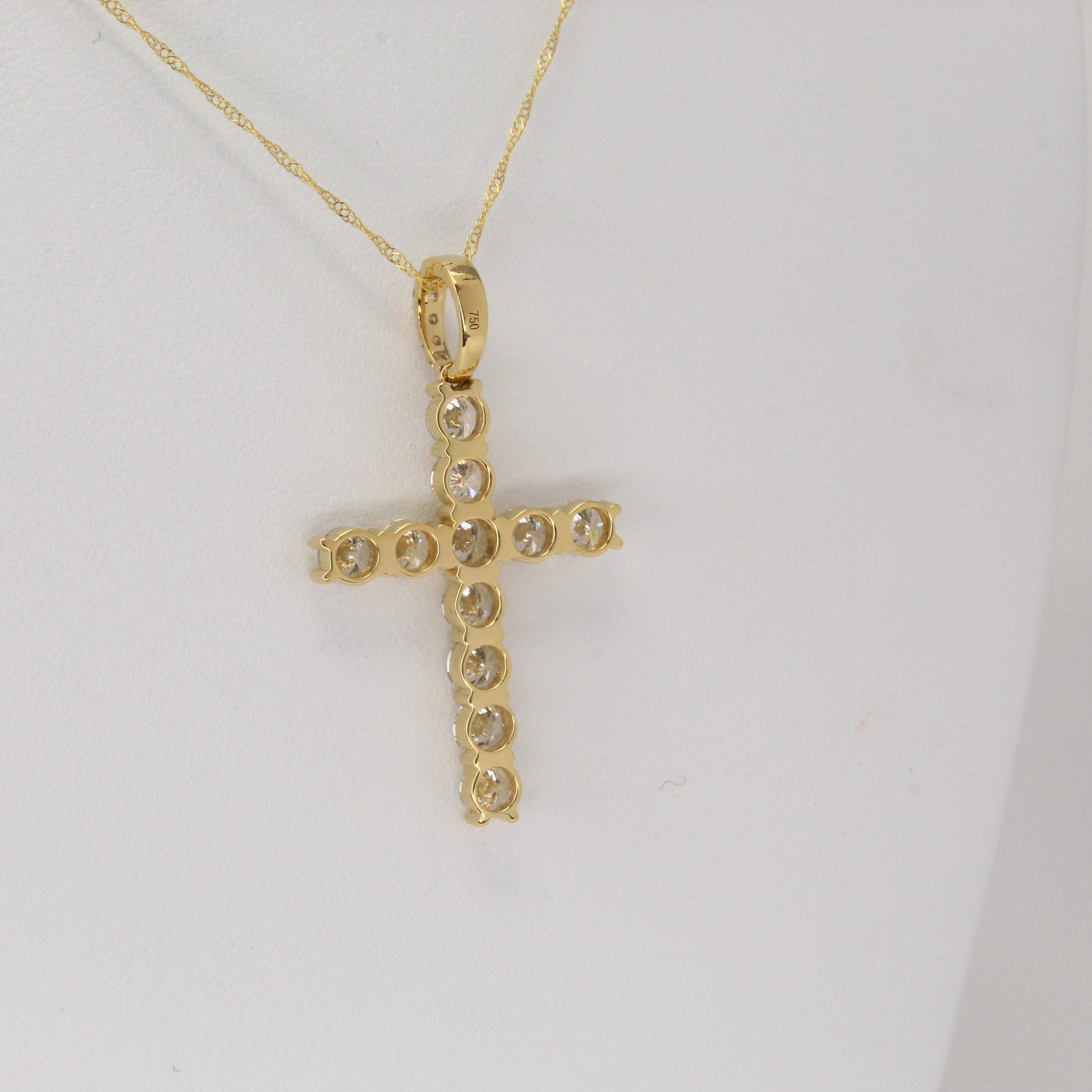 An elegant diamond cross pendant crafted in 18K yellow gold, featuring a total of approximately 3.1 carats of natural earth-mined round brilliant cut diamonds. The diamonds display a beautiful sparkle with I-J color and SI2 clarity. The cross measures 39 mm in length and is paired with a matching gold chain, making it ready to wear or present as a meaningful gift.