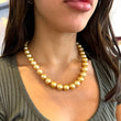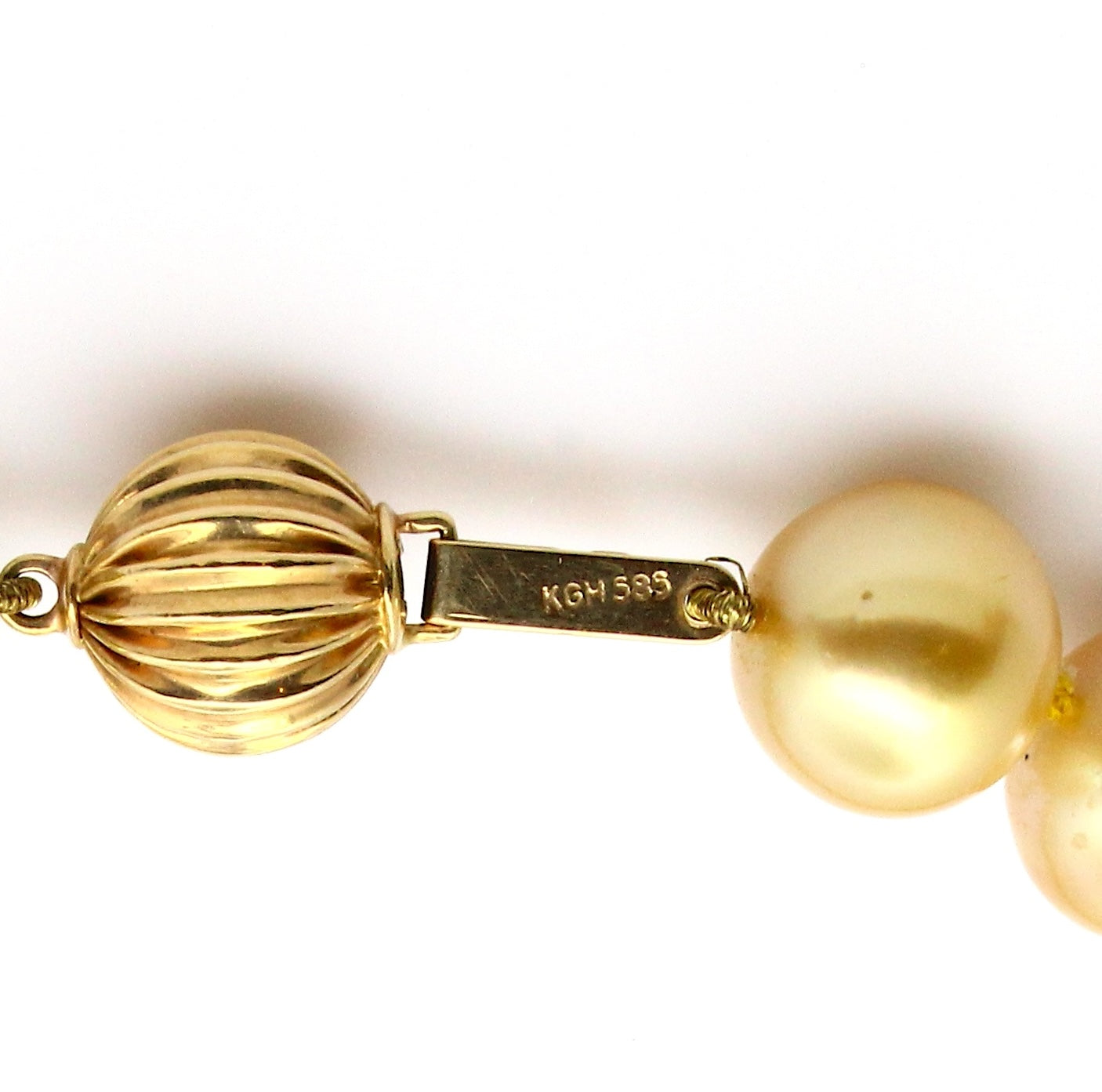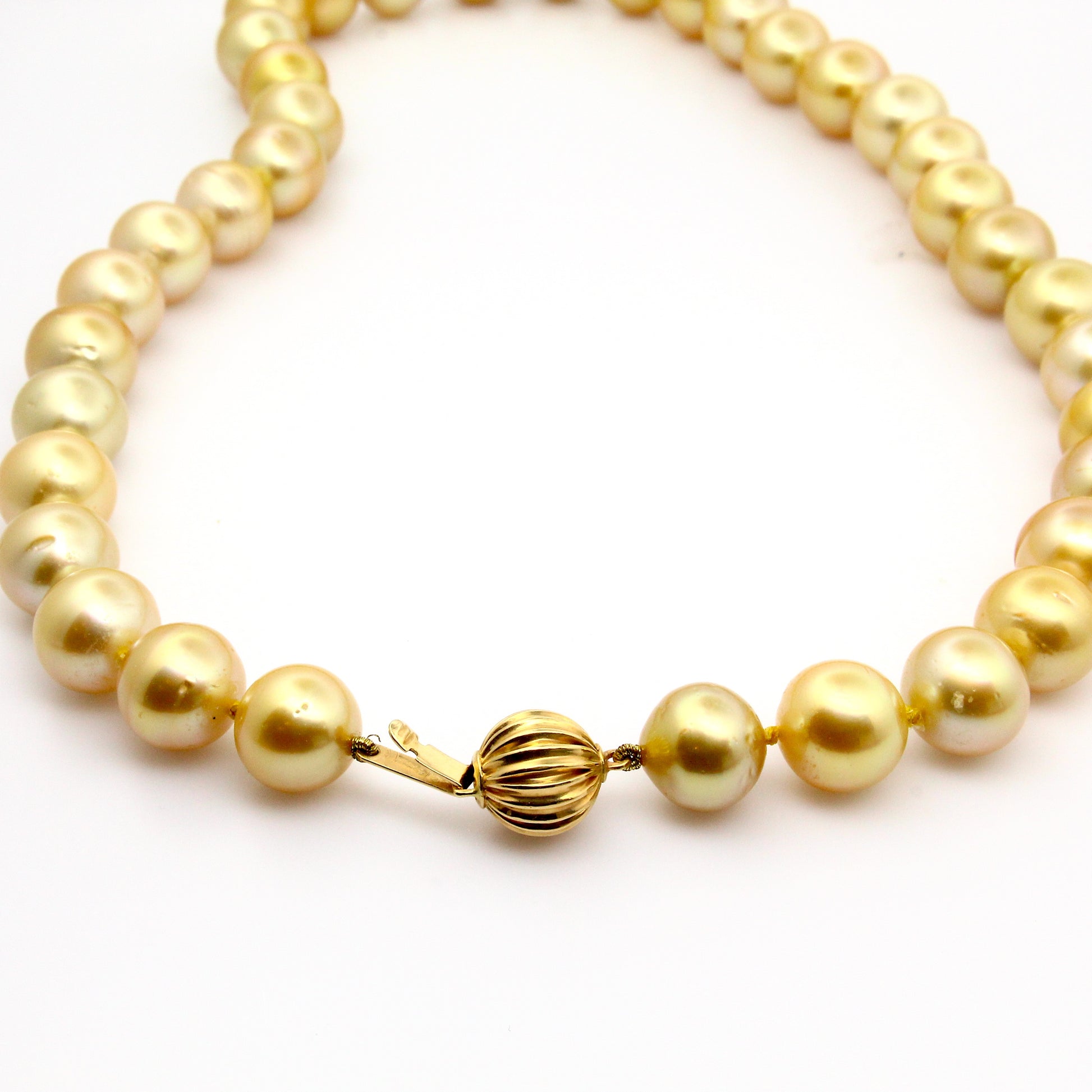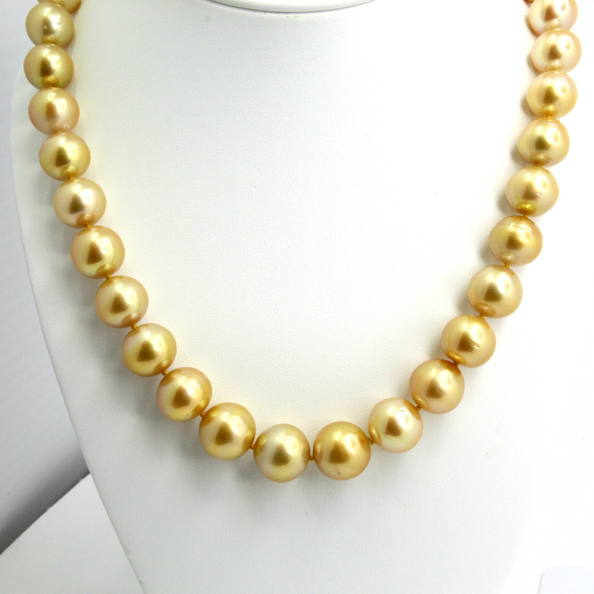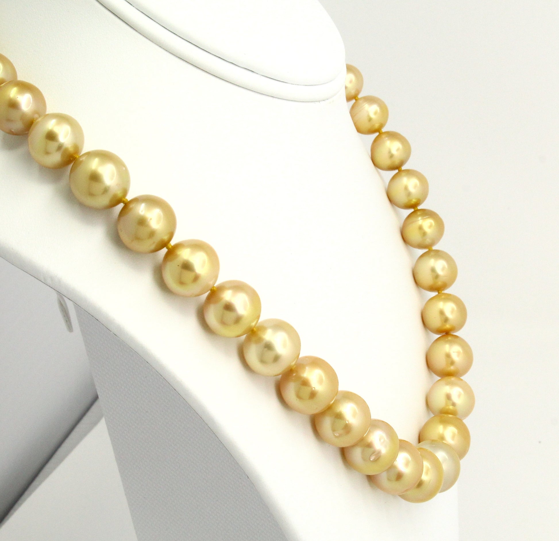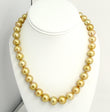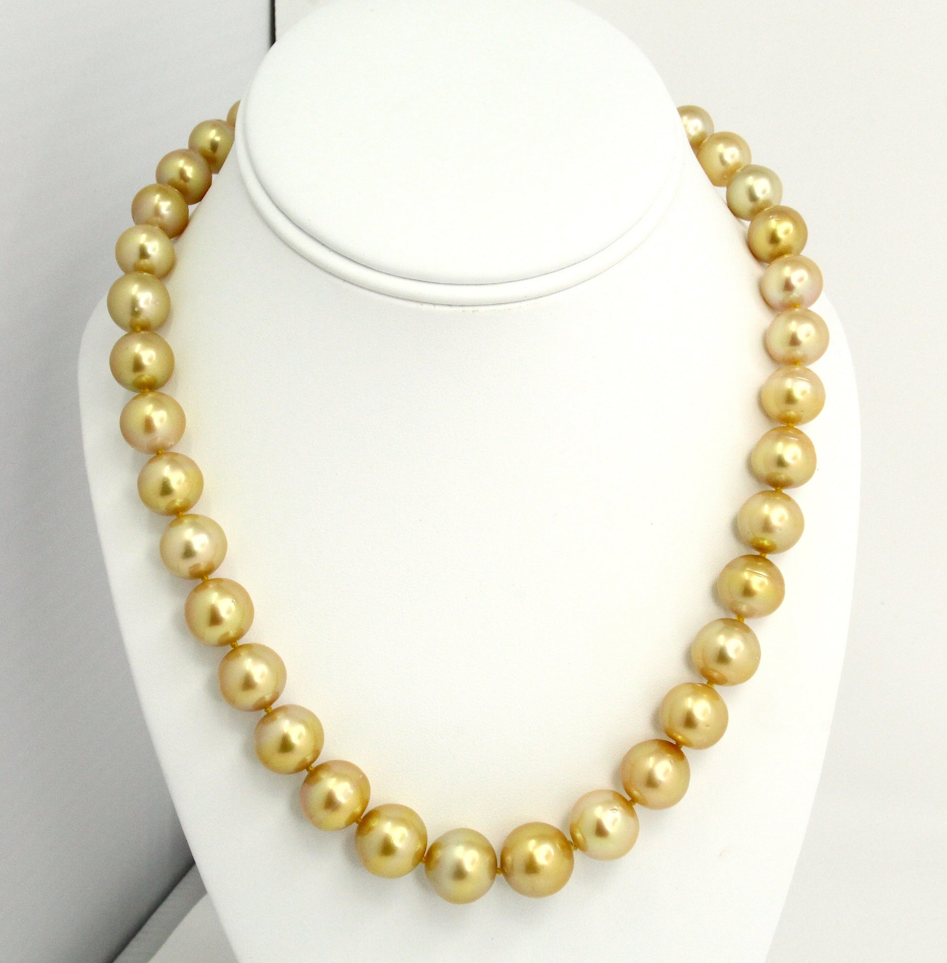 A luxurious South Sea Golden Pearl necklace featuring lustrous pearls ranging from 10.5 mm to 13.5 mm, strung on a 19-inch strand and secured with a 14K yellow gold clasp. The deep golden hue and mirror-like luster of these pearls make this necklace an exceptional statement piece, perfect for collectors and connoisseurs of fine jewelry.