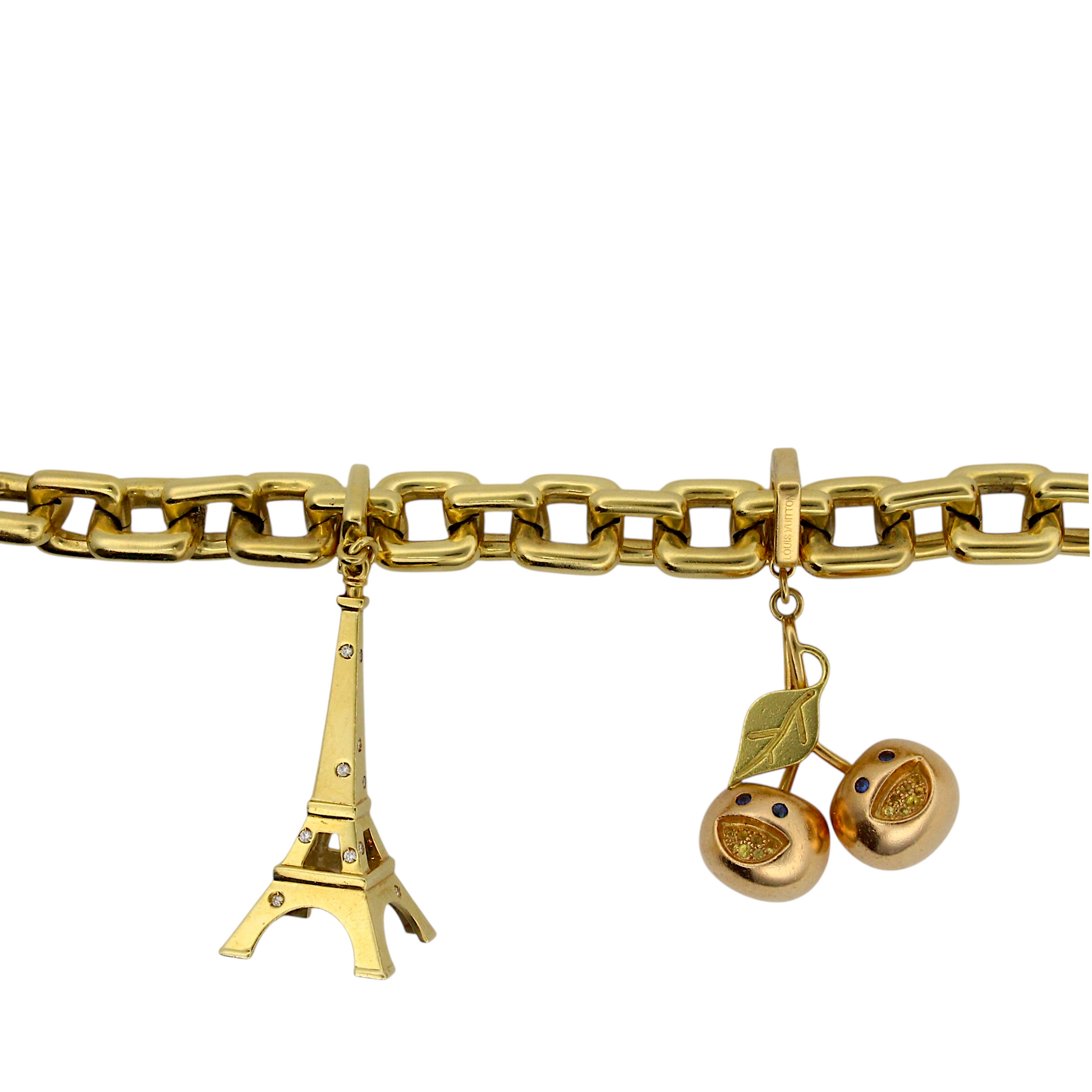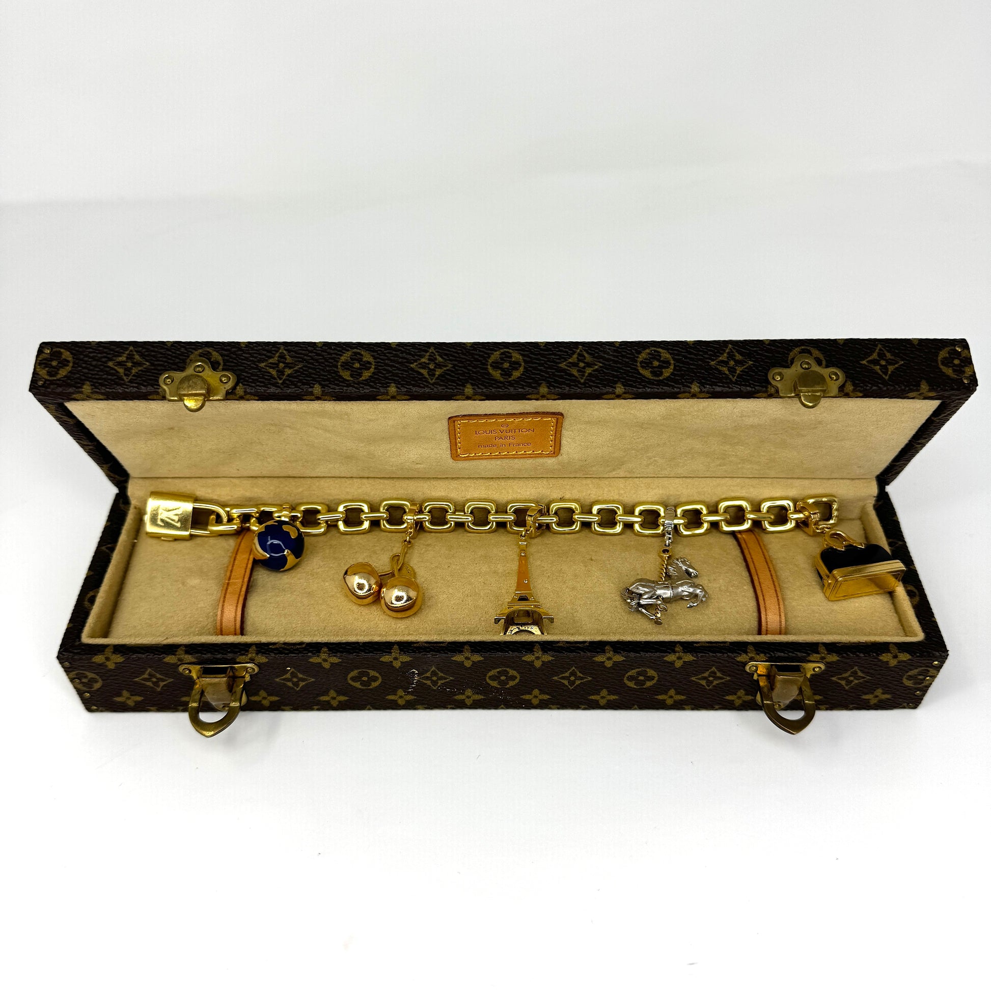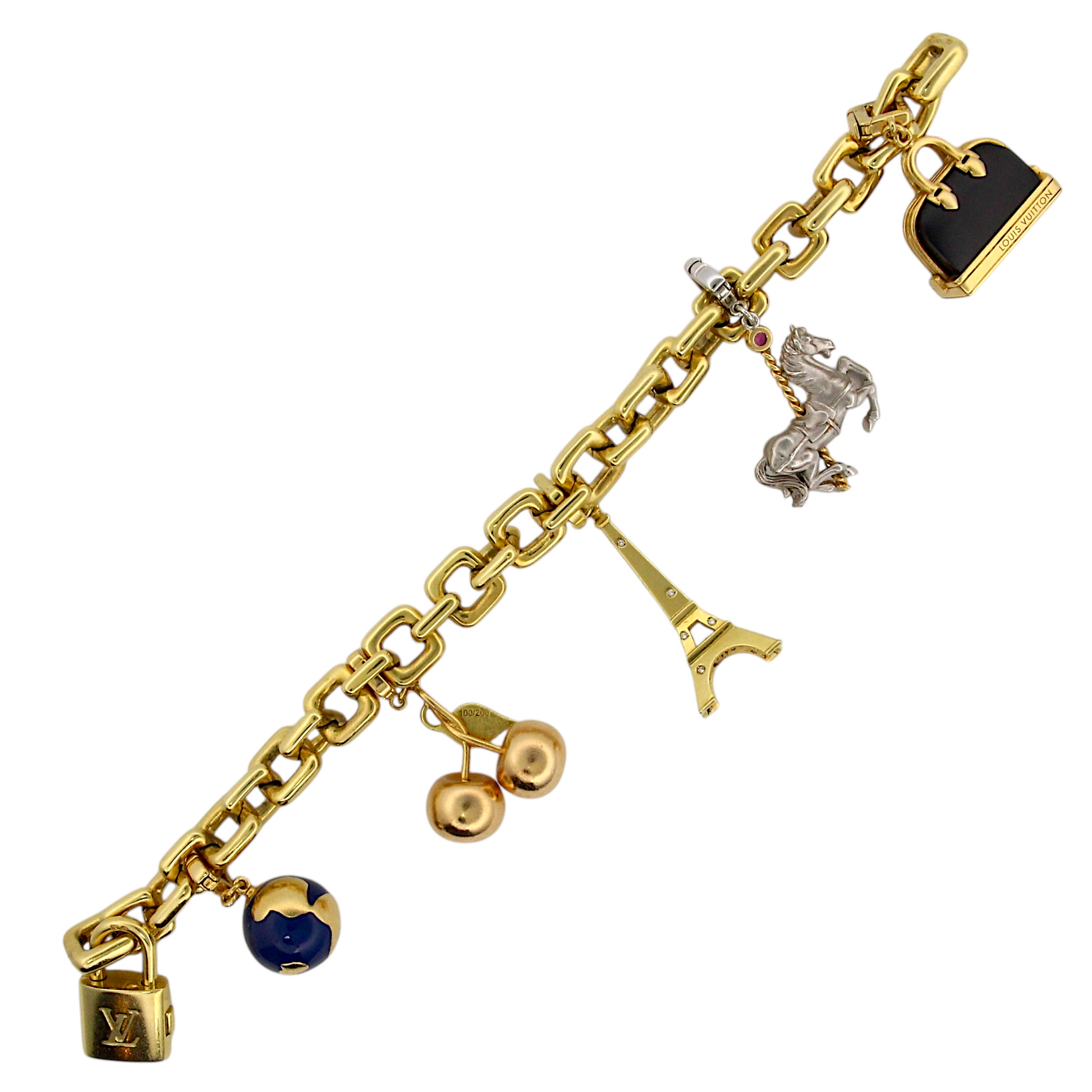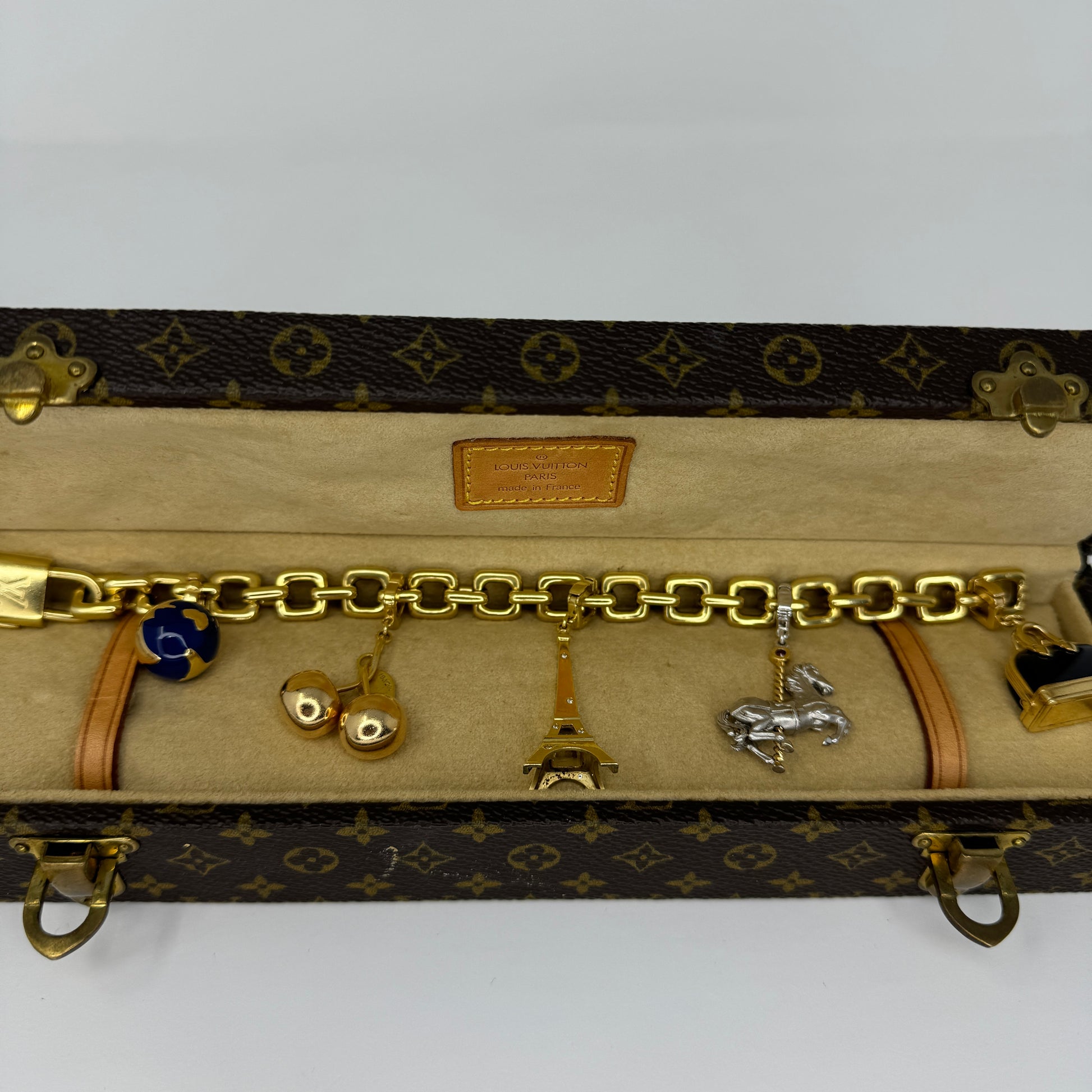 Louis Vuitton 18k Yellow Gold Charm Bracelet Eiffel Tower Horse Bag France Box