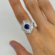 This ring is crafted in 14K white gold and features a vivid natural blue sapphire framed in a striking diamond halo. The sapphire weighs approximately 1.94 carats, measuring approximately 6.4 mm x 6.2 mm, and displays a rich royal-blue hue.