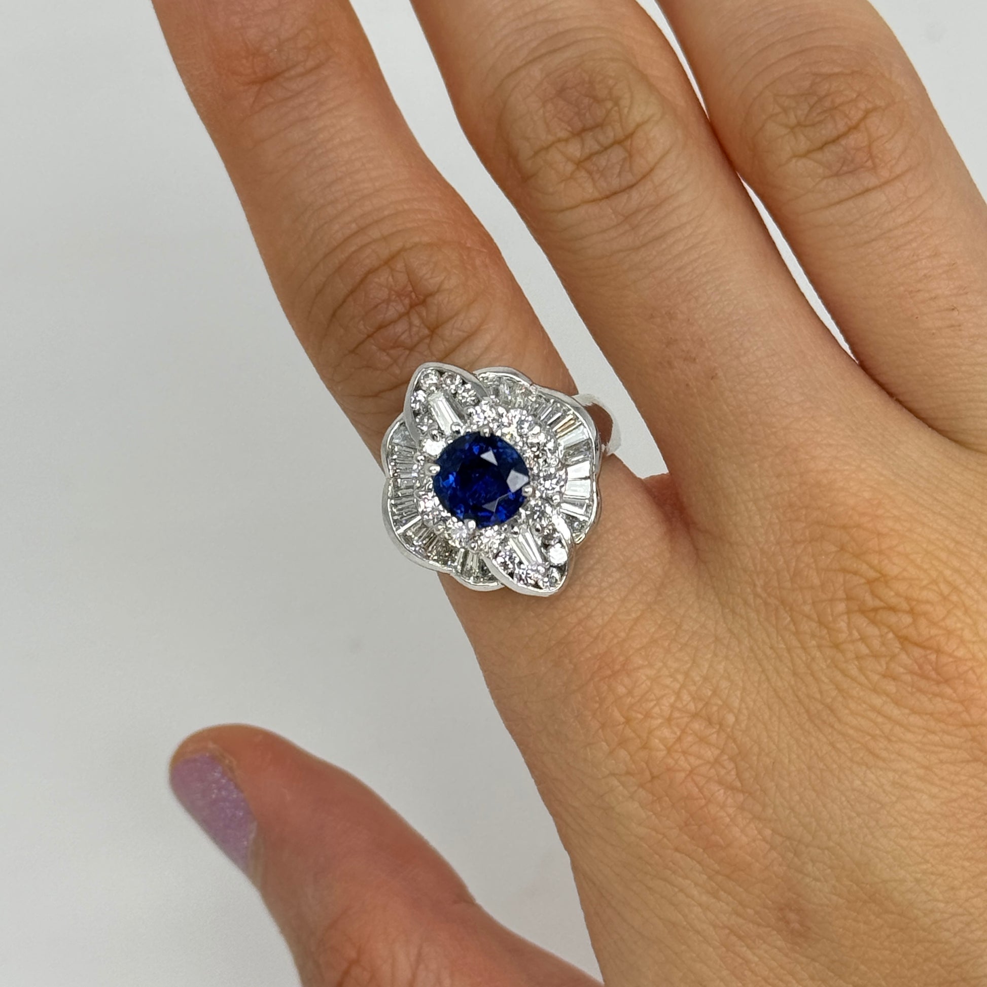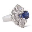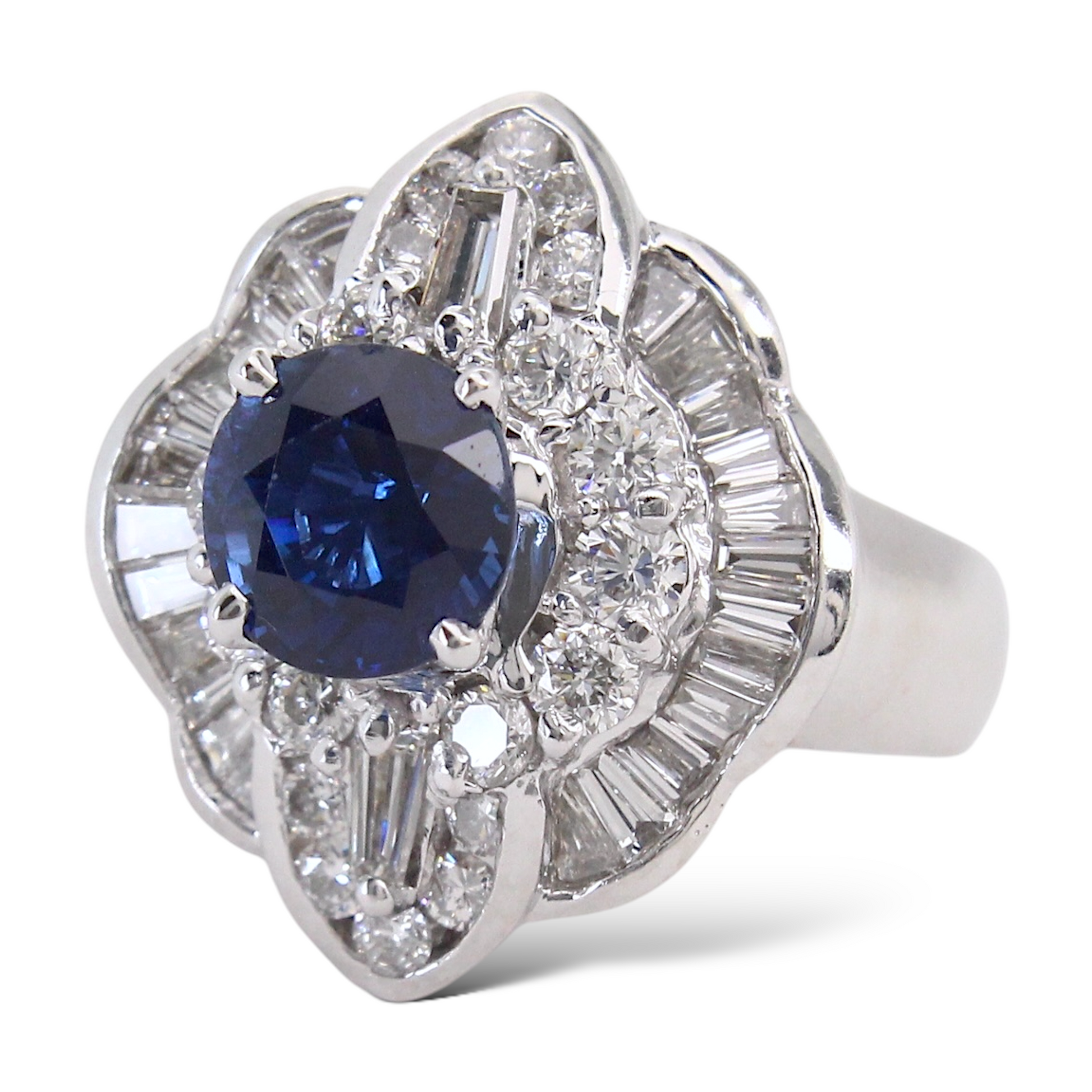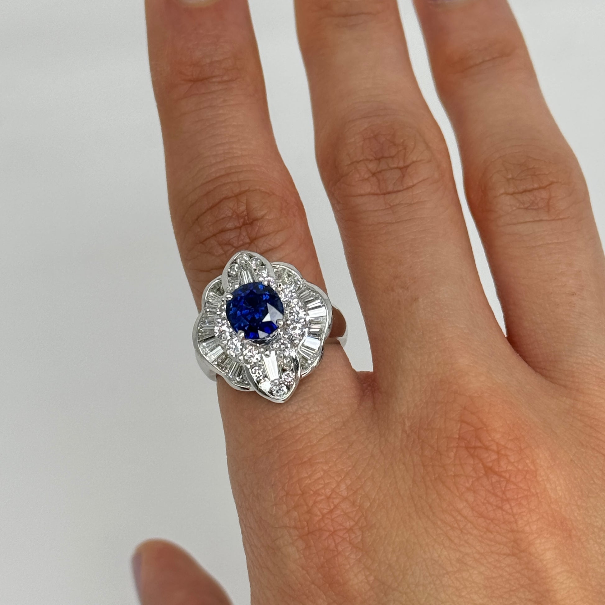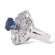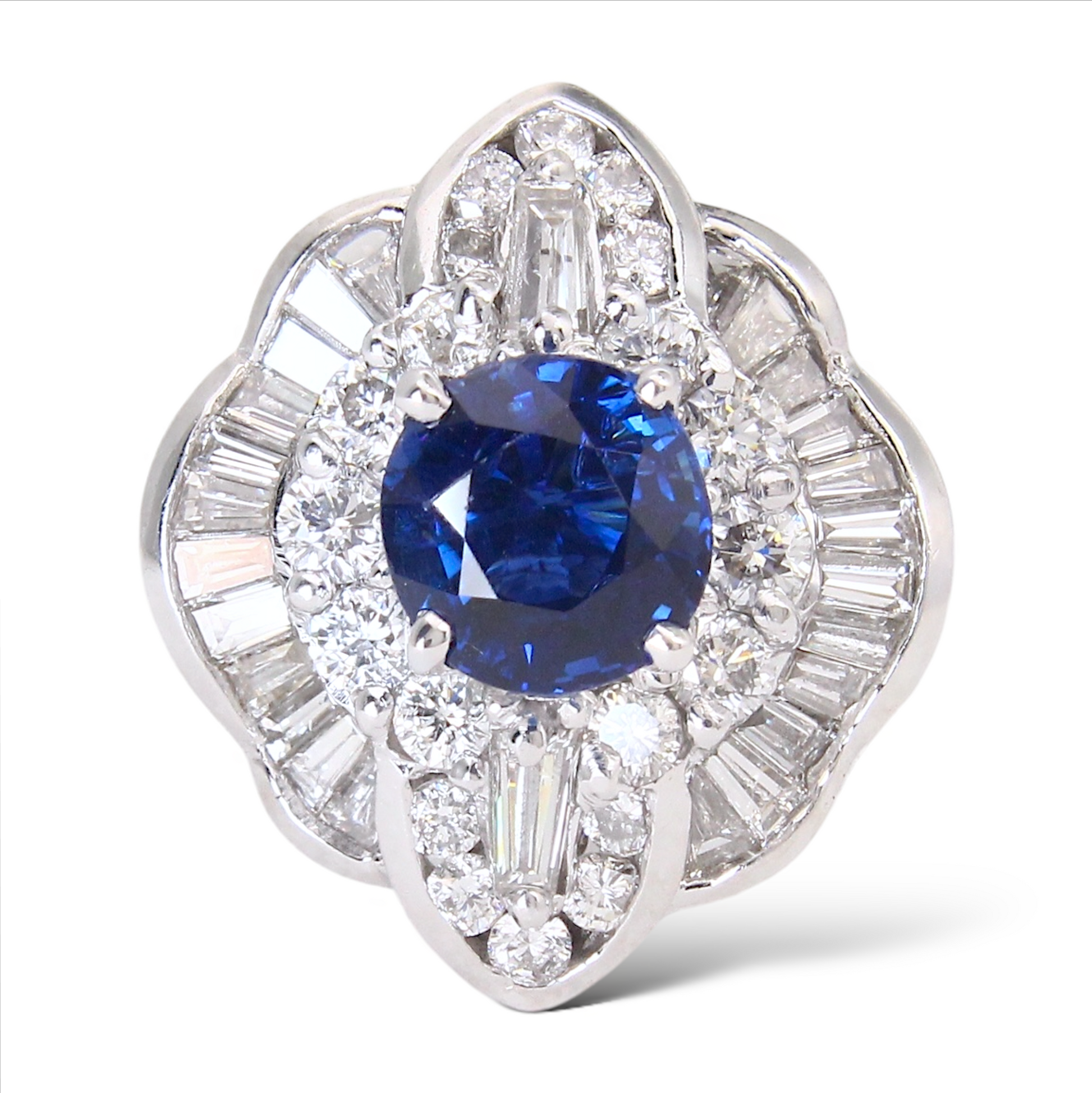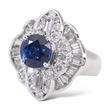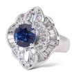 Surrounding the center stone is a dimensional halo made up of both round brilliant-cut and baguette-cut natural earth-mined diamonds. The diamonds total approximately 2.00 carats, offering bright white color and excellent brilliance that enhances the sapphire’s depth of color.