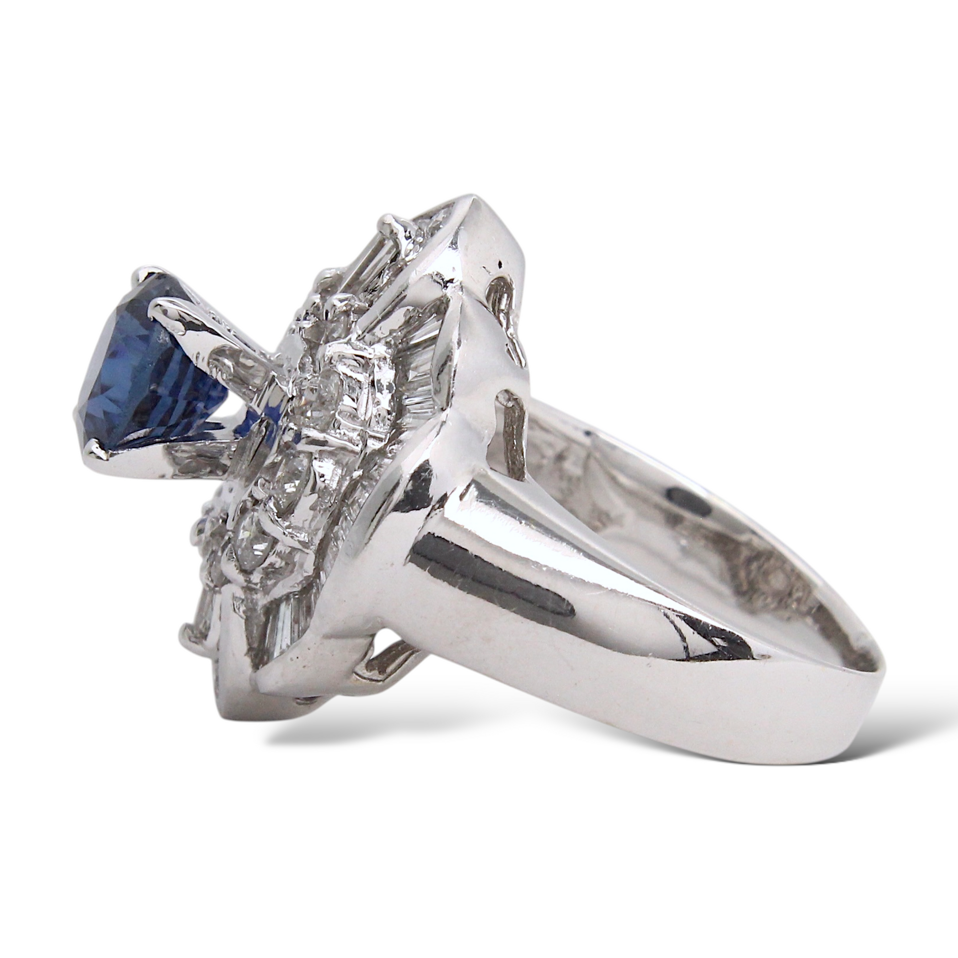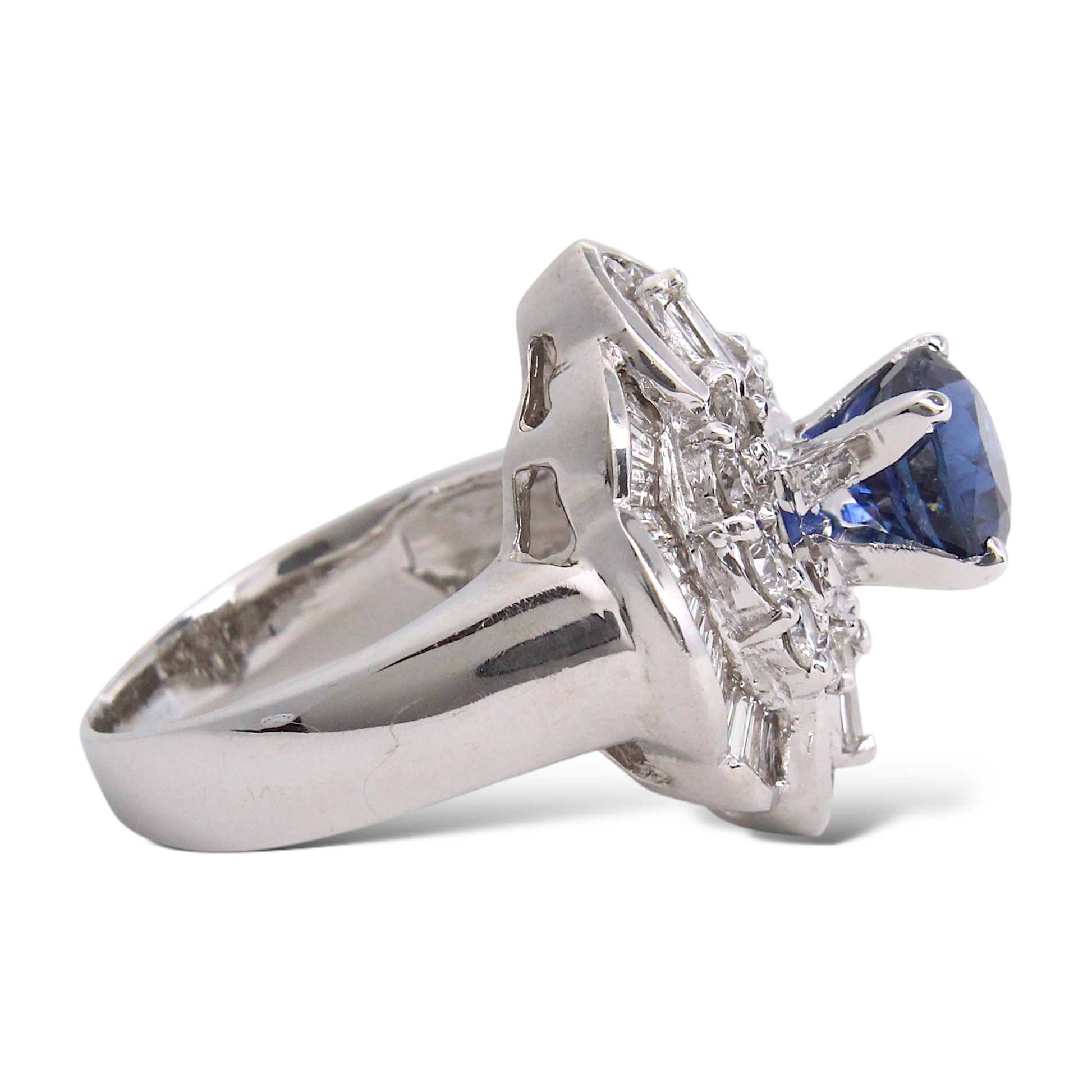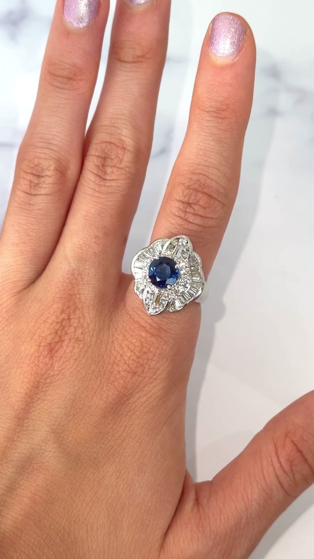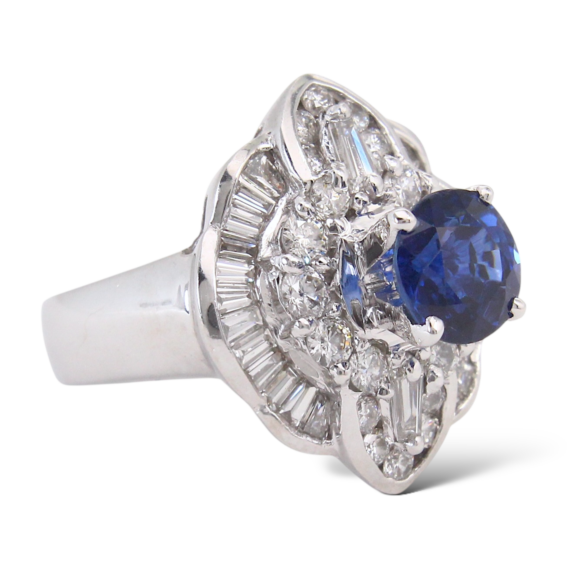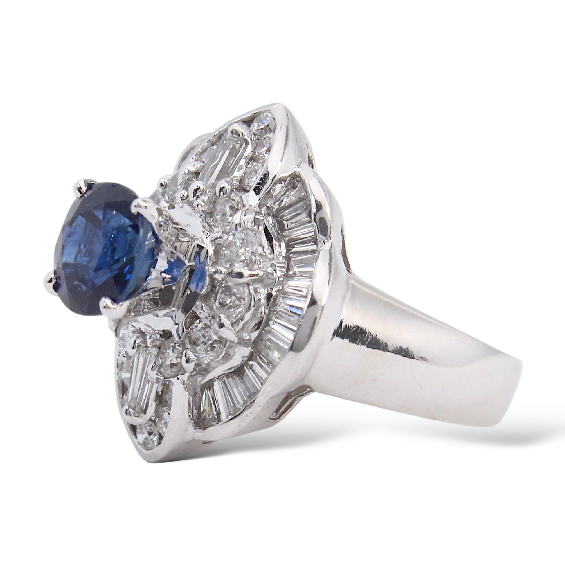 Surrounding the center stone is a dimensional halo made up of both round brilliant-cut and baguette-cut natural earth-mined diamonds. The diamonds total approximately 2.00 carats, offering bright white color and excellent brilliance that enhances the sapphire’s depth of color.