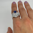 A beautifully styled sapphire and diamond halo ring with excellent presence and timeless design.